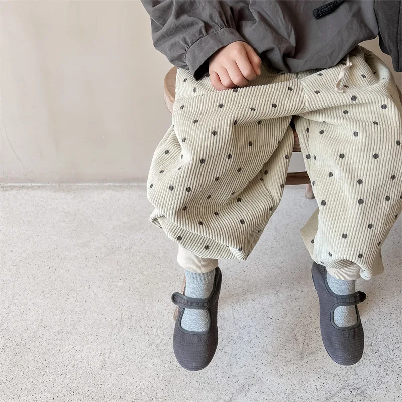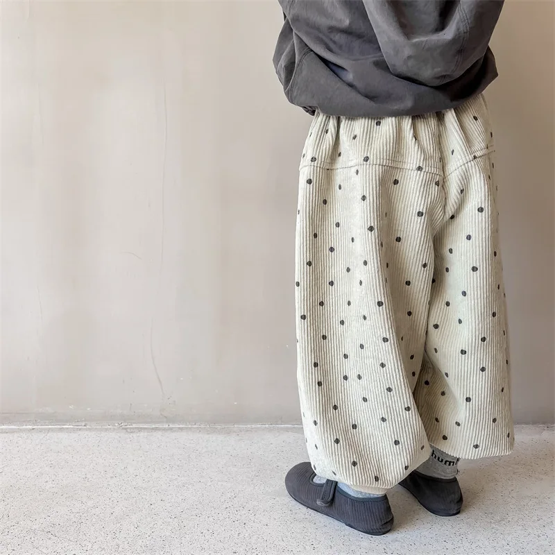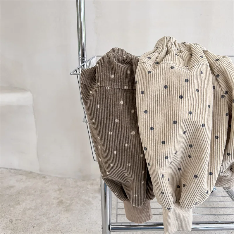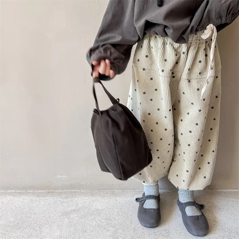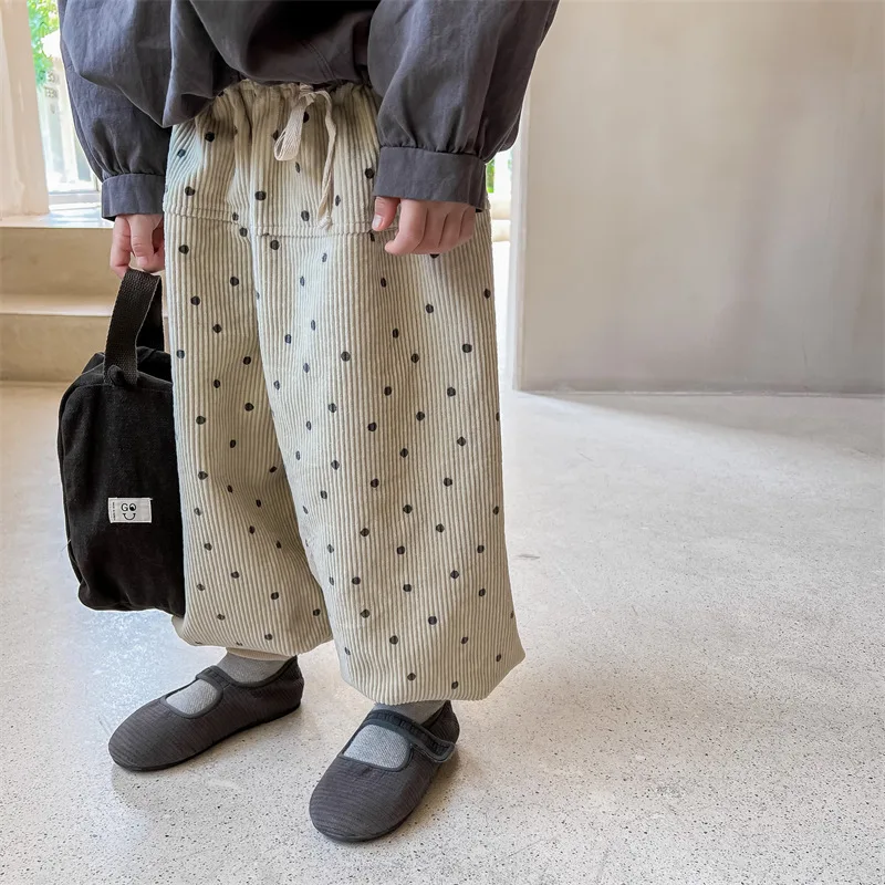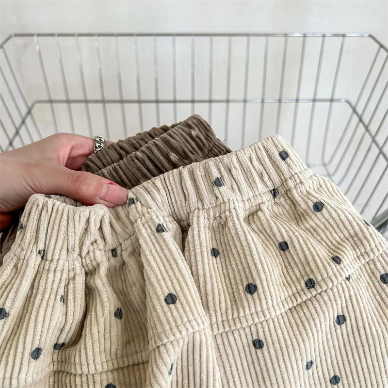 秋のおしゃれなキッズファッションにぴったりの「みずたま コーデュロイ ルーズ パンツ」が新登場!かわいらしい水玉デザインと快適な着心地で、お子様のお洒落な秋コーデを演出します。おしゃれで可愛いデザインが魅力のパンツです。