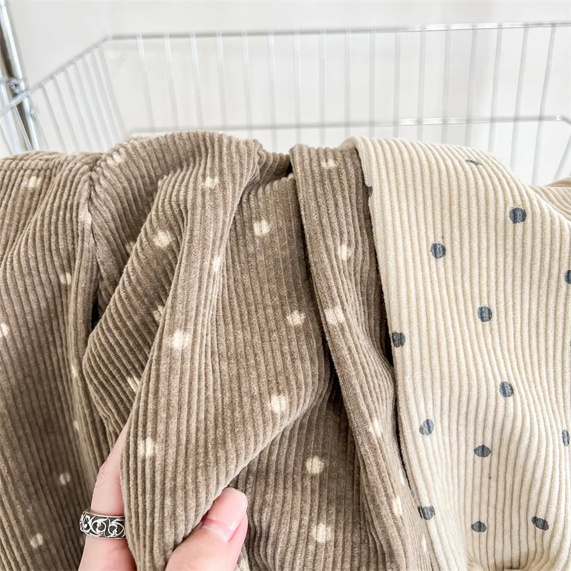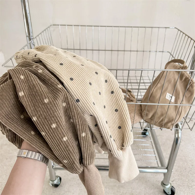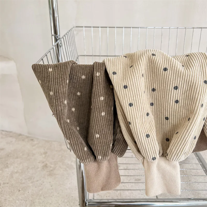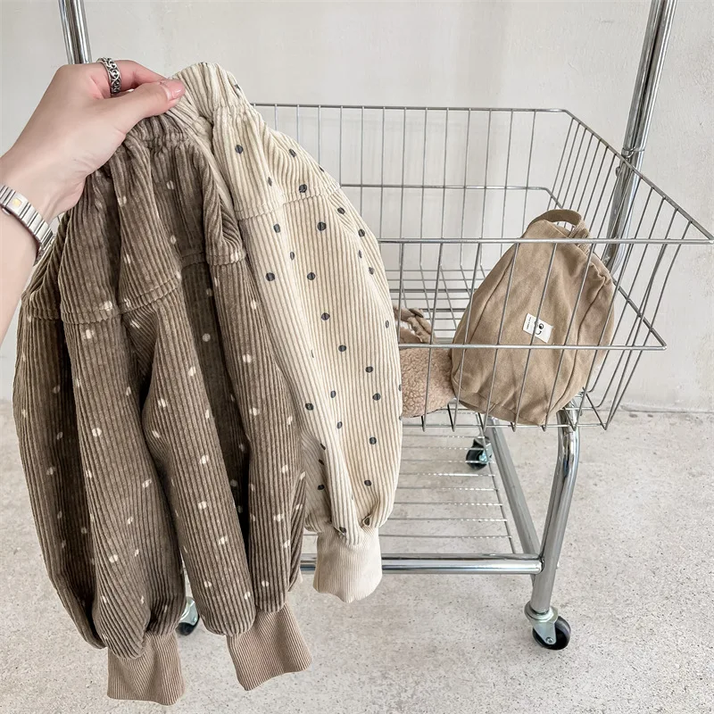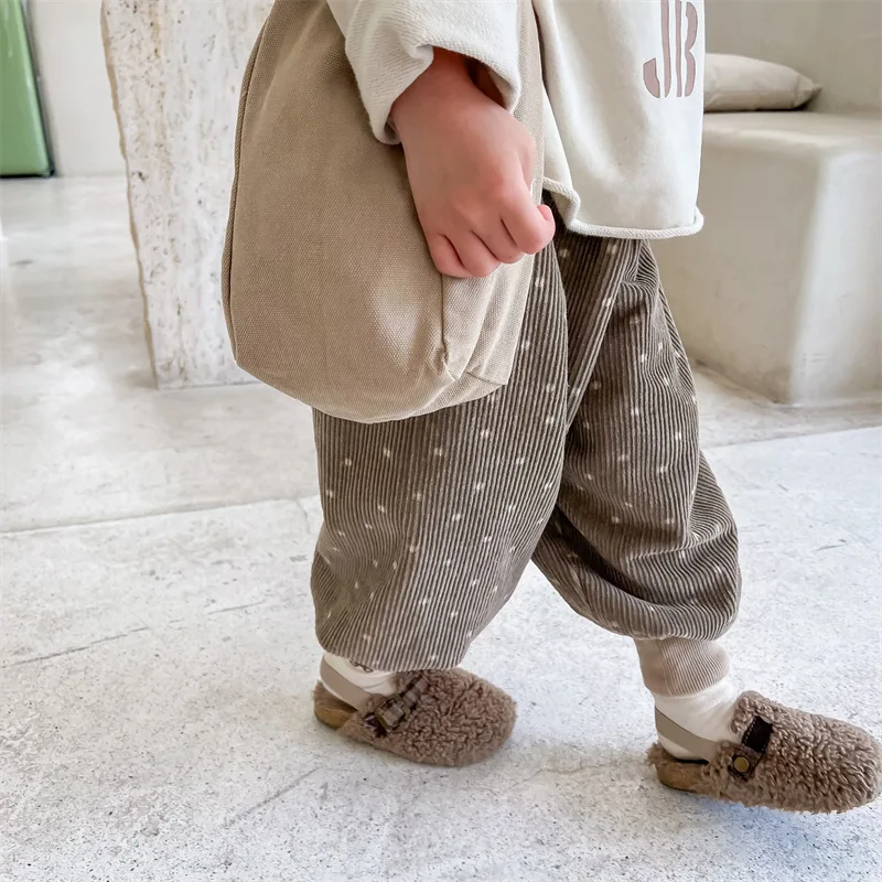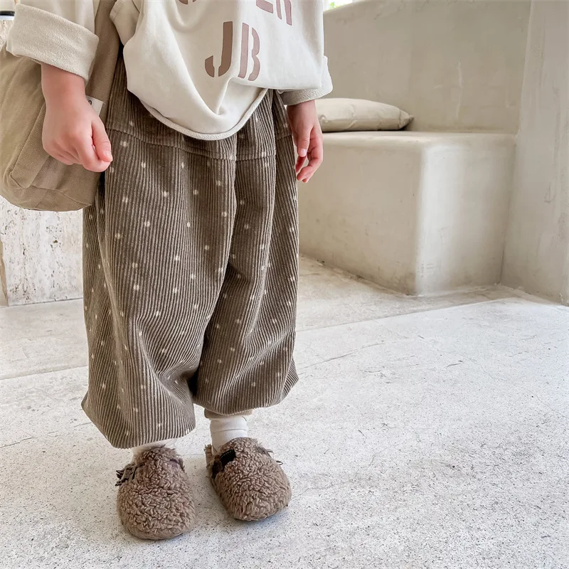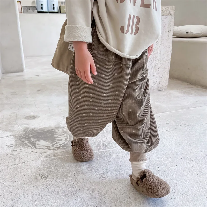 秋のおしゃれなキッズファッションにぴったりの「みずたま コーデュロイ ルーズ パンツ」が新登場!かわいらしい水玉デザインと快適な着心地で、お子様のお洒落な秋コーデを演出します。おしゃれで可愛いデザインが魅力のパンツです。