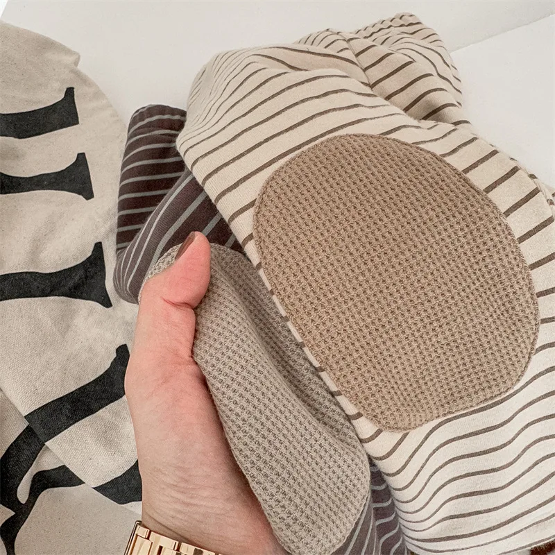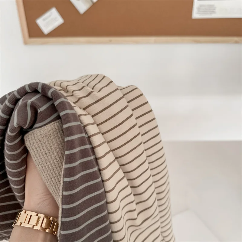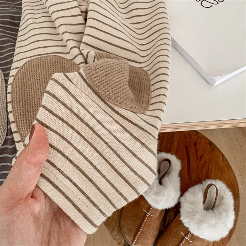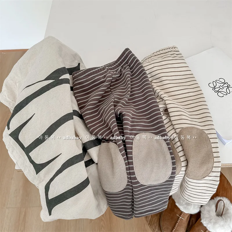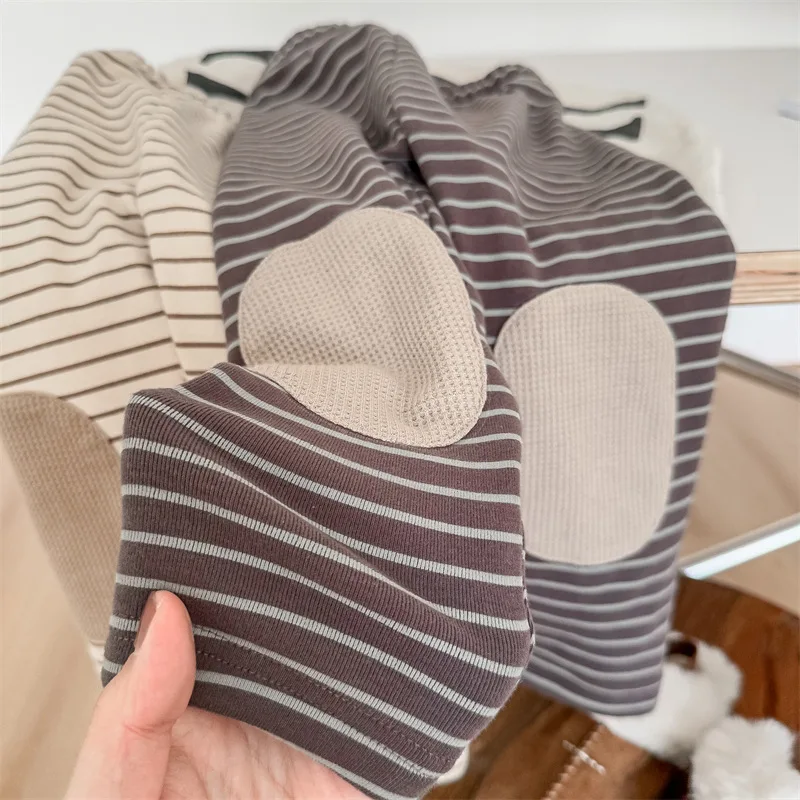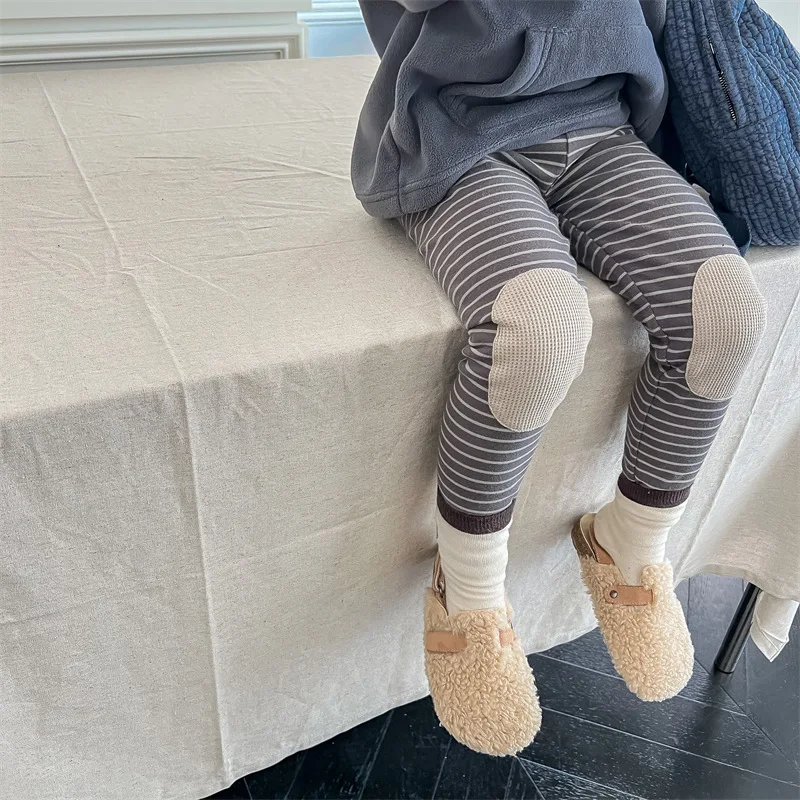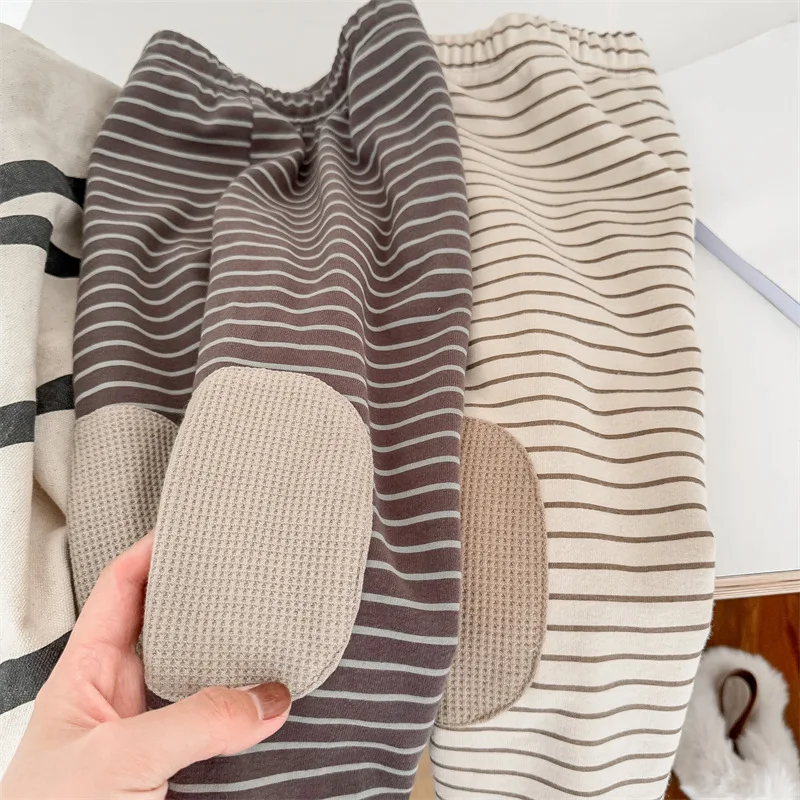 カジュアルなボーダーデザインが、おしゃれさを演出。お子様のスタイリッシュな一日をサポートします。さらに、丈夫な膝パッチが付いているため、お子様が元気いっぱいに遊んでも安心です。