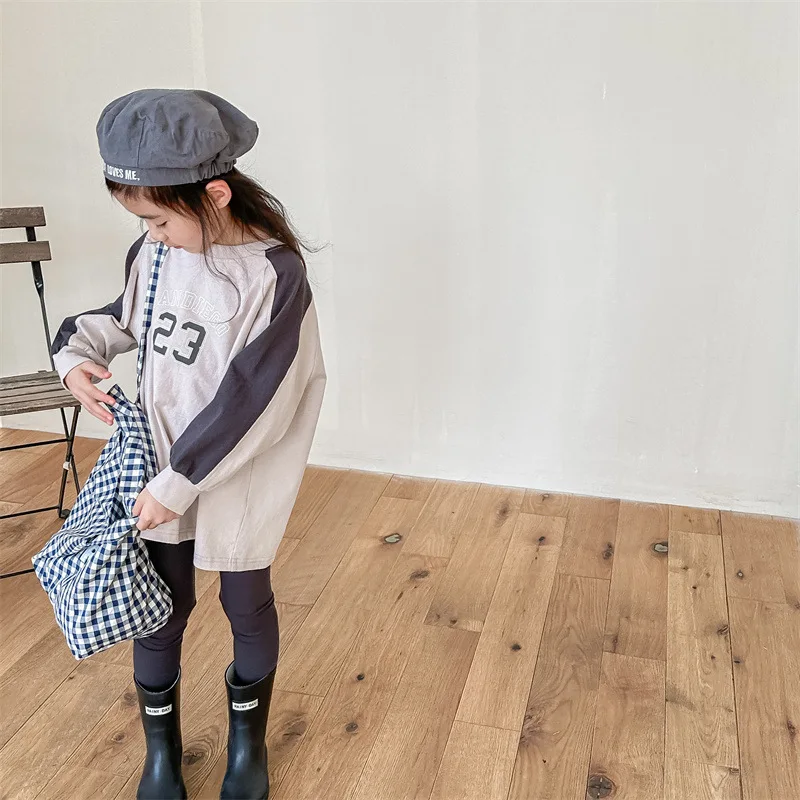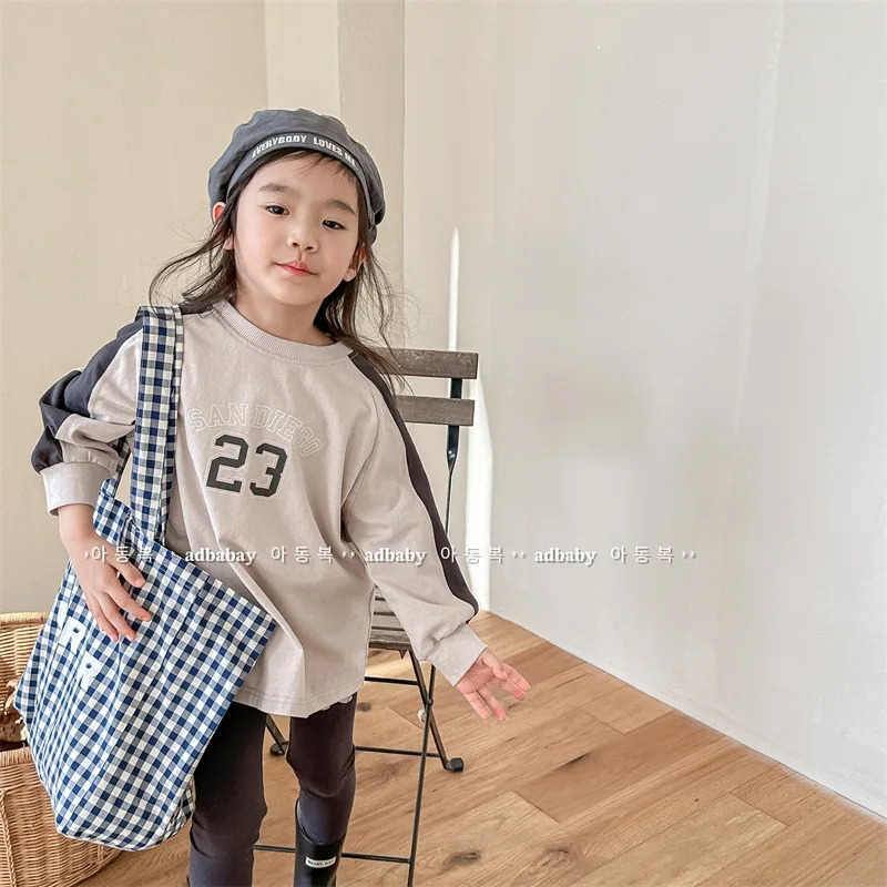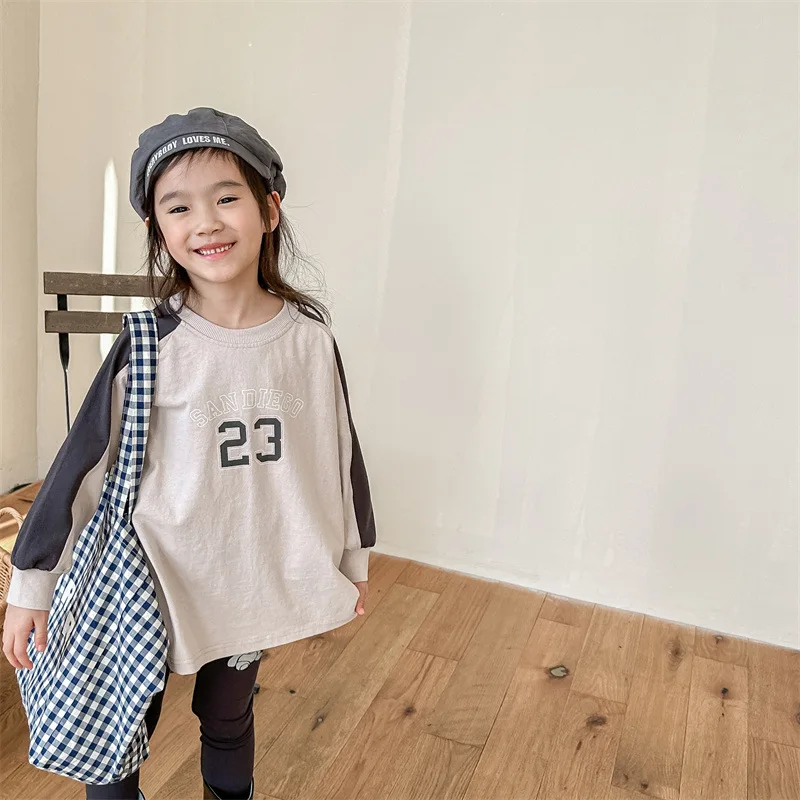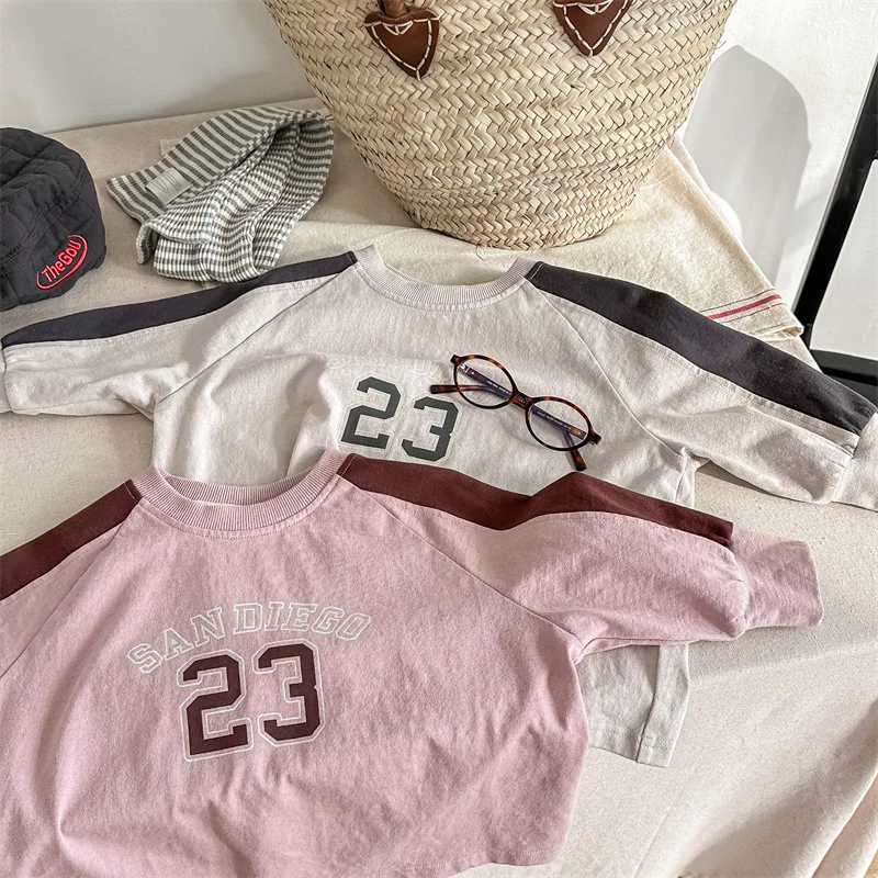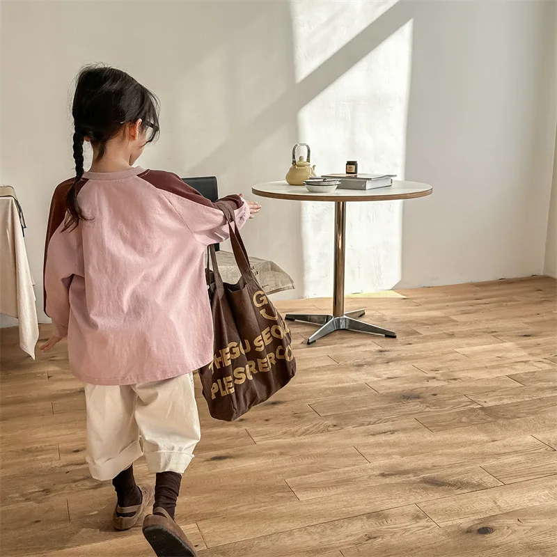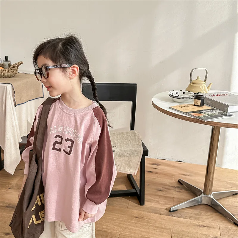 キッズトップス 長袖Tシャツ パッチワーク ラグランスリーブ アプリコット/ピンク/2カラー