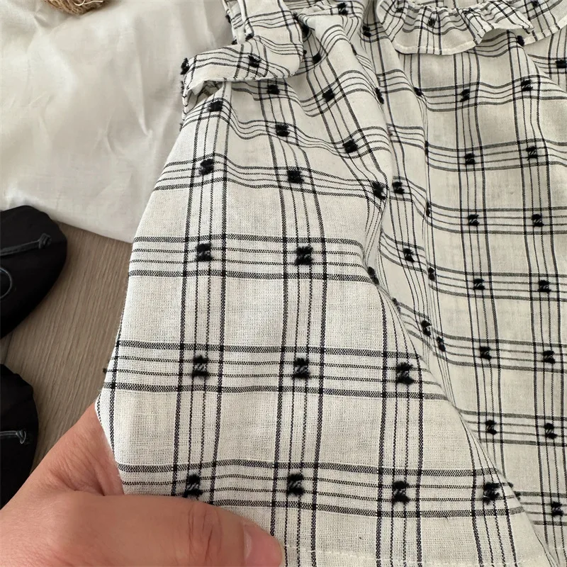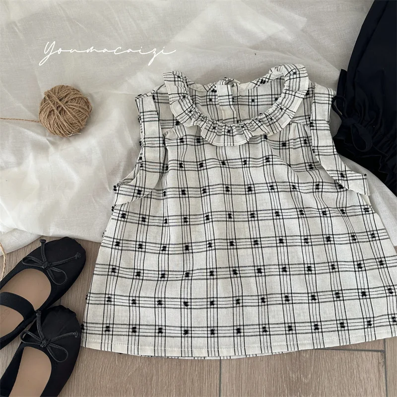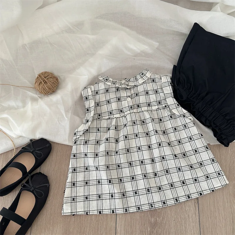 この夏、キュートなチェック柄トップスが登場しました!フリル襟が愛らしいノースリーブブラウスは、おしゃれなプレーン柄でお子様のスタイルを華やかに演出します。涼しい素材で、活発なお子様にもぴったり。キュートなカジュアルスタイルをお求めの方におすすめです!夏のおしゃれを楽しむ、ベビースタイルの一枚です!