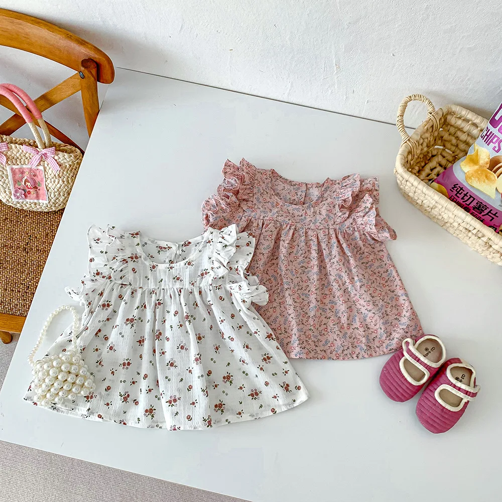 ベビートップス バタフライスリーブ フリル ノースリーブチュニックブラウス フラワー花柄プリント 2カラー