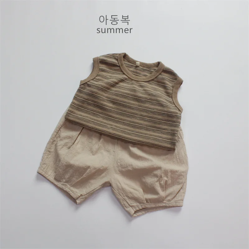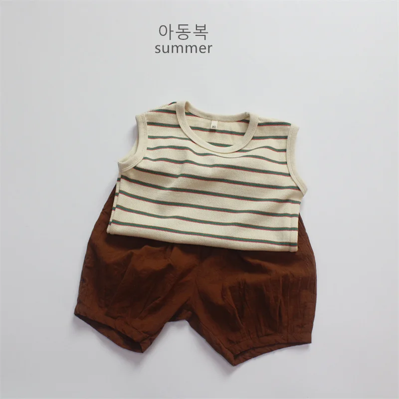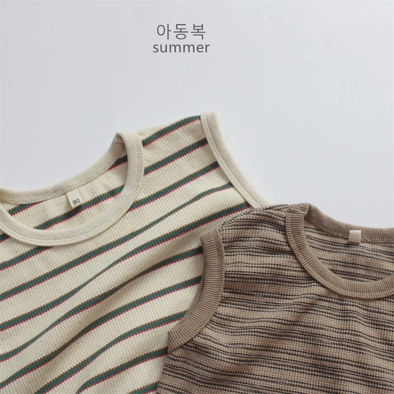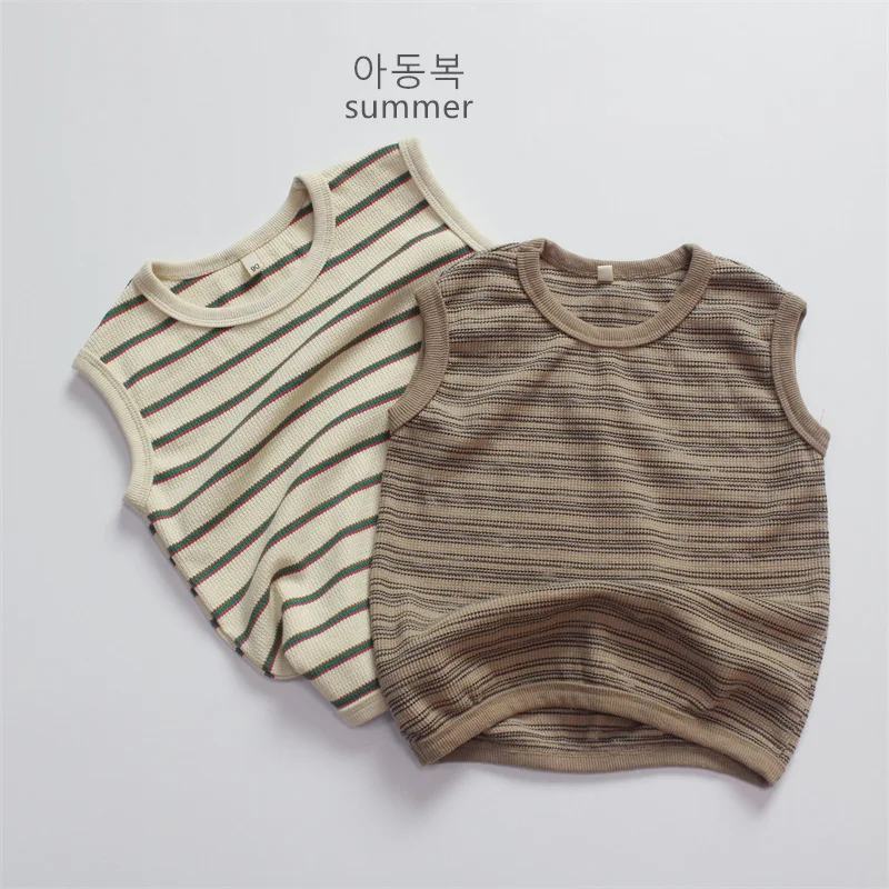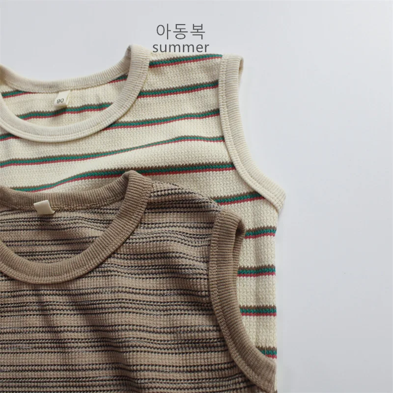 子供たちに素敵なスタイリッシュな衣装を提供します。このユニセックスのキッズ ボーダー タンクトップ ノースリーブ Tシャツは、ベージュもしくはコーヒーブラウンのストライプ柄が付いていて快適な着心地が味わえます。スタイリッシュなデザインは、活動的な子どもたちのために完璧な衣装です。
