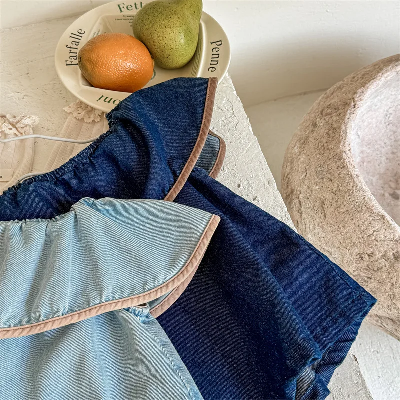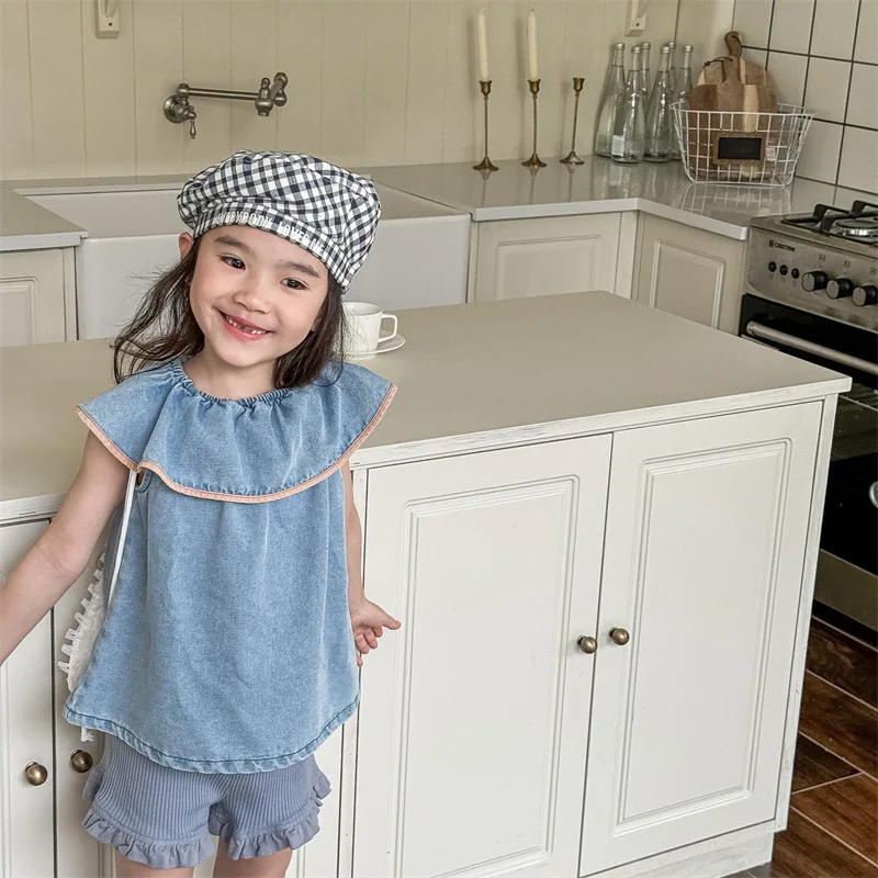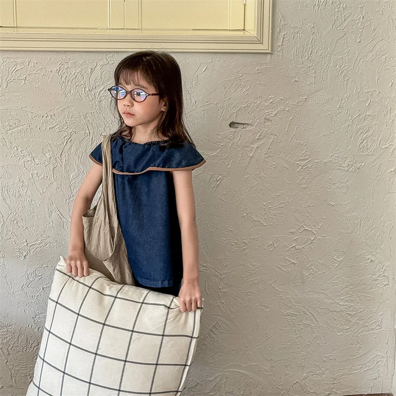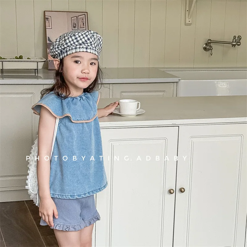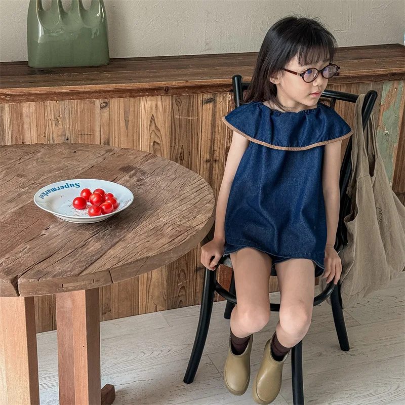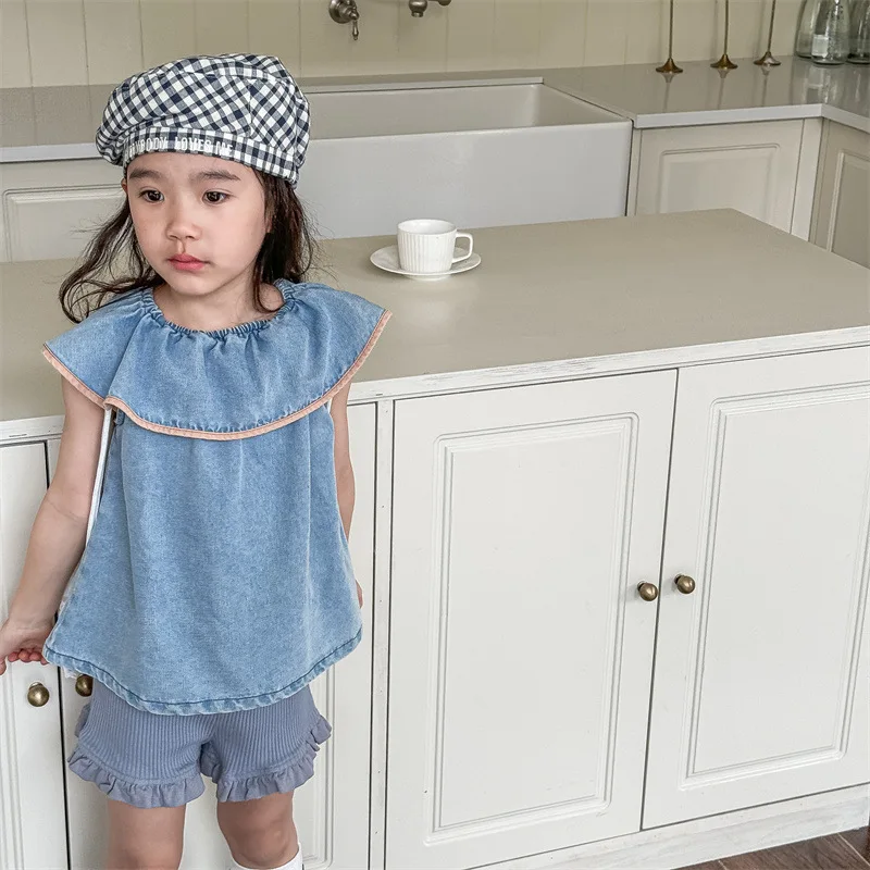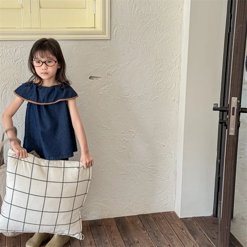 キッズトップス デニム ビッグサークル襟 ノースリーブブラウス 2カラー【mh0005437】