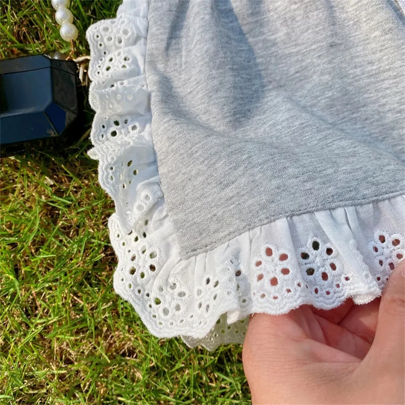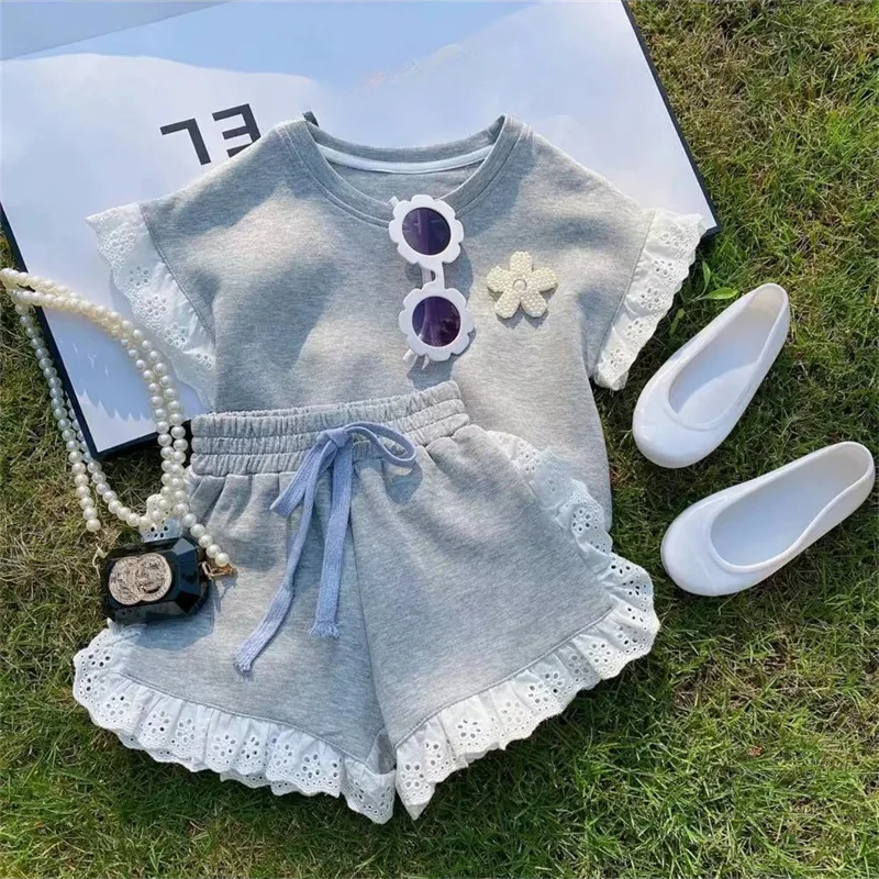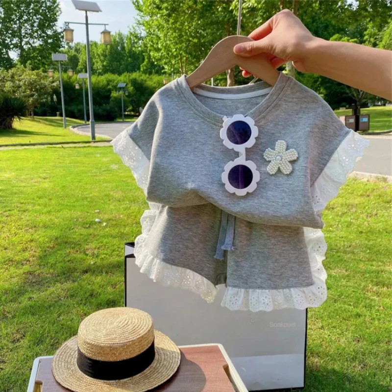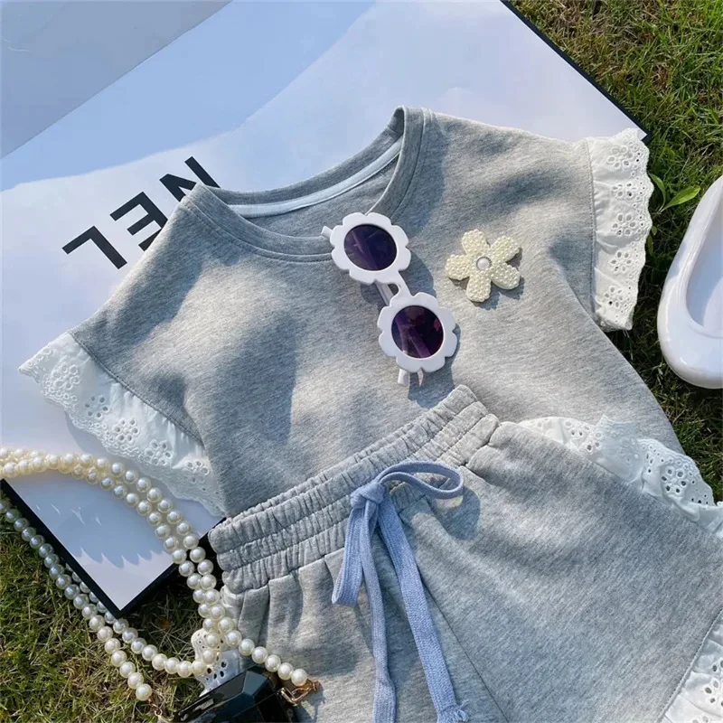 キッズセットアップ 2点セット レースフリル 半袖Tシャツ+ショートパンツ グレー【mh0006116】