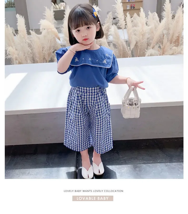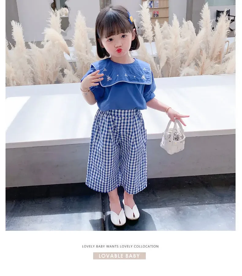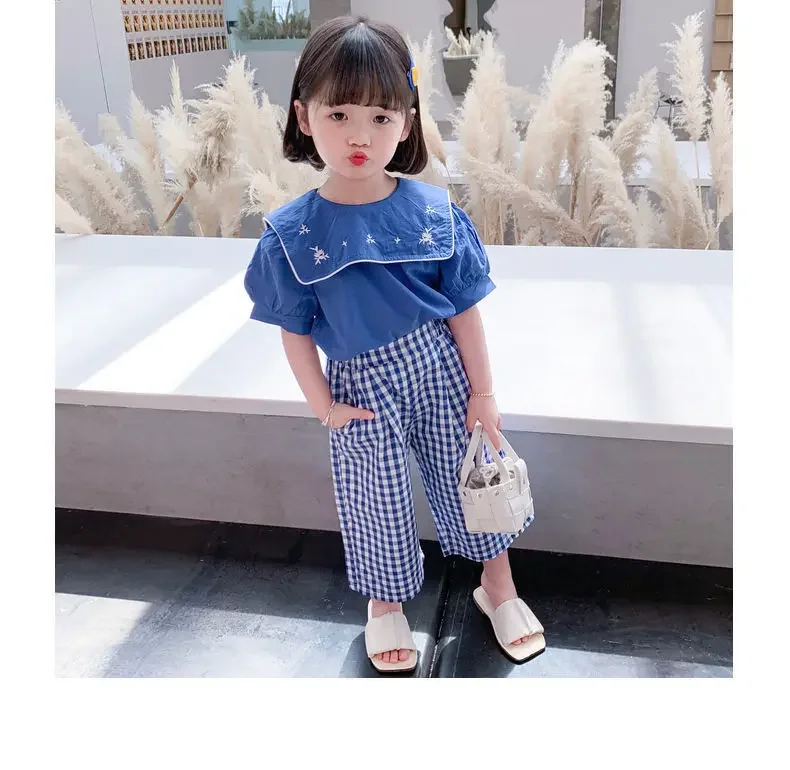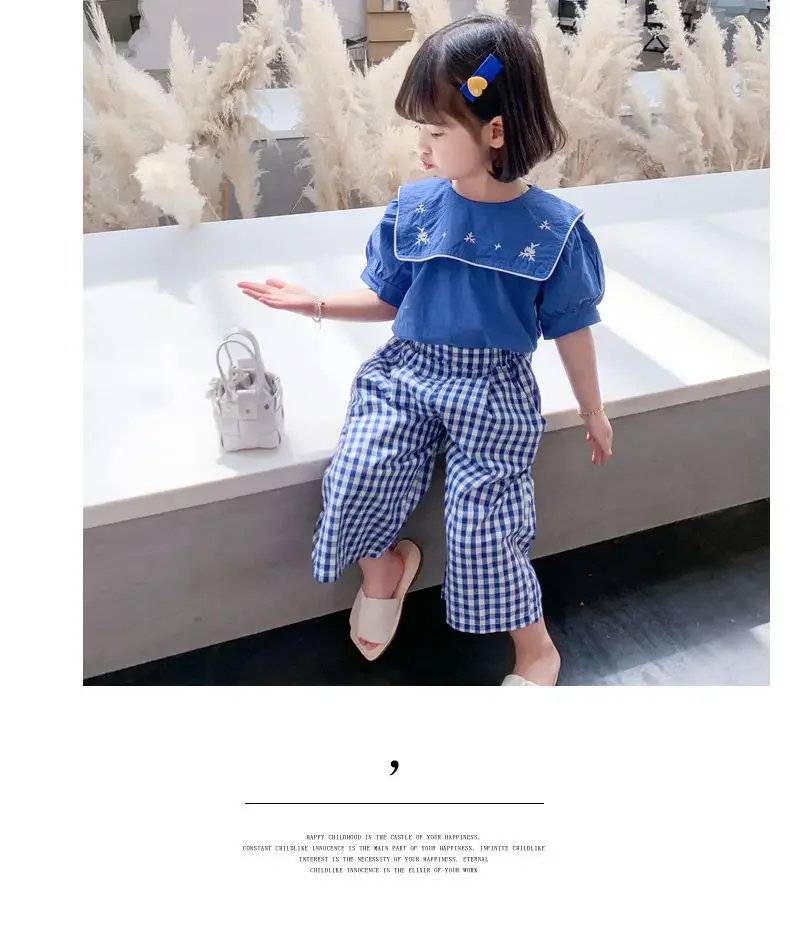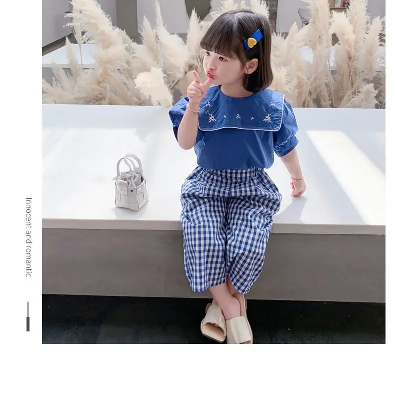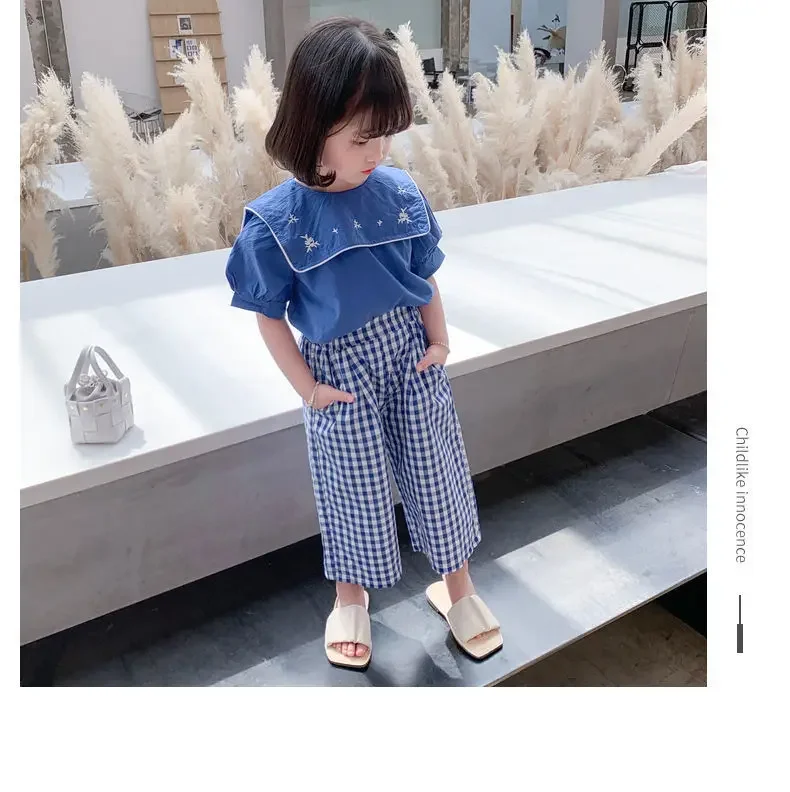 キッズセットアップ 2点セット 半袖刺繍襟ブラウス+チェックワイドルーズパンツ 2カラー【mh0006133】