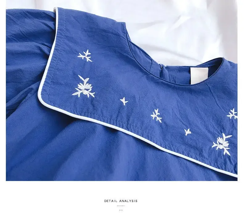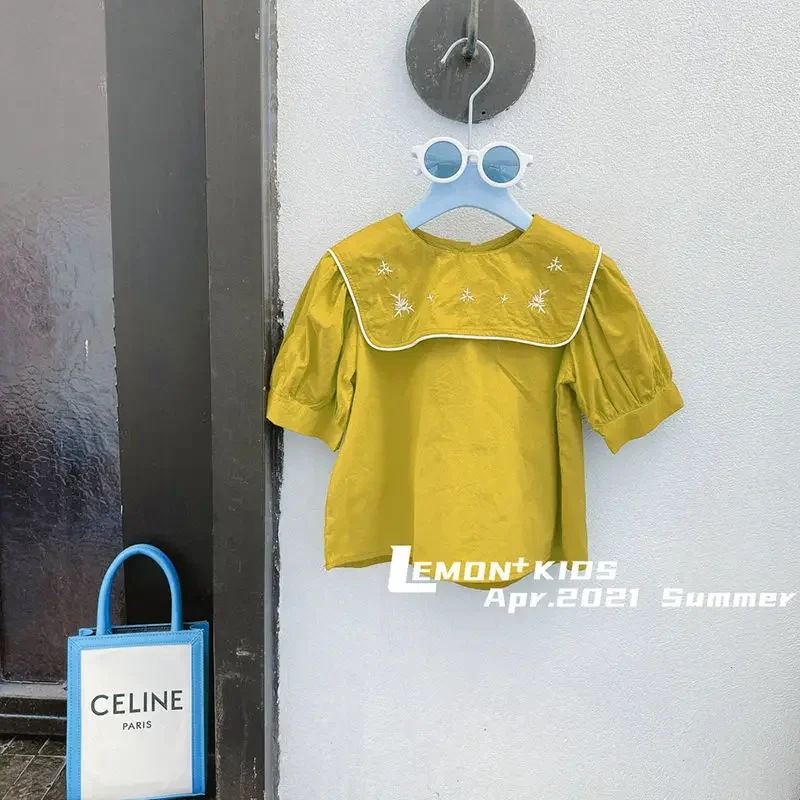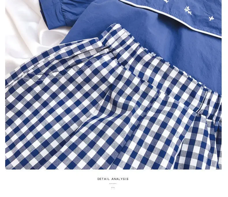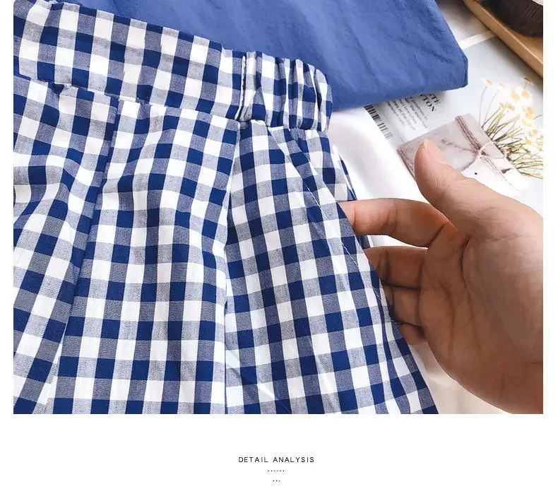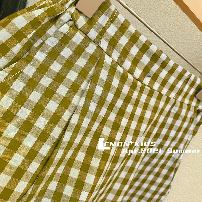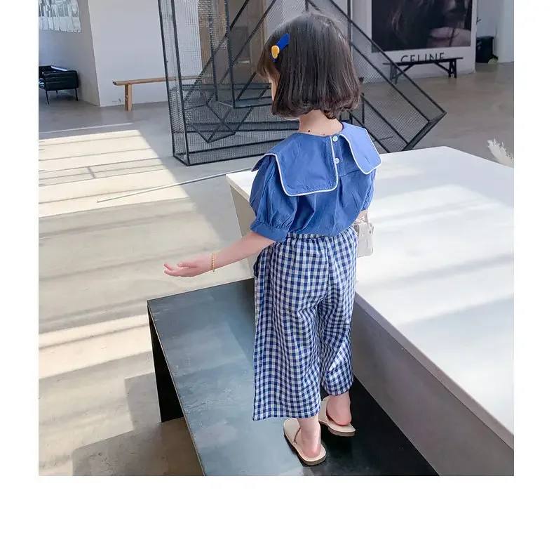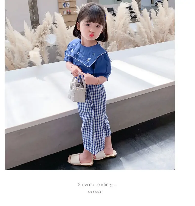 キッズセットアップ 2点セット 半袖刺繍襟ブラウス+チェックワイドルーズパンツ 2カラー【mh0006133】