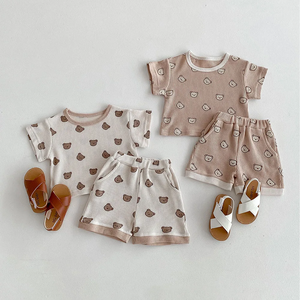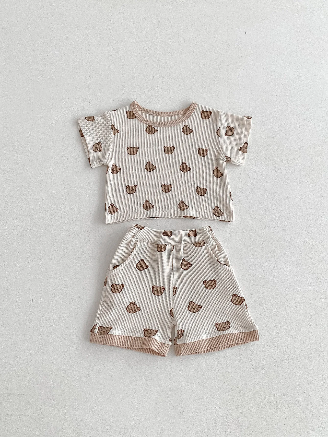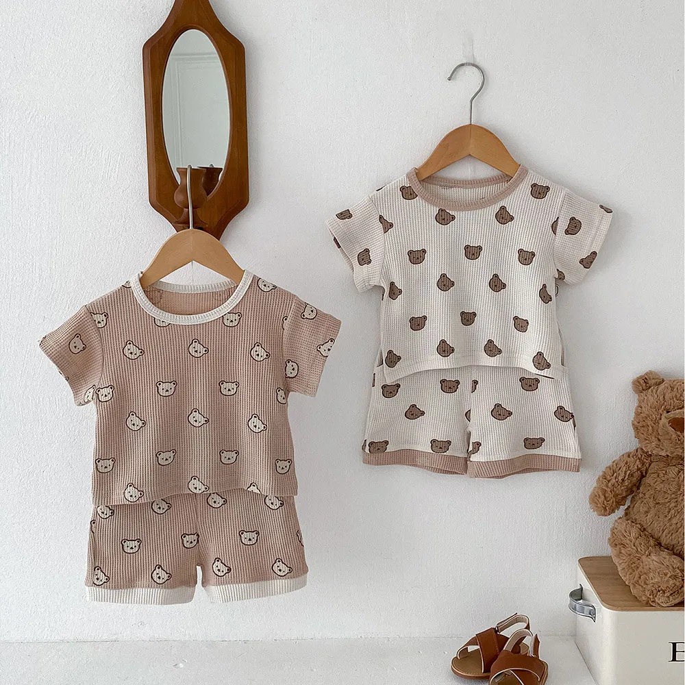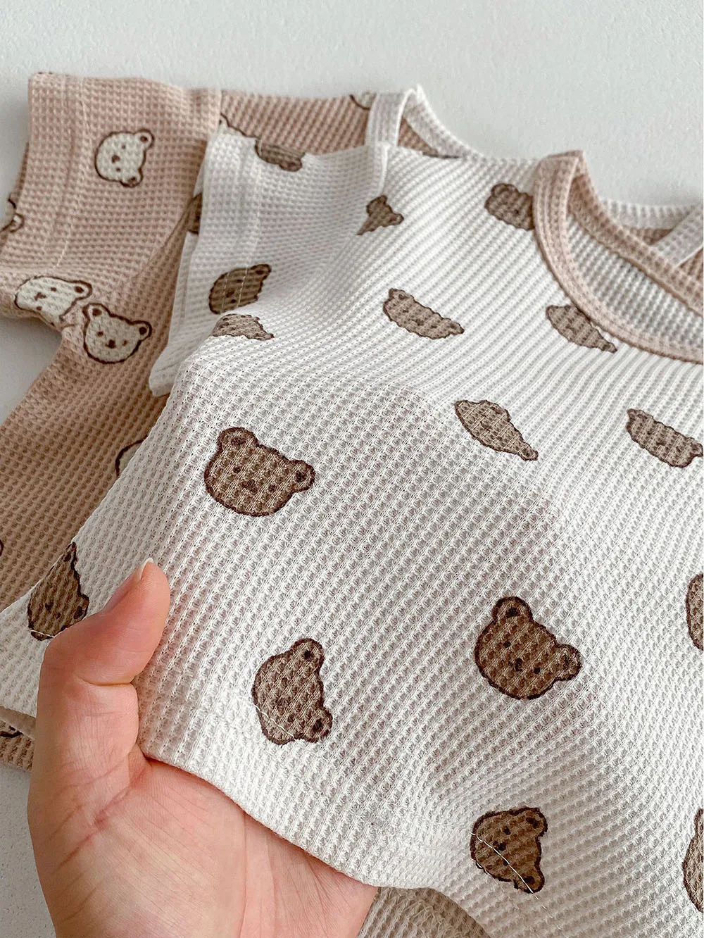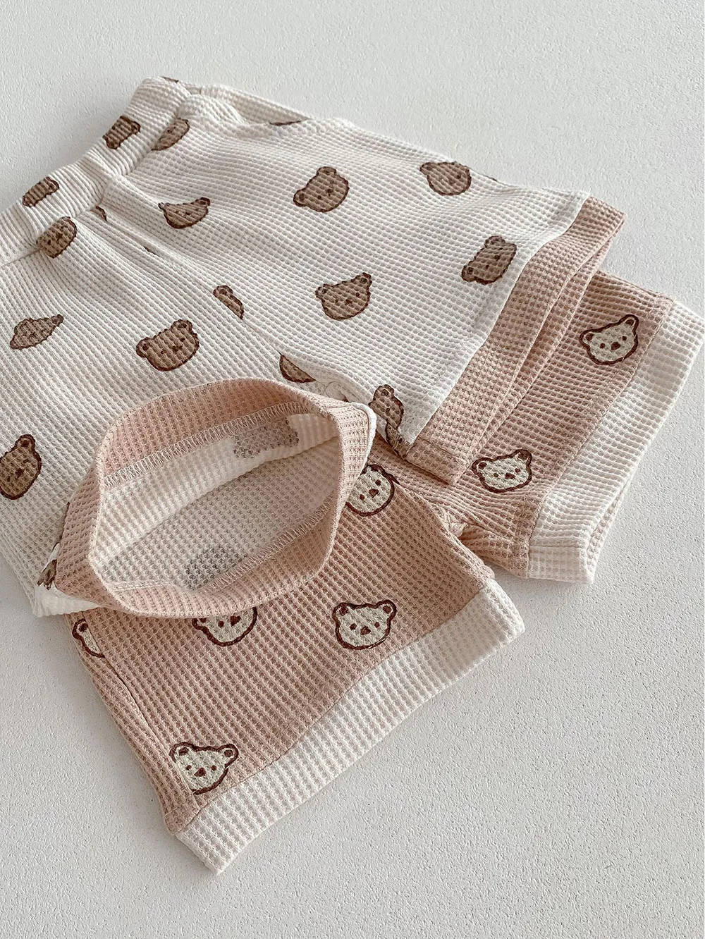 ベビーセットアップ 2点セット ワッフル 半袖Tシャツ+ショートパンツ ベアくまプリント 2カラー【mh0006168】