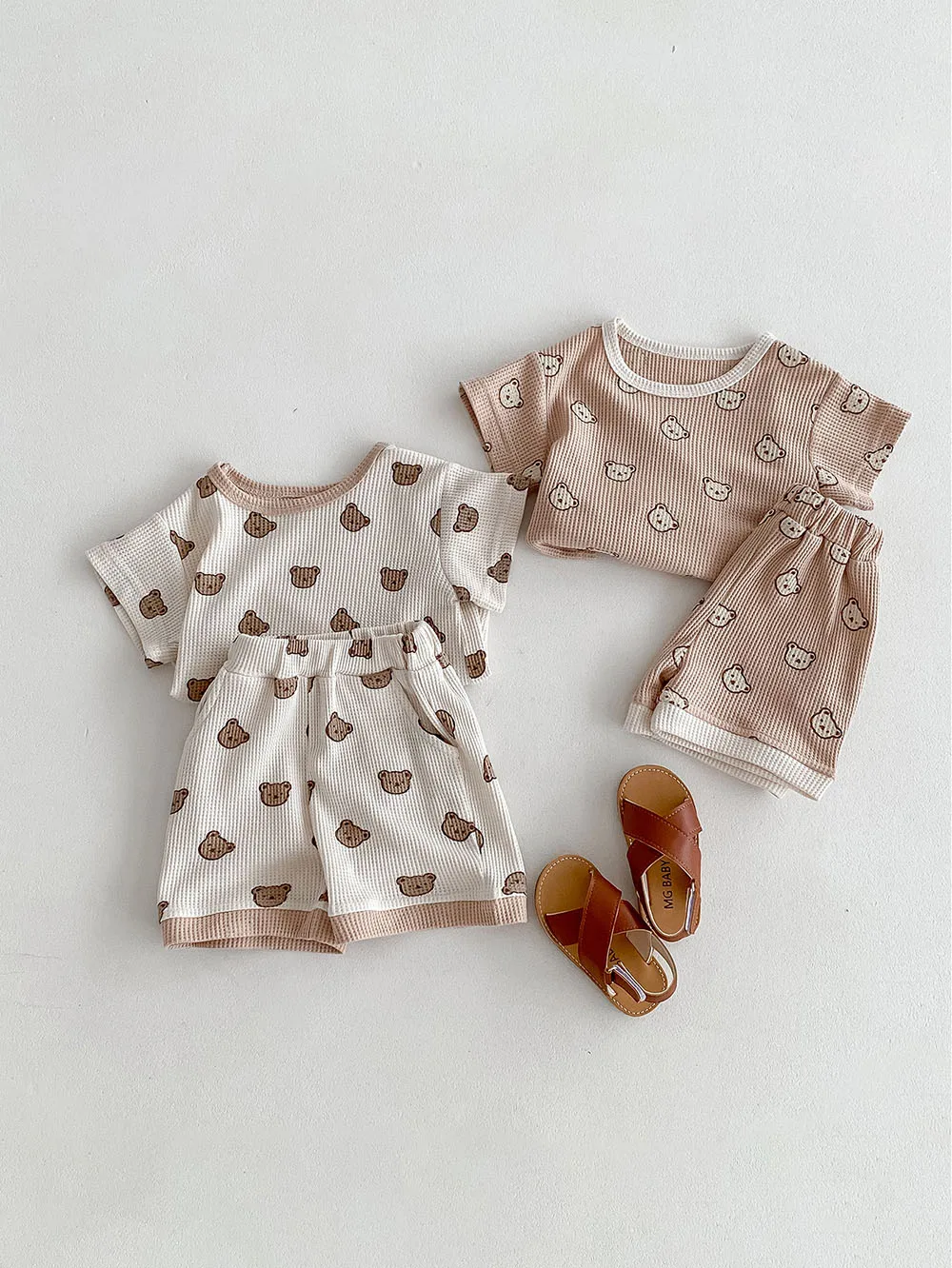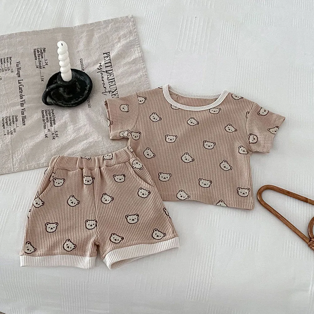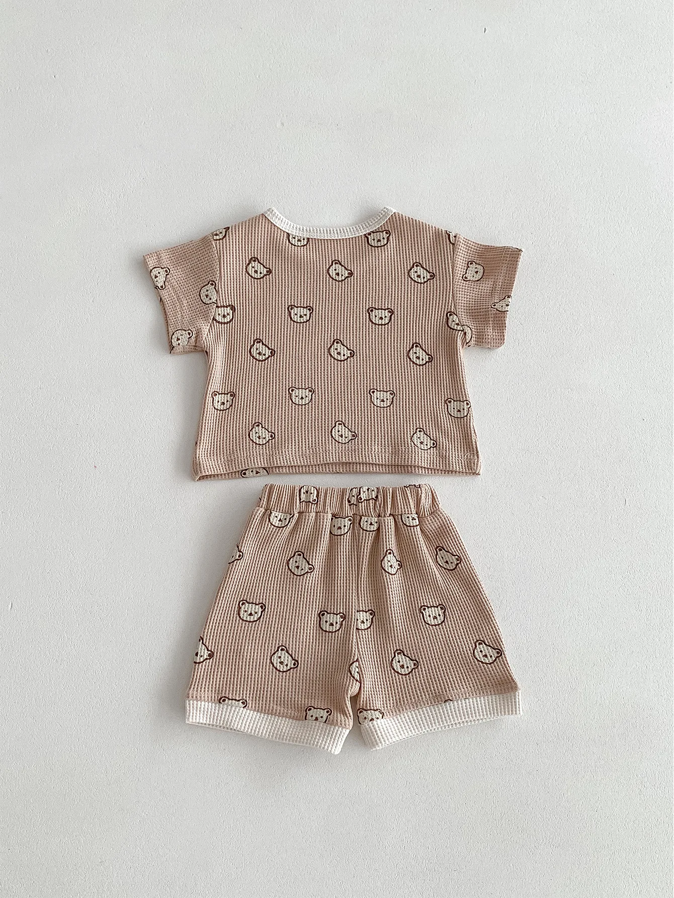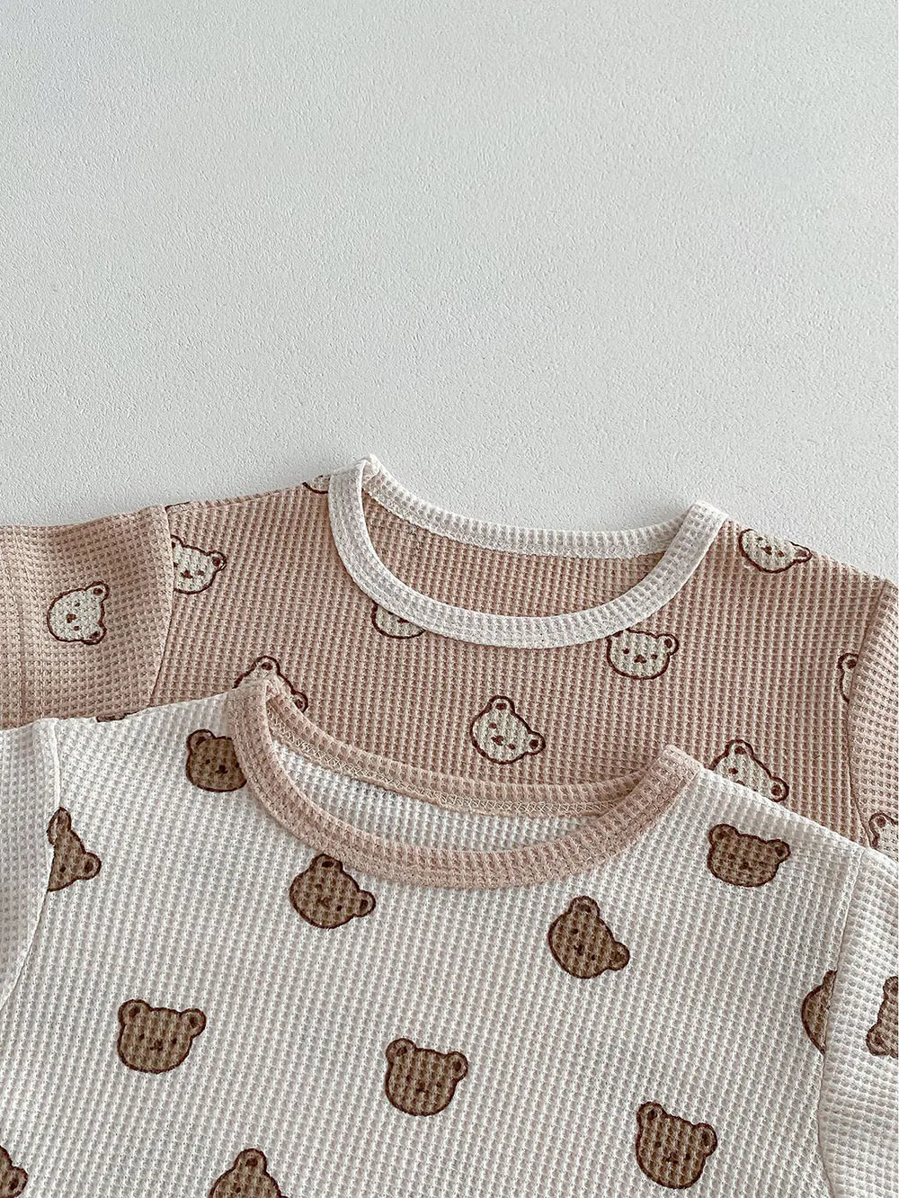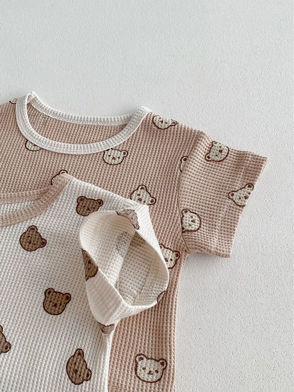 ベビーセットアップ 2点セット ワッフル 半袖Tシャツ+ショートパンツ ベアくまプリント 2カラー【mh0006168】