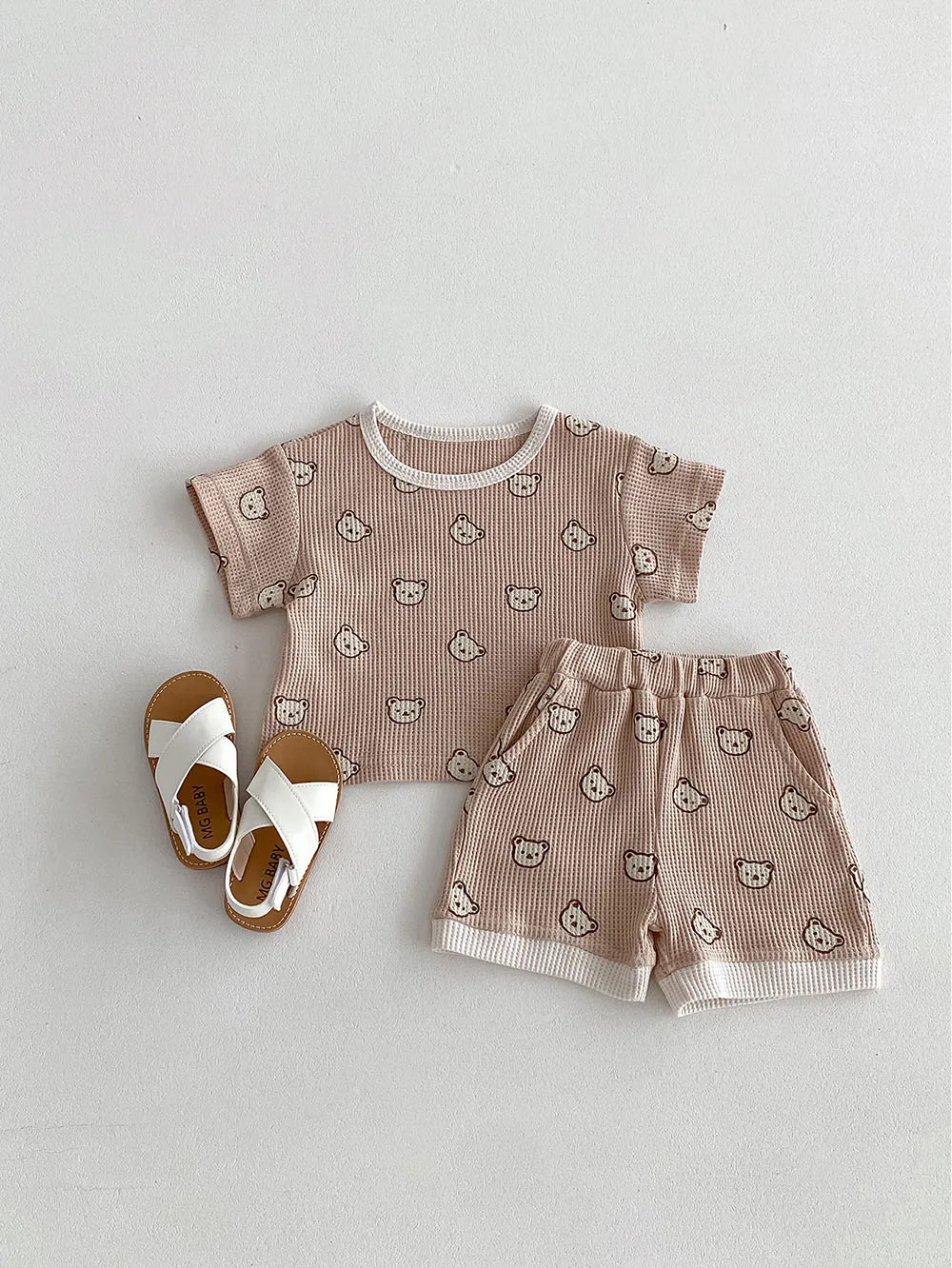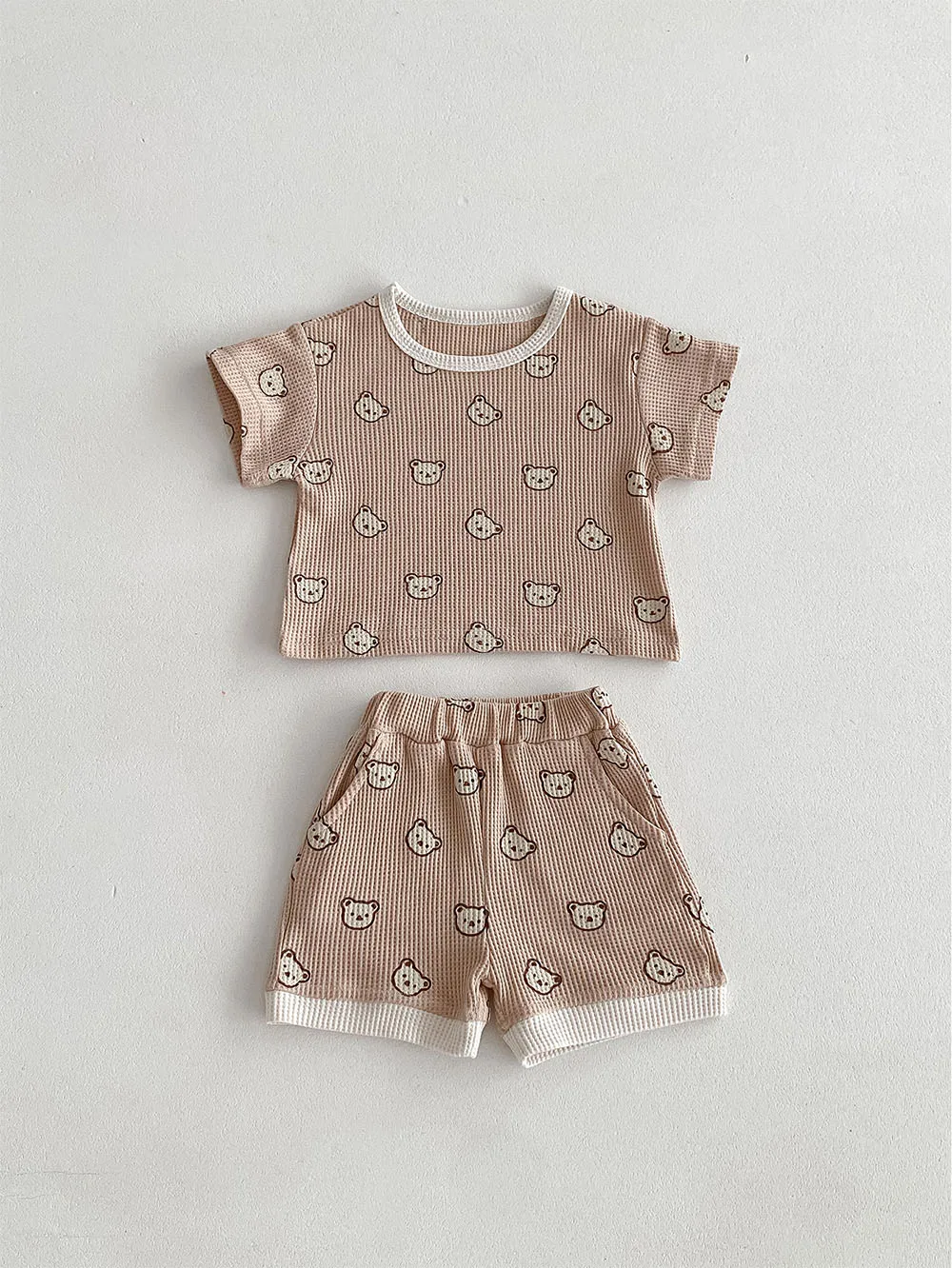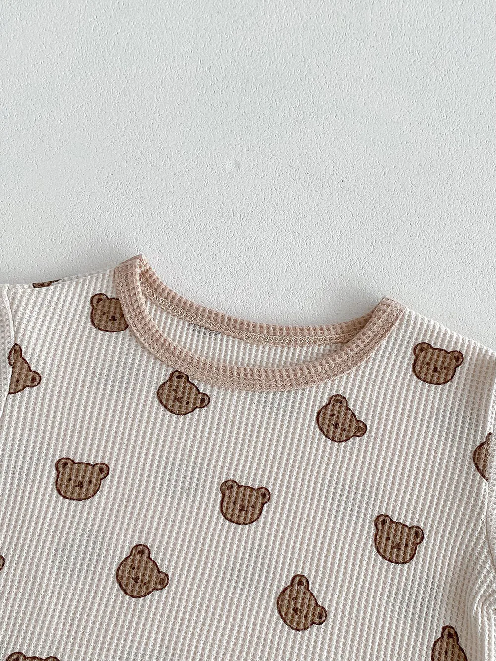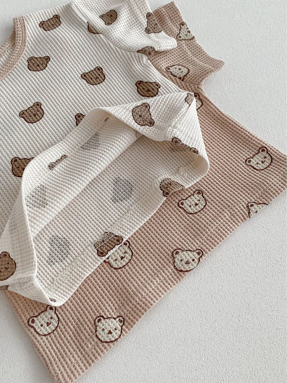 ベビーセットアップ 2点セット ワッフル 半袖Tシャツ+ショートパンツ ベアくまプリント 2カラー【mh0006168】