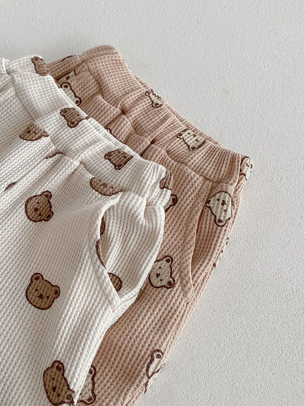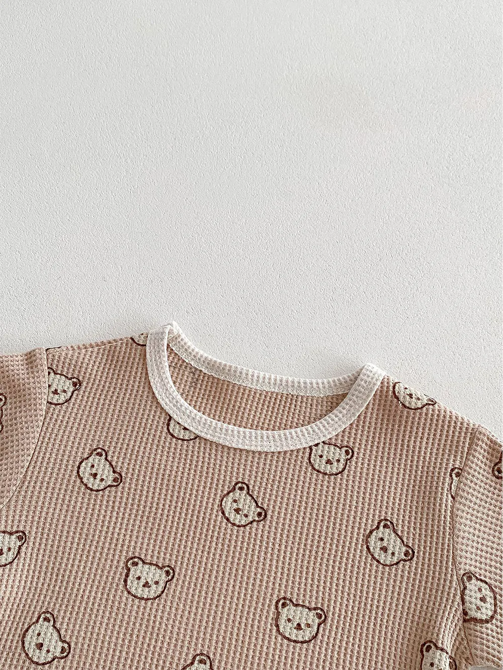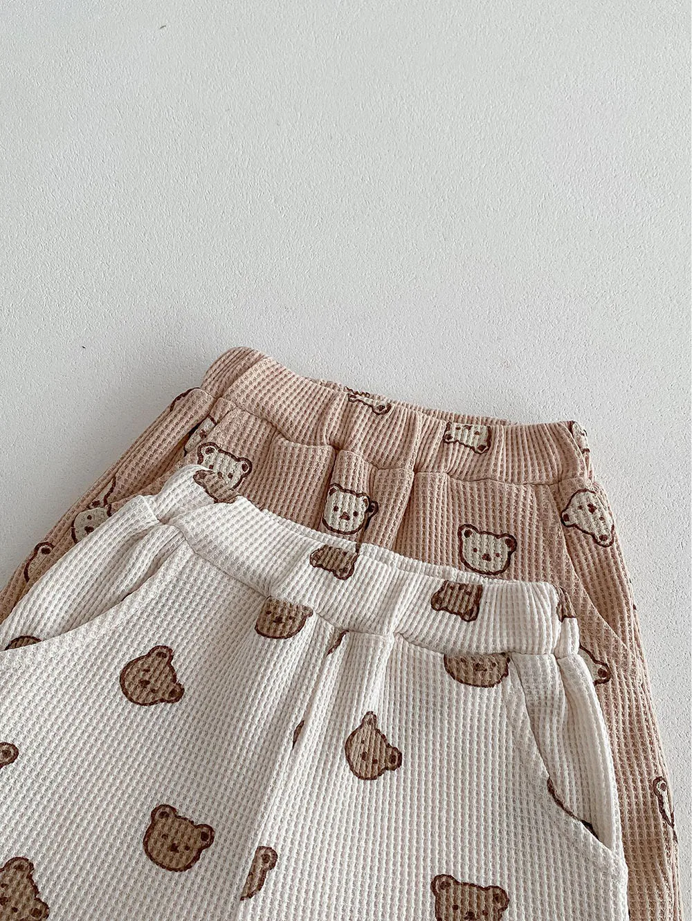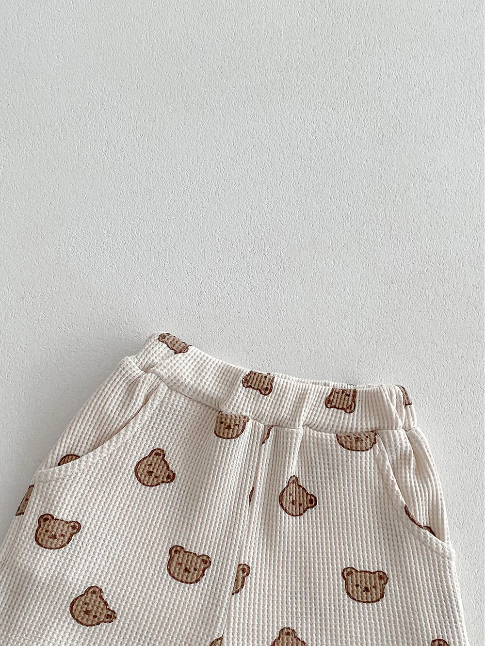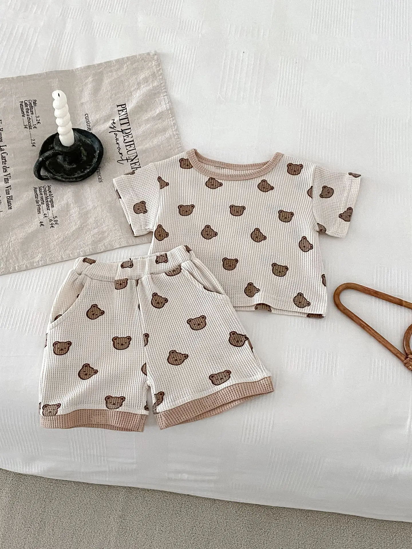 ベビーセットアップ 2点セット ワッフル 半袖Tシャツ+ショートパンツ ベアくまプリント 2カラー【mh0006168】