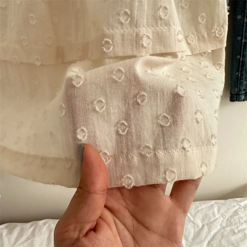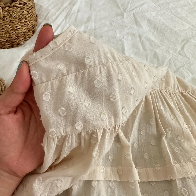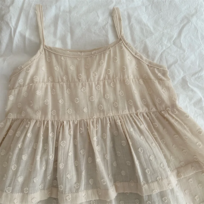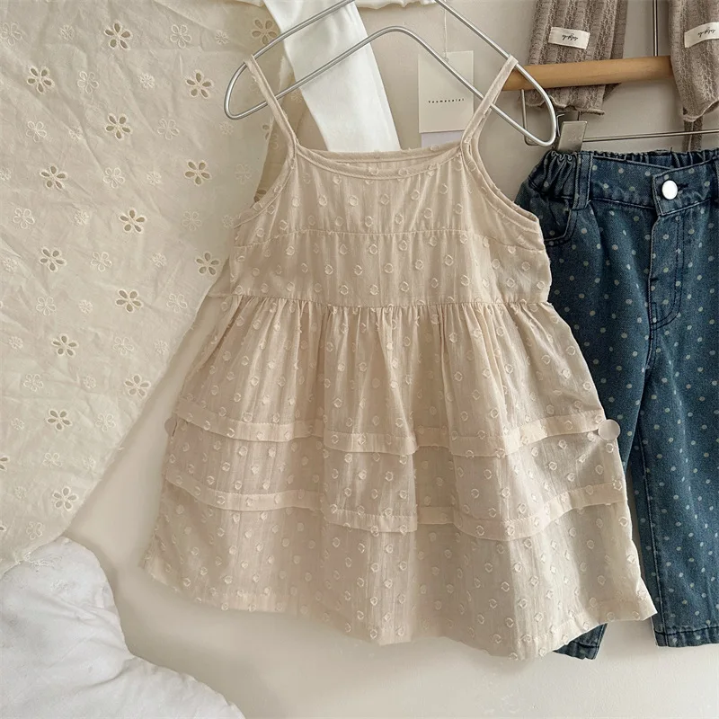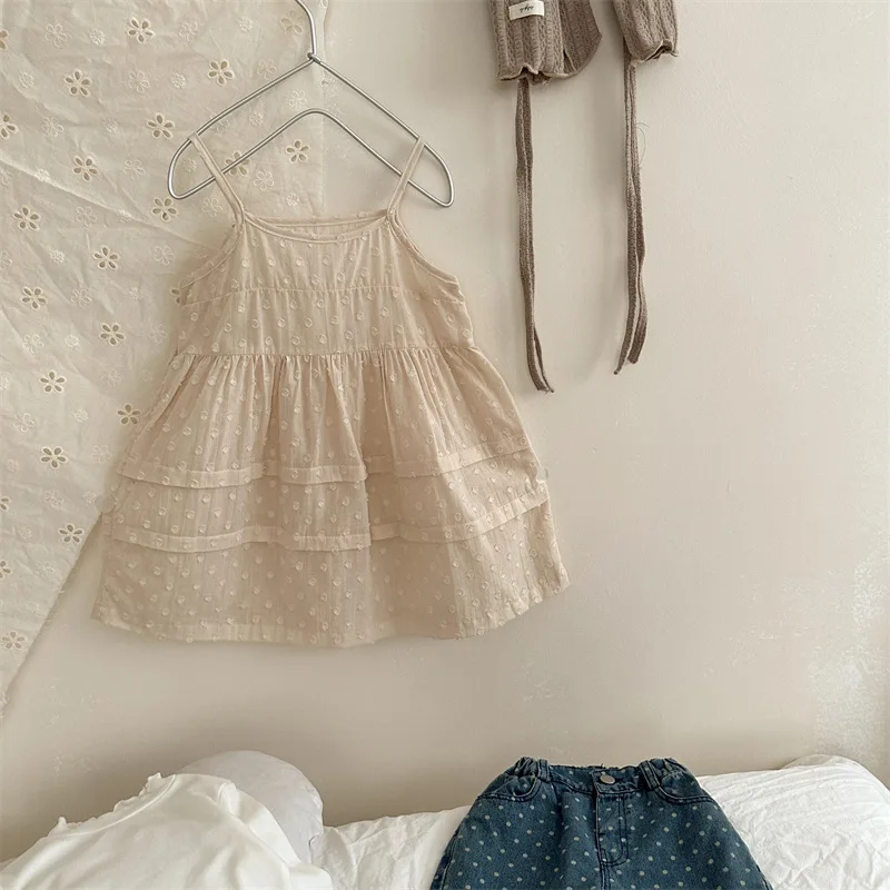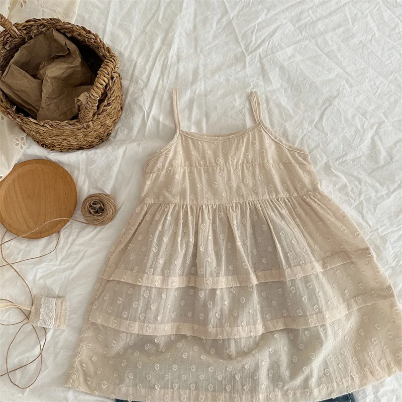 ベージュの刺繍レースを施したキッズキャミソールスリップドレスです。韓国スタイルのデザインが特徴で、シンプルながらもエレガントな印象を与えます。軽やかな素材で、お子様が快適に過ごせるよう工夫されています。秋冬の重ね着コーディネートにぴったりなアイテムで、カジュアルながらもキュートな雰囲気を演出します。