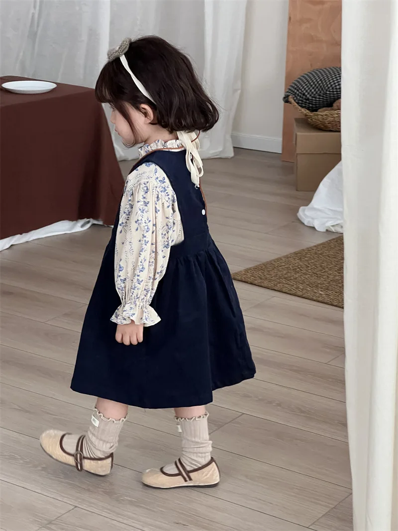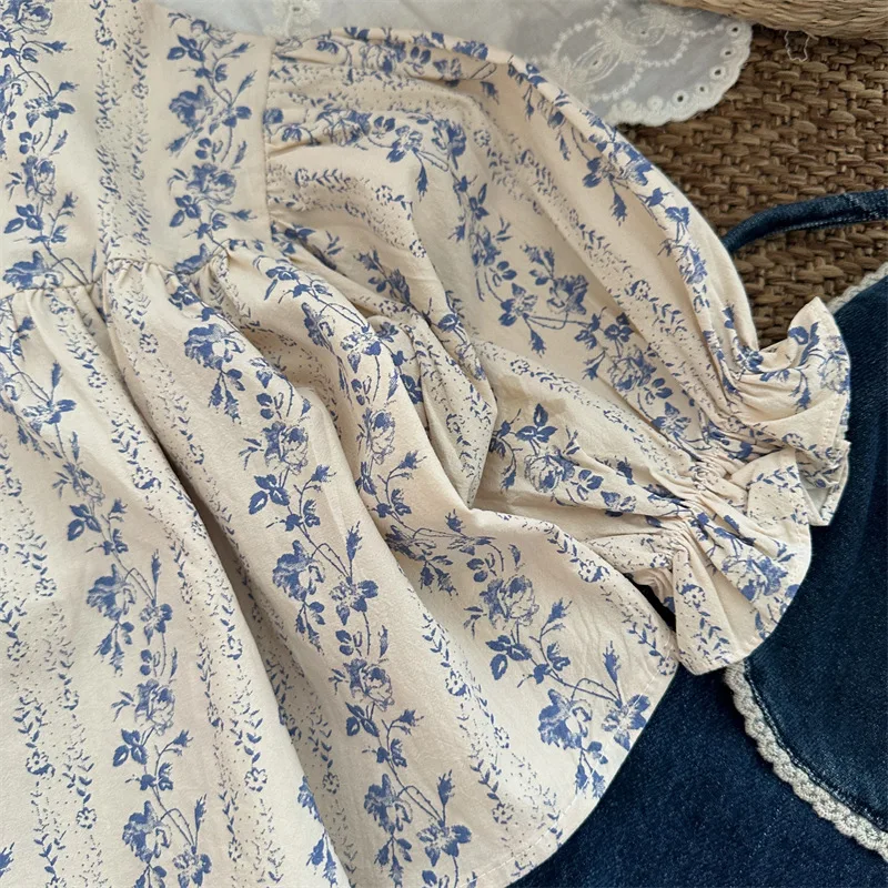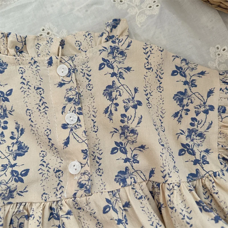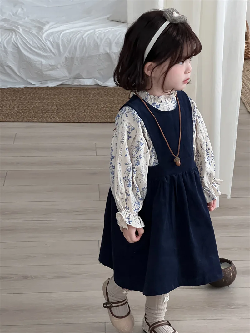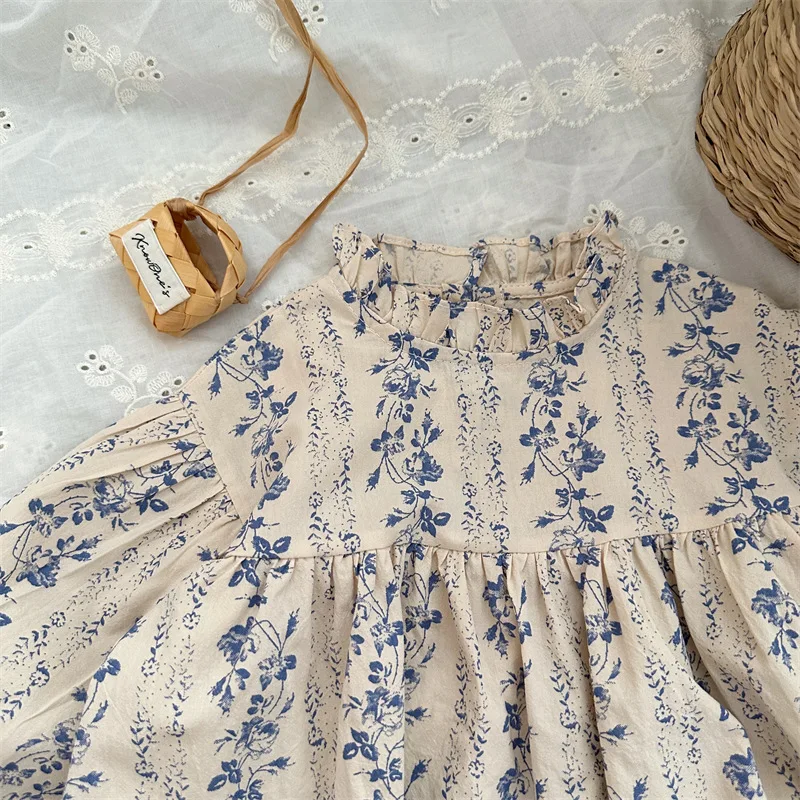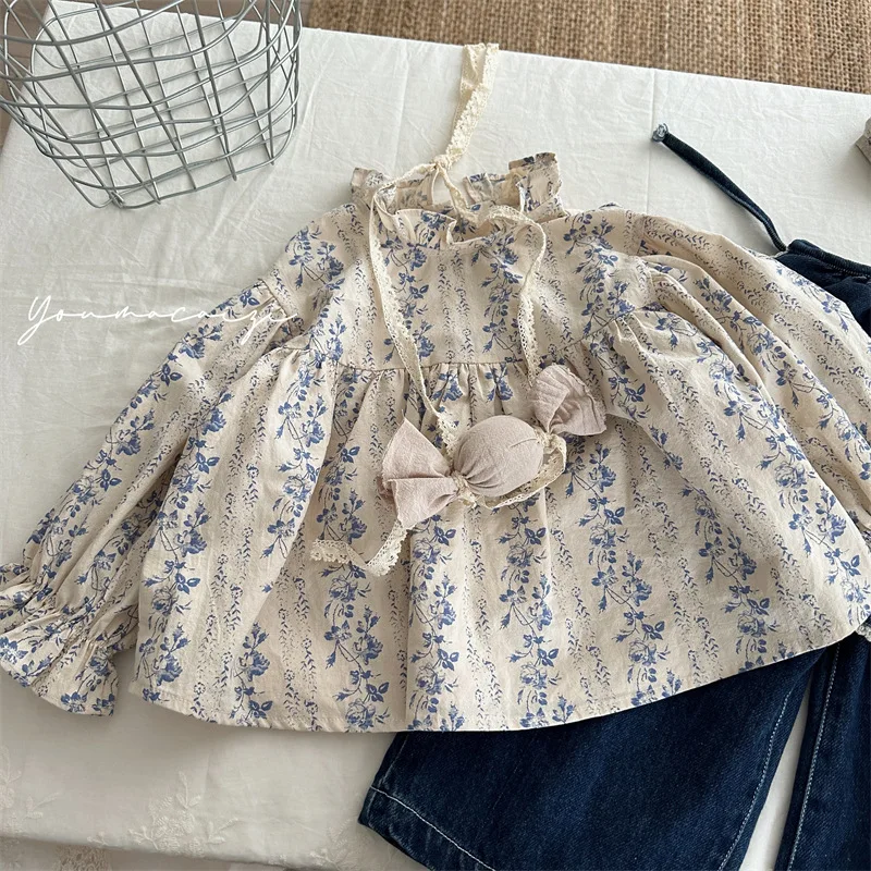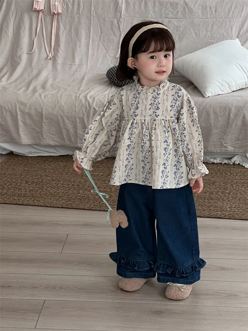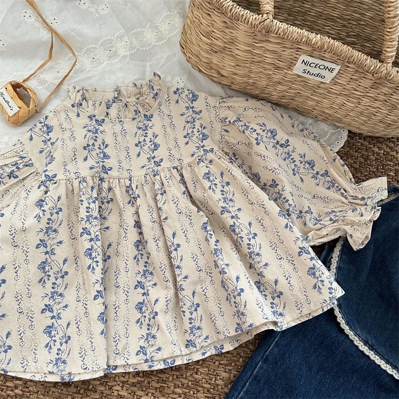 フリルスタンドカラーとフラワーストライププリントが特徴の長袖パフスリーブチュニックブラウス。ゆったりとしたシルエットで動きやすく、韓国風スタイルを楽しめるアイテムです。秋のカジュアルコーデにぴったりなデザインで、おしゃれなキッズのワードローブに最適です。