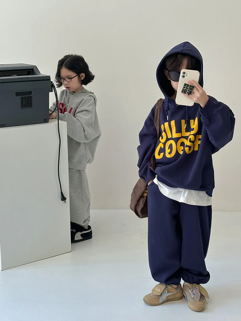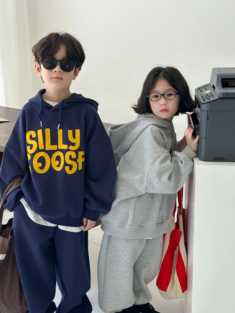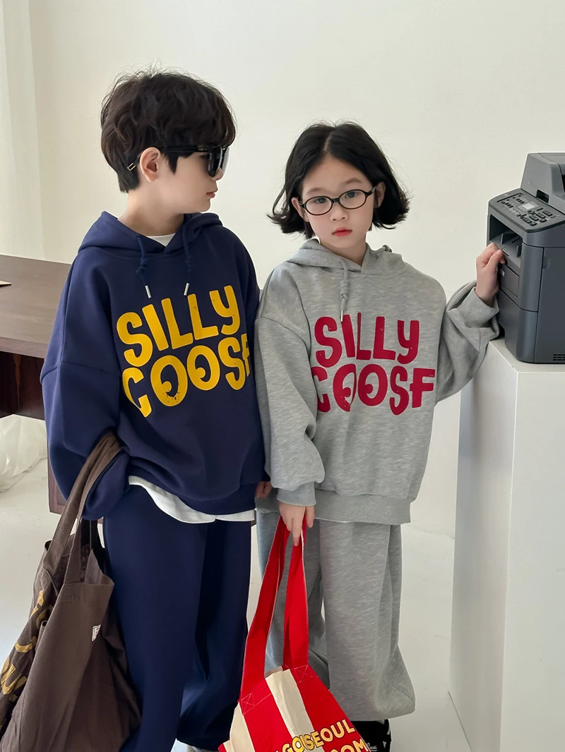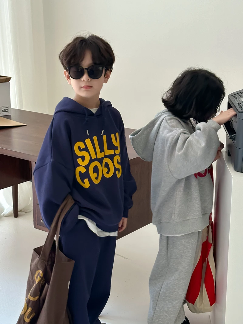 シンプルでスタイリッシュなレターロゴプリントのスウェットフーディパーカーとスウェットパンツの2点セットです。柔らかく動きやすい素材で、秋のアクティブな日常に最適なアイテム。フード付きのパーカーは、カジュアルながらもおしゃれな印象を演出します。パンツはウエストゴム仕様で、フィット感も抜群。2色展開で、男の子も女の子も楽しめるデザインです。