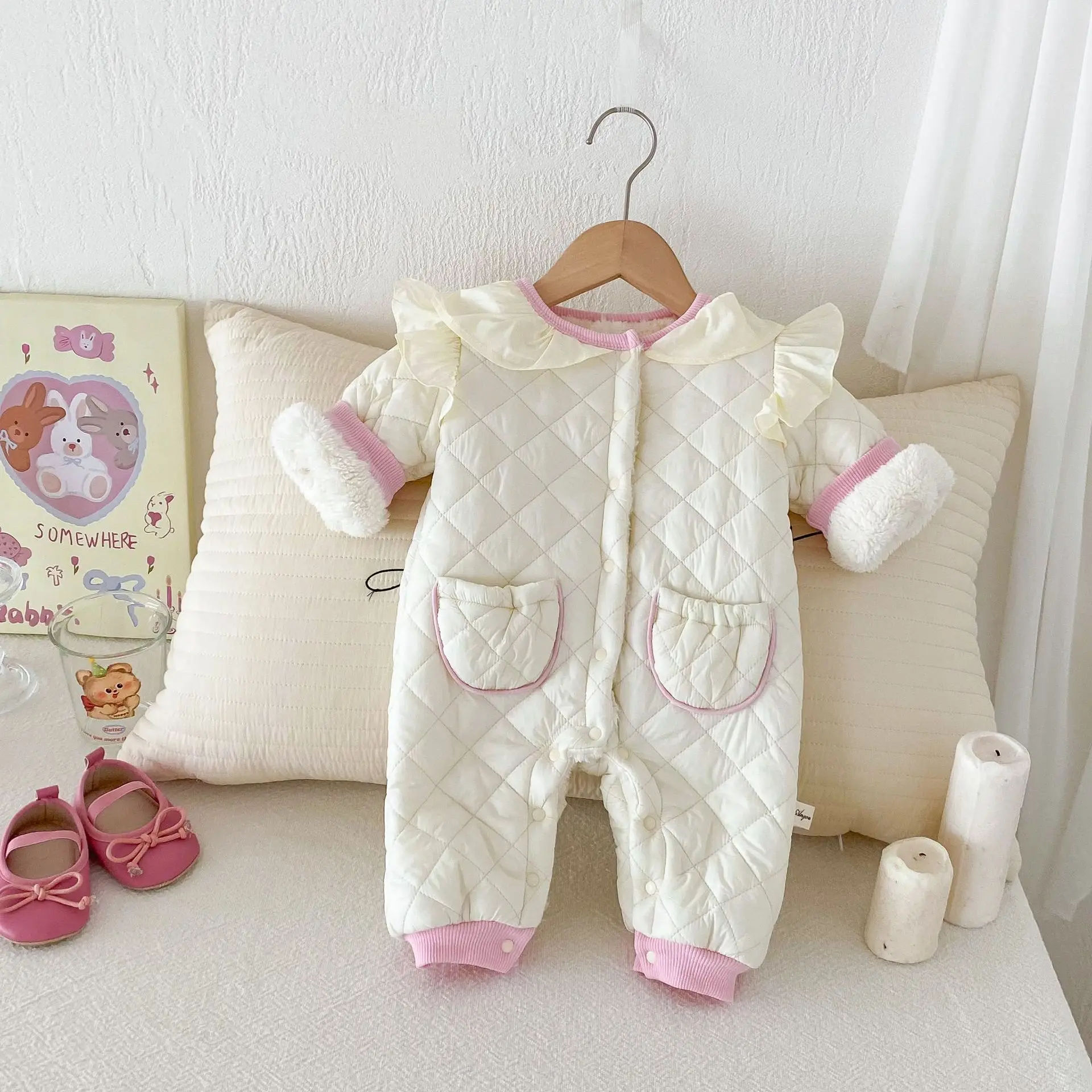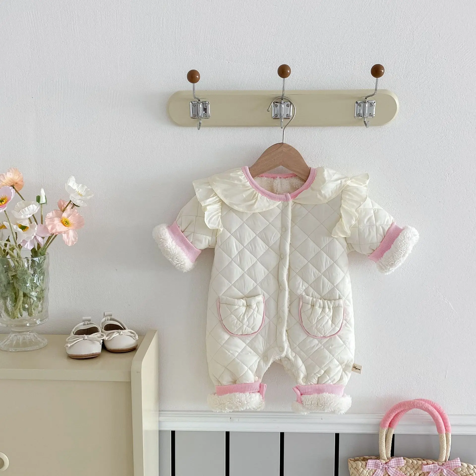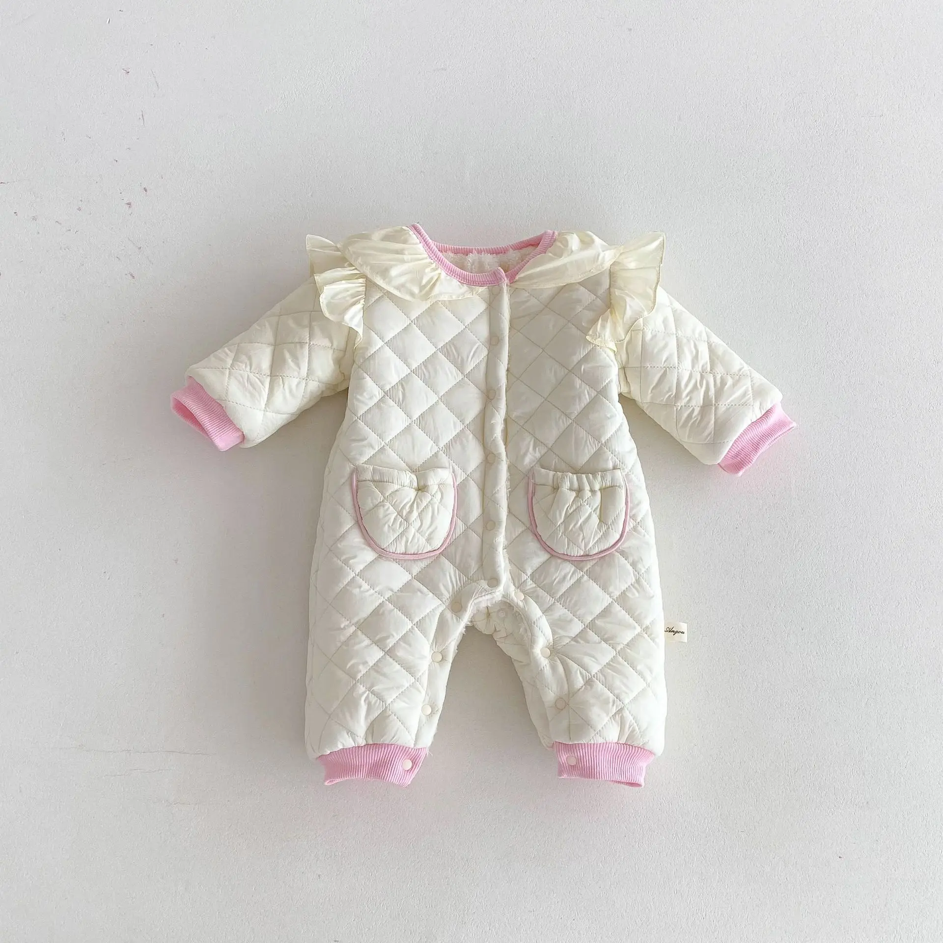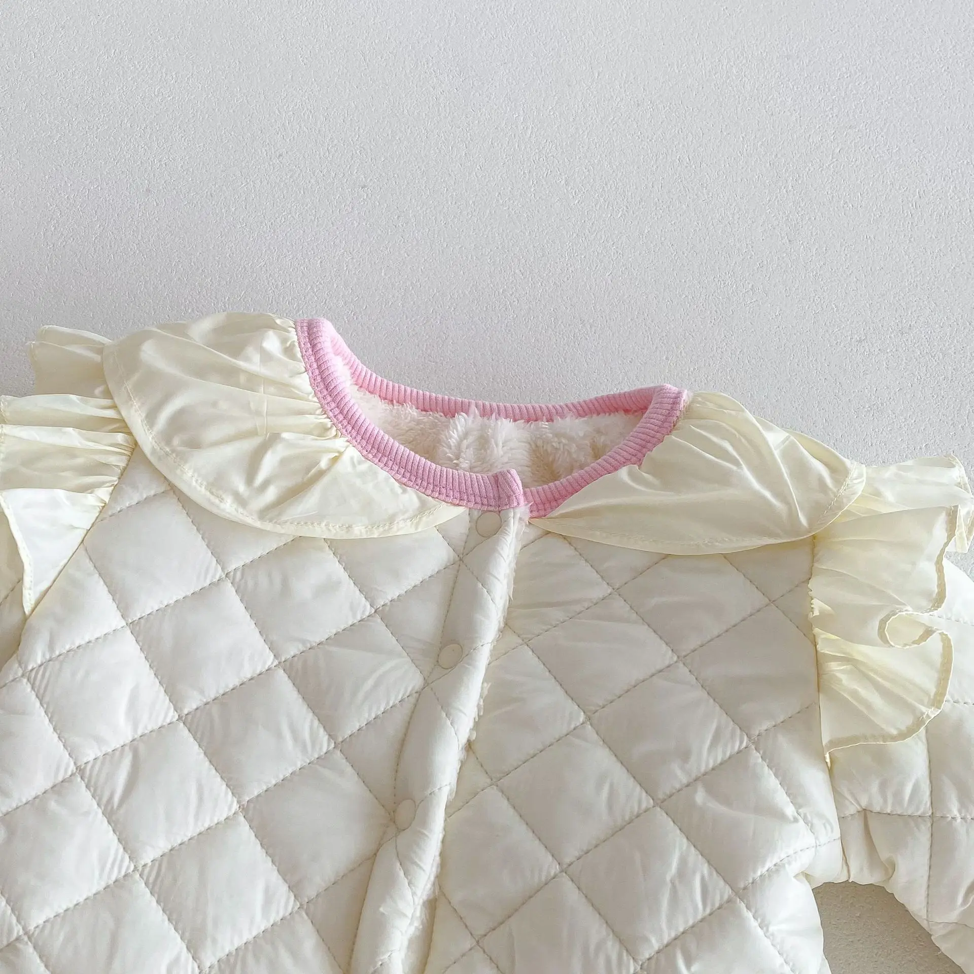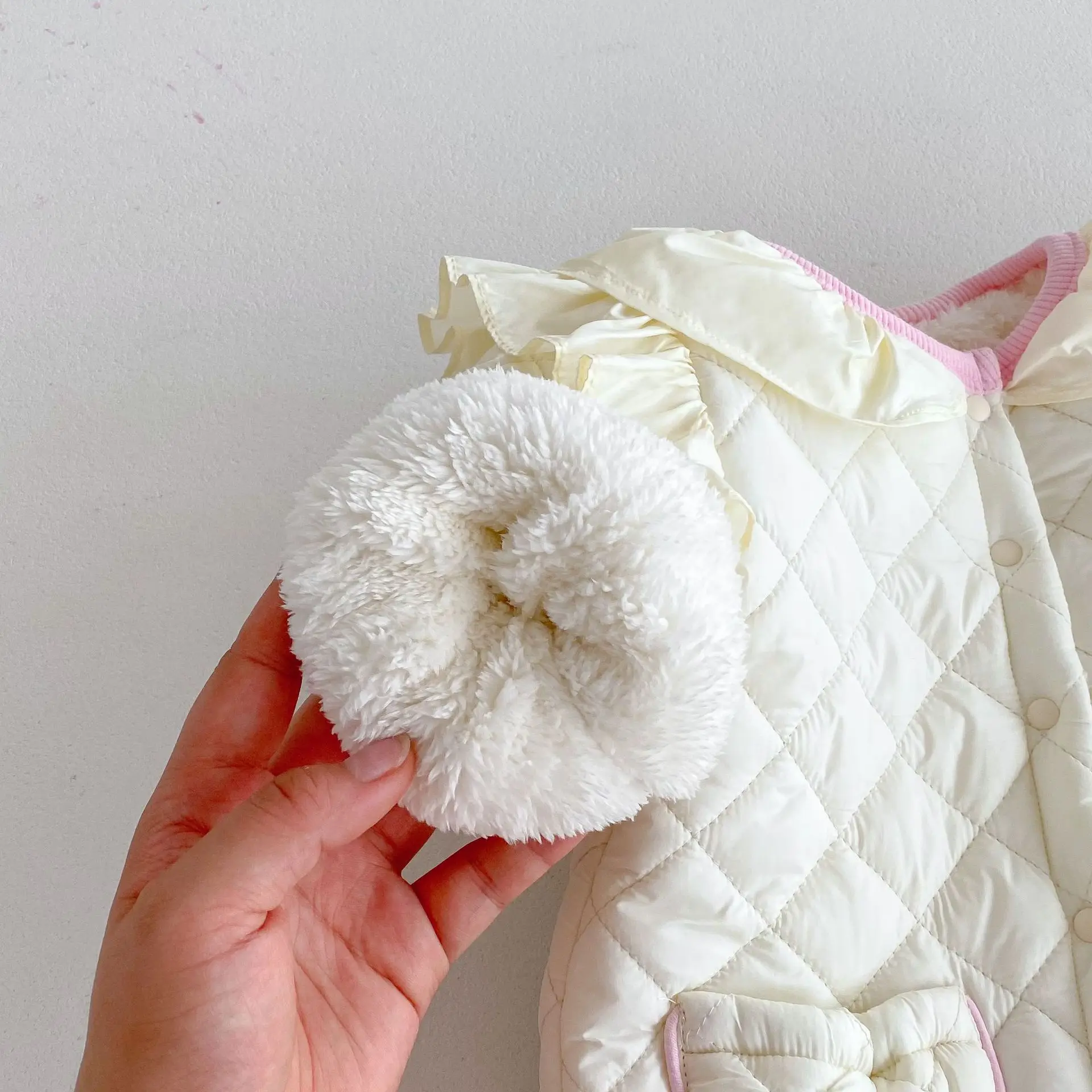 ベビーアウタージャンプスーツ キルティング裏フリースショルダーフリル長袖ロンパース【mh0008276】