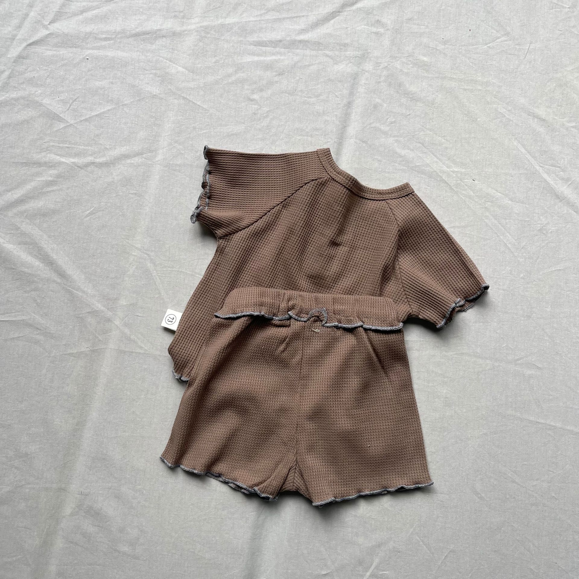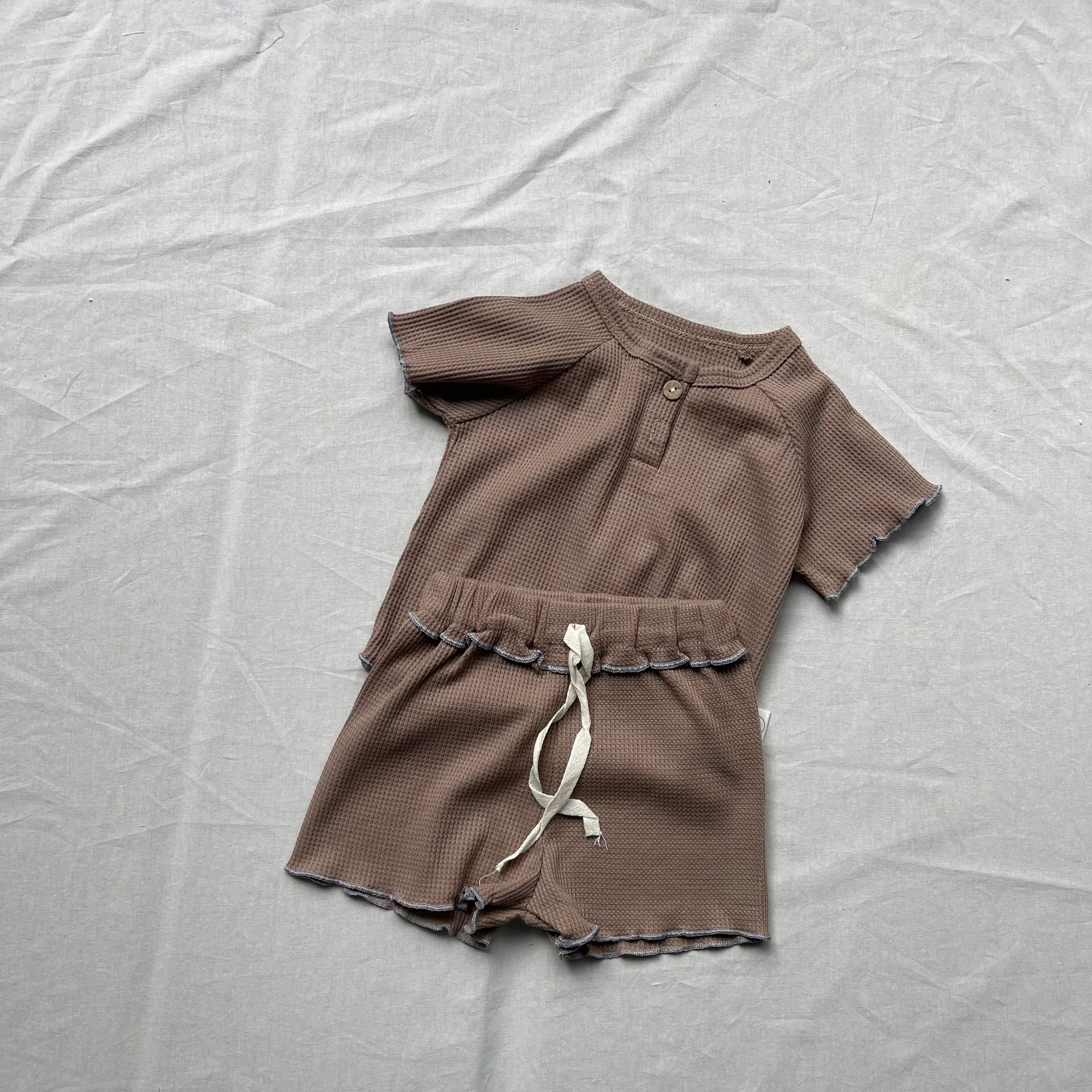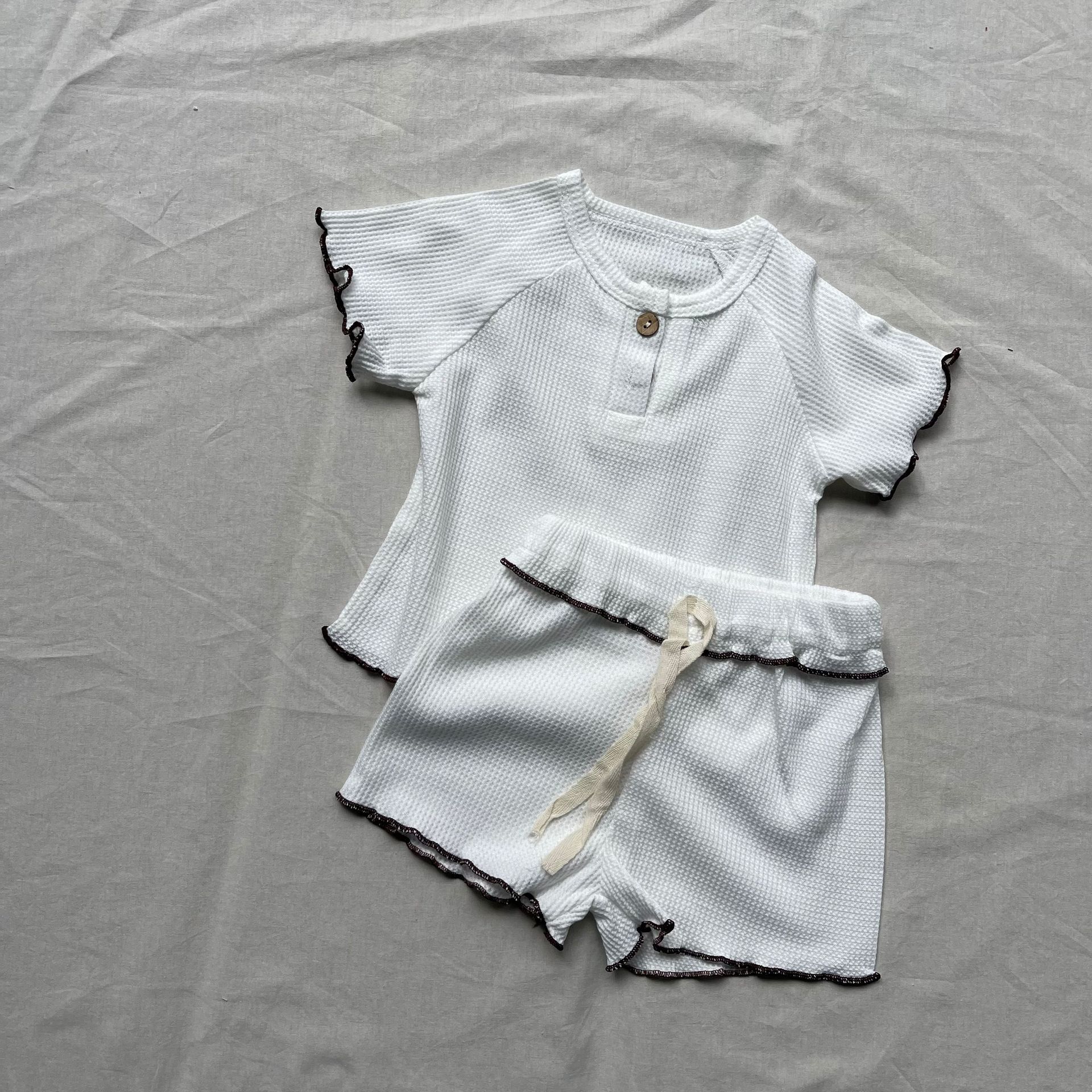 ナチュラルなベージュカラーとさりげないフリルディテールが魅力のキッズセットアップです。トップスの裾や袖口にはカールエッジ加工が施され、柔らかな雰囲気を演出。ショートパンツとの組み合わせで、シンプルながらもおしゃれなスタイルに仕上がります。通気性に優れた軽やかな素材を使用し、暑い季節でも快適な着心地を提供。ラウンドネックデザインで動きやすく、デイリーウェアとしてもぴったりです。男女兼用のデザインで、さまざまなコーディネートに合わせやすい一着です。