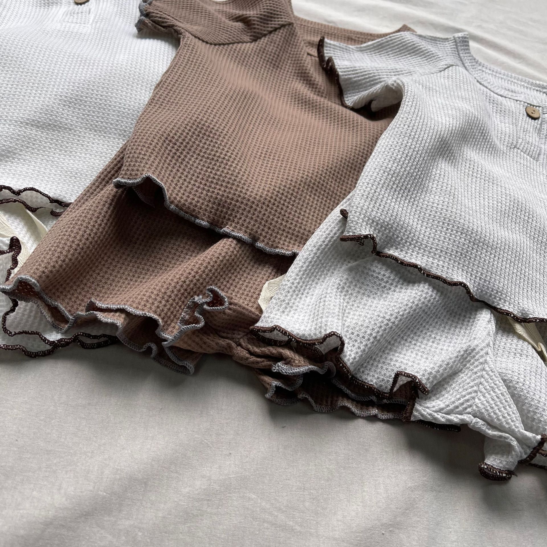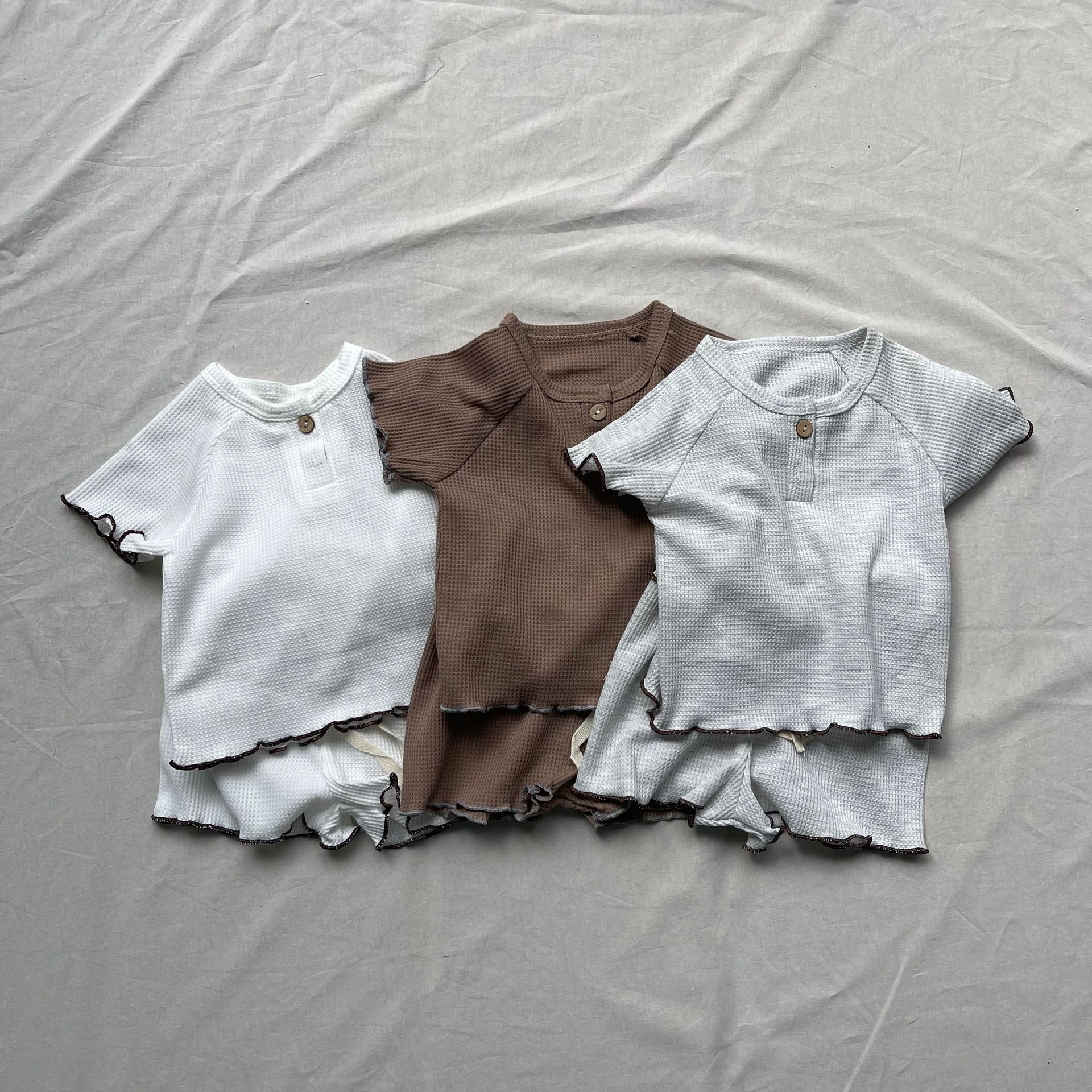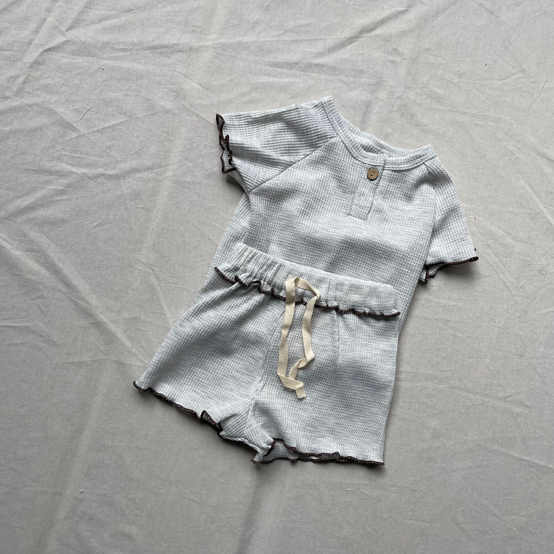ナチュラルなベージュカラーとさりげないフリルディテールが魅力のキッズセットアップです。トップスの裾や袖口にはカールエッジ加工が施され、柔らかな雰囲気を演出。ショートパンツとの組み合わせで、シンプルながらもおしゃれなスタイルに仕上がります。通気性に優れた軽やかな素材を使用し、暑い季節でも快適な着心地を提供。ラウンドネックデザインで動きやすく、デイリーウェアとしてもぴったりです。男女兼用のデザインで、さまざまなコーディネートに合わせやすい一着です。