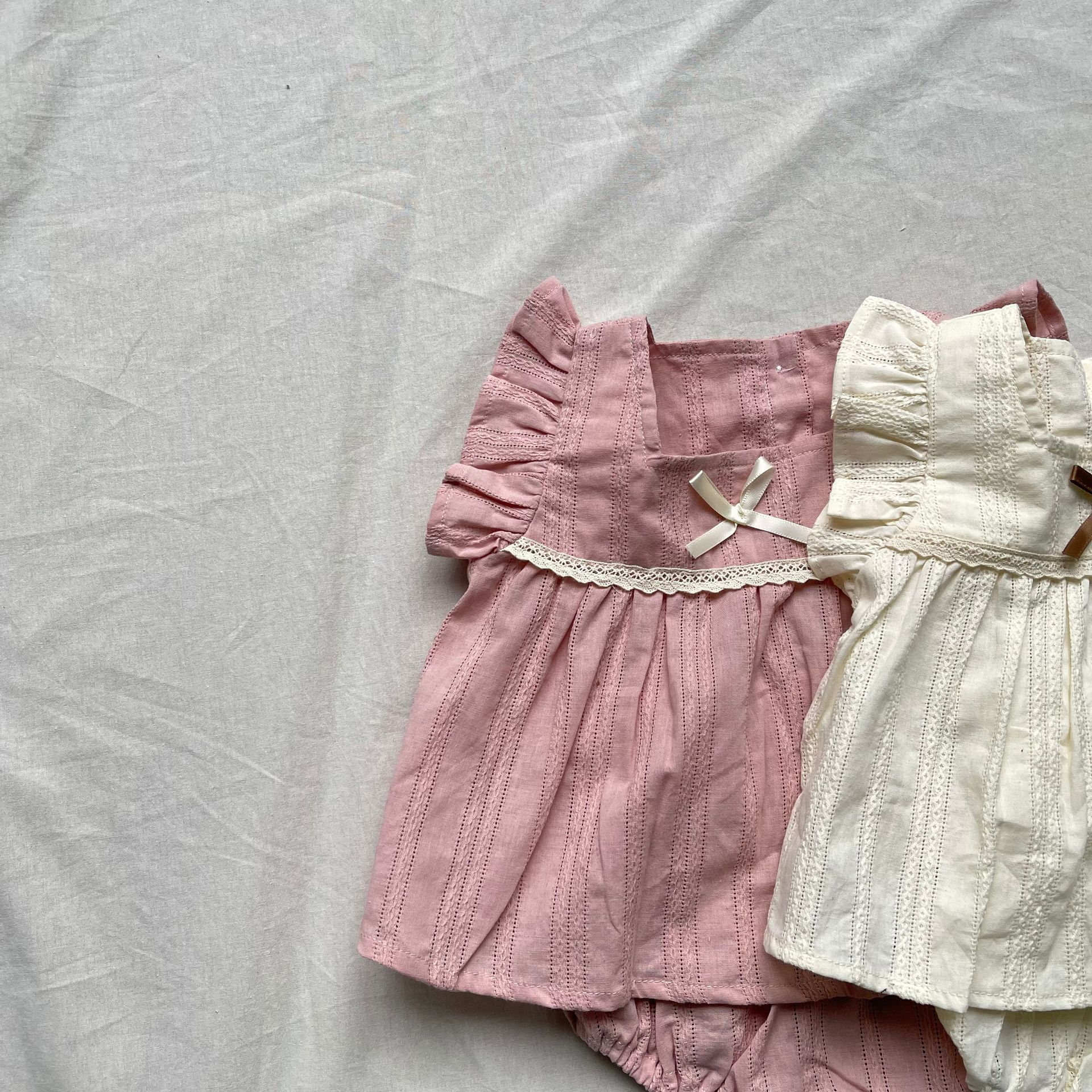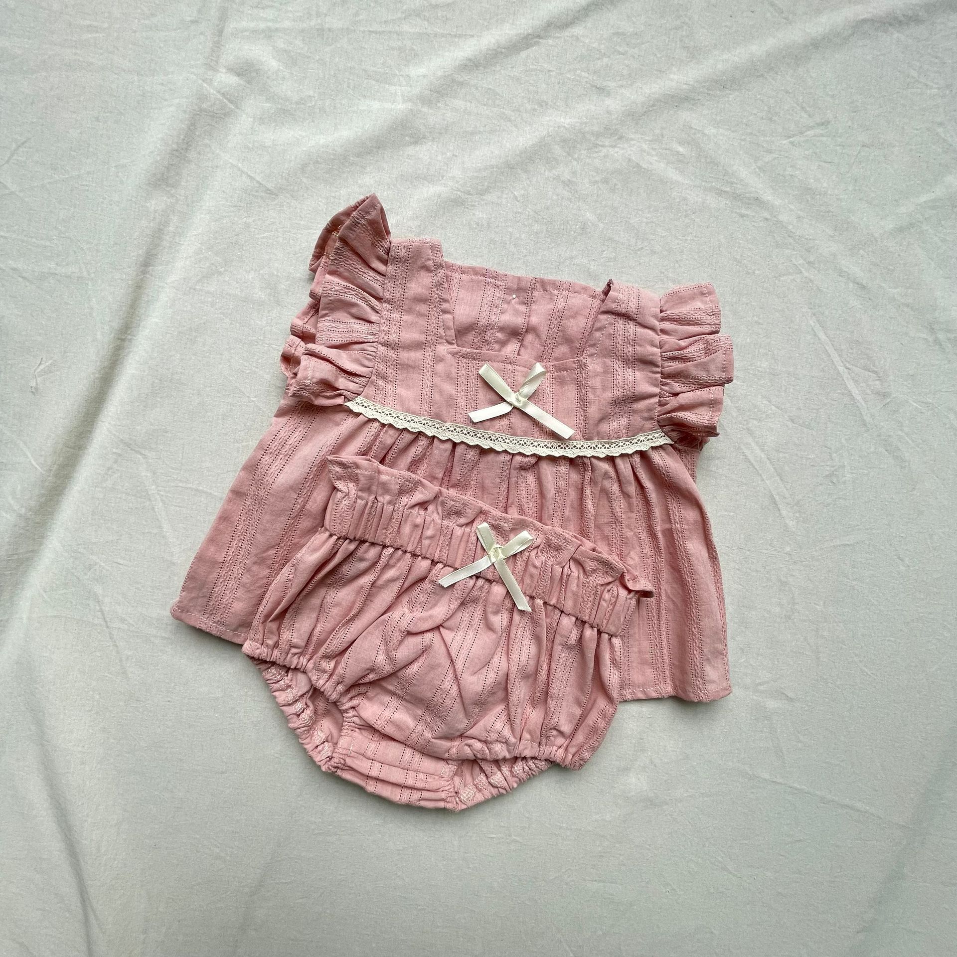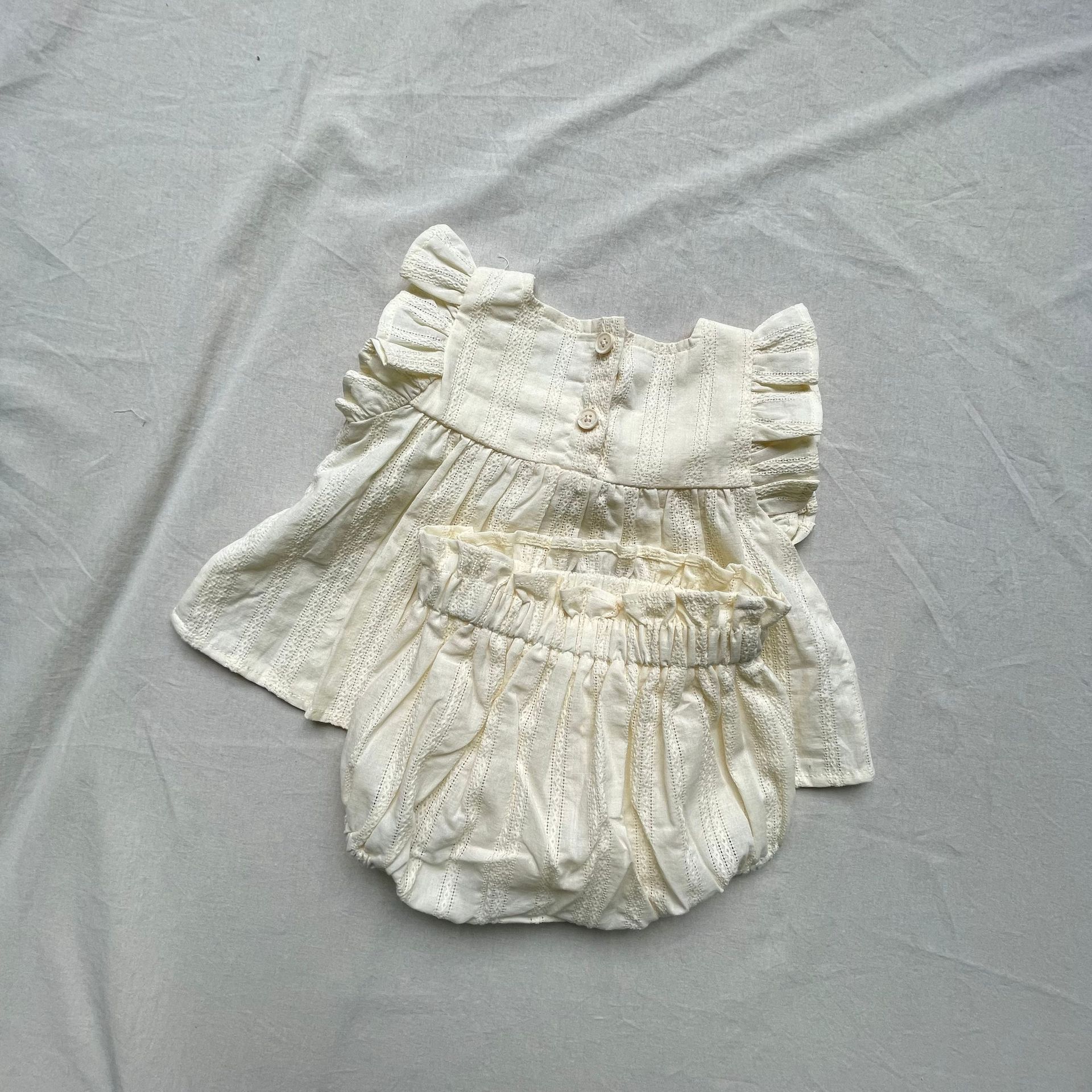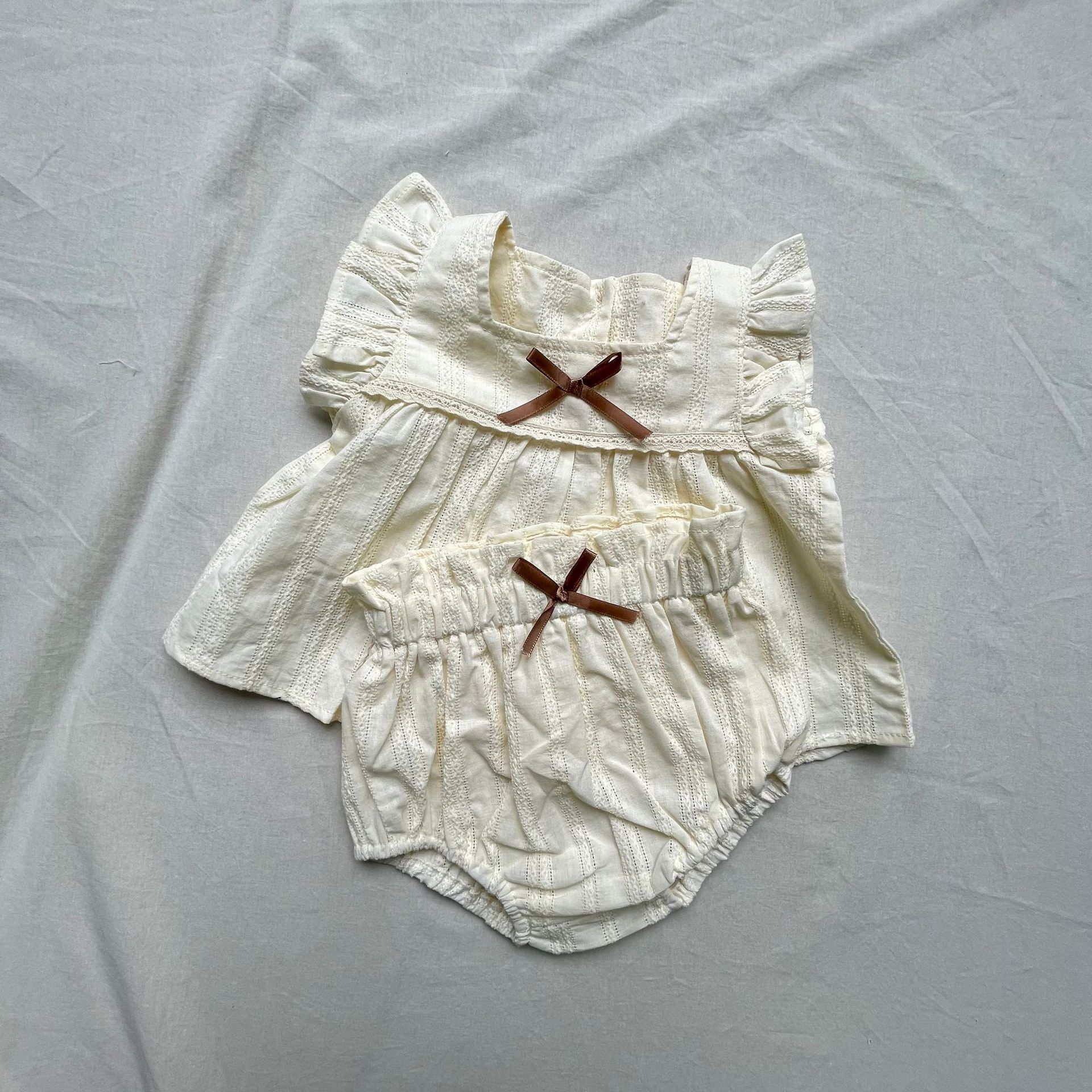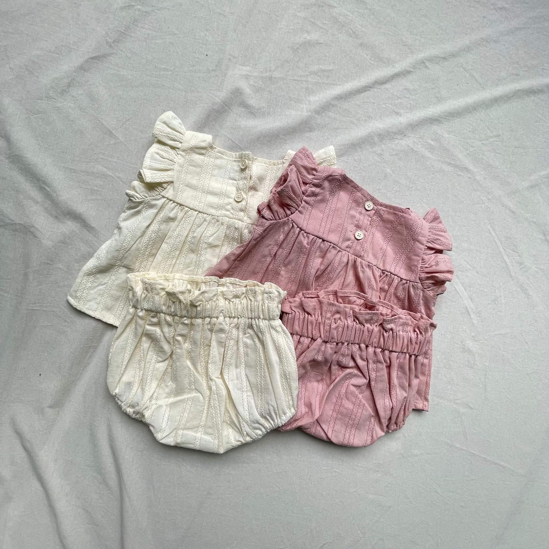 レースフリルが施された半袖チュニックブラウスとブルマパンツのセットアップ。可愛らしさを引き立てるフライングスリーブのデザインで、女の子らしい優雅さを演出します。軽やかで柔らかい素材を使用しており、肌触りも良く、赤ちゃんの肌に優しいアイテムです。ブルマパンツは動きやすく、夏の快適な着心地を提供します。お出かけにもぴったりな、可愛らしくておしゃれなセットアップです。
