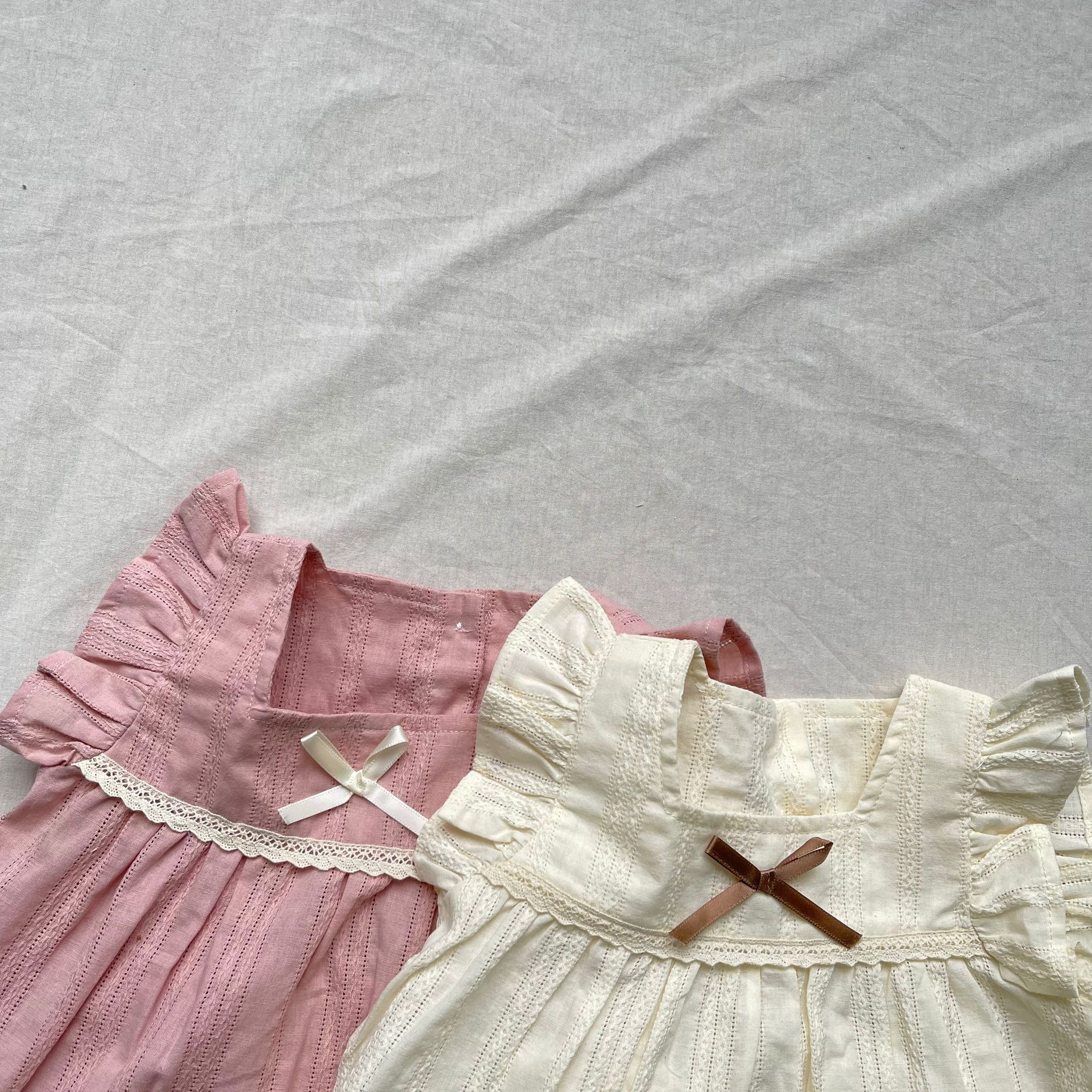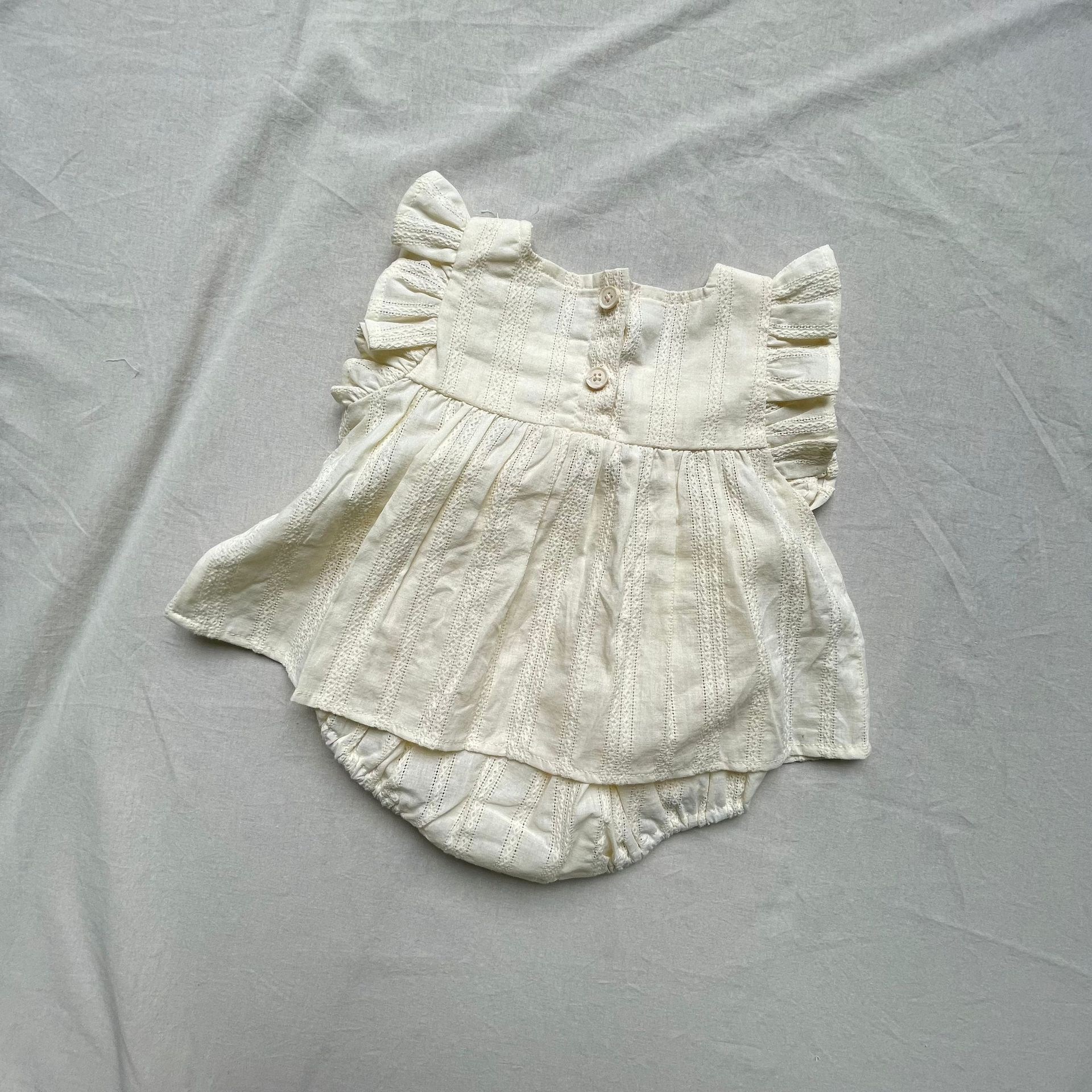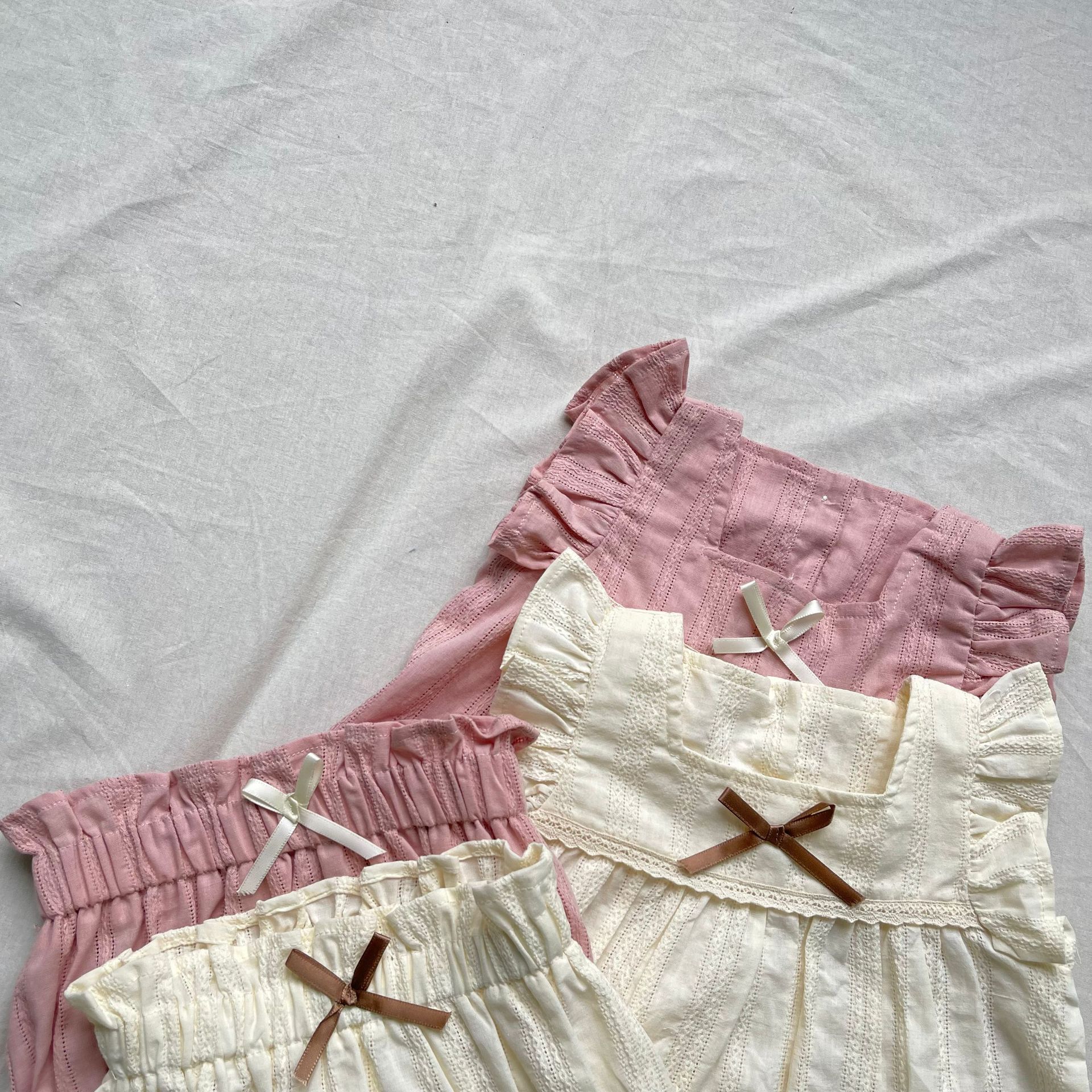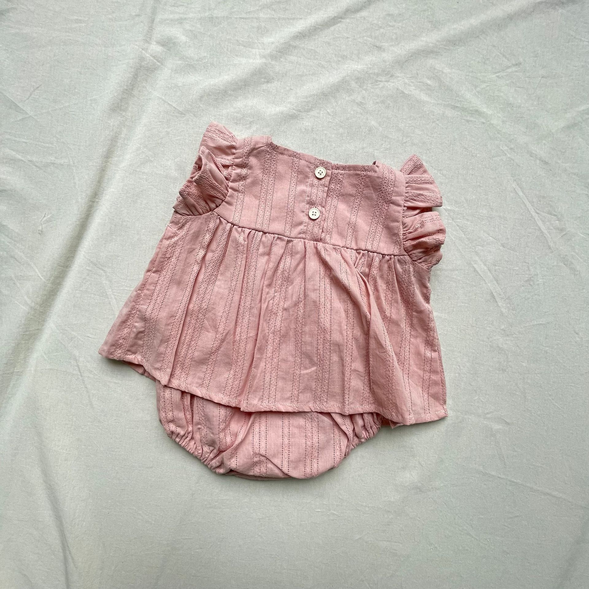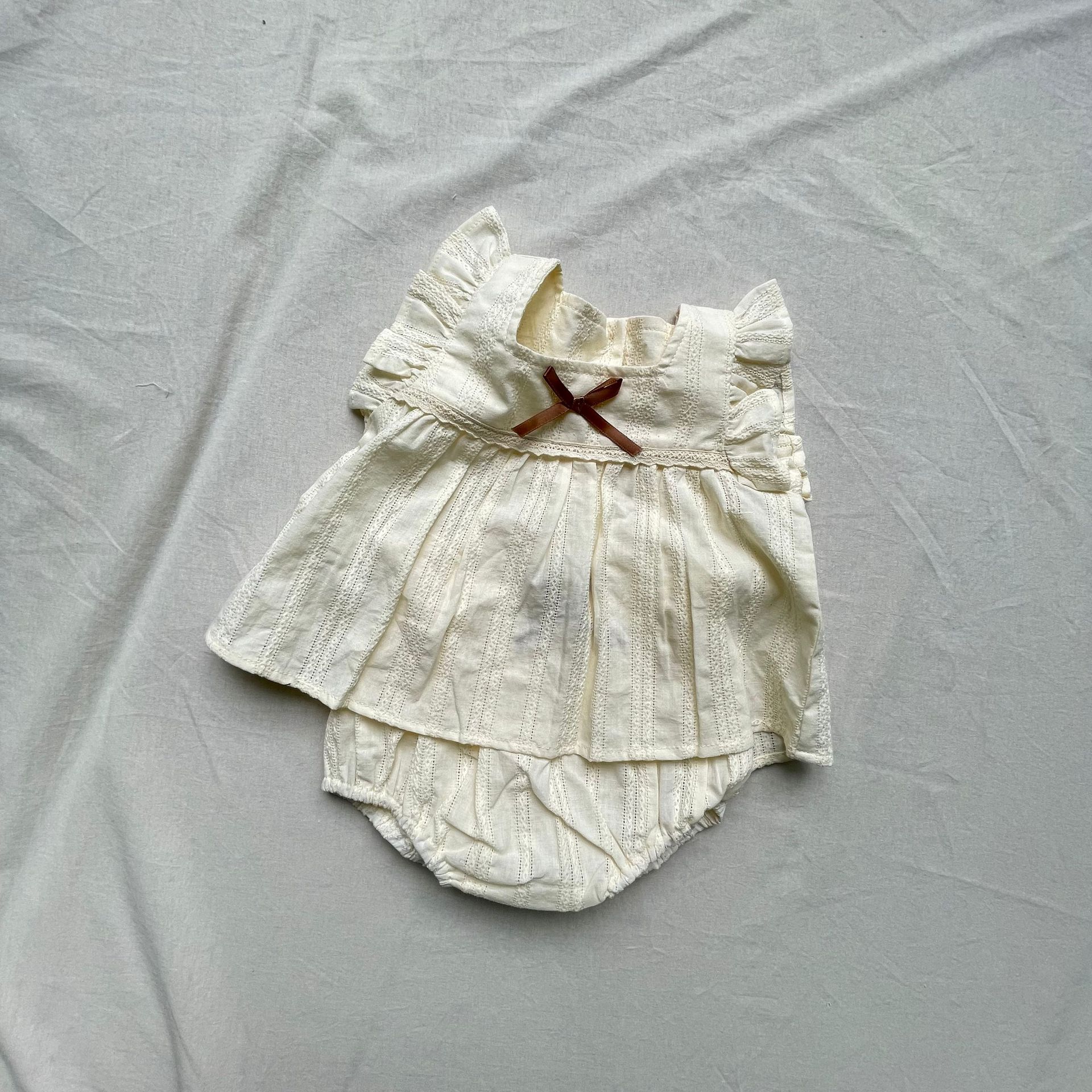 レースフリルが施された半袖チュニックブラウスとブルマパンツのセットアップ。可愛らしさを引き立てるフライングスリーブのデザインで、女の子らしい優雅さを演出します。軽やかで柔らかい素材を使用しており、肌触りも良く、赤ちゃんの肌に優しいアイテムです。ブルマパンツは動きやすく、夏の快適な着心地を提供します。お出かけにもぴったりな、可愛らしくておしゃれなセットアップです。