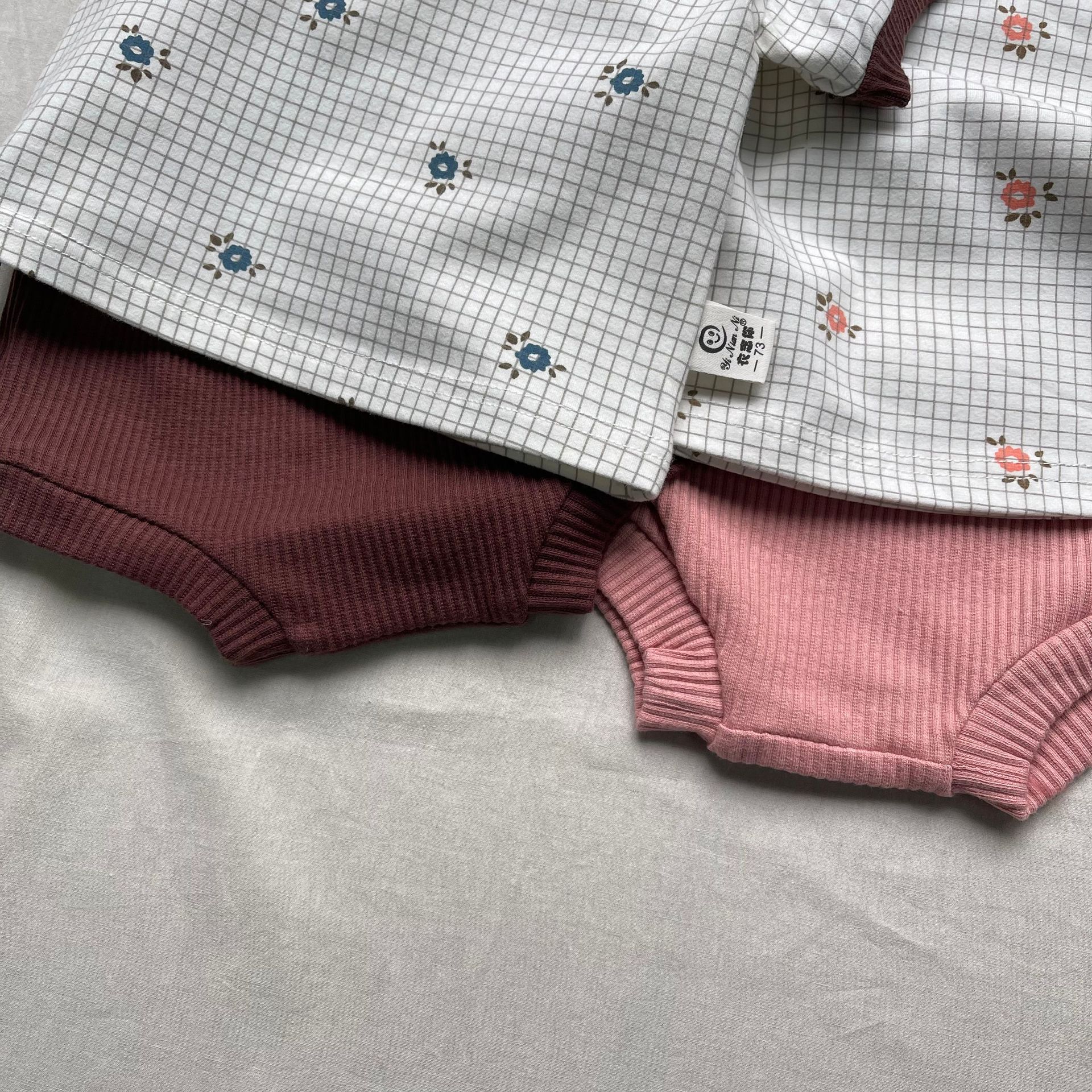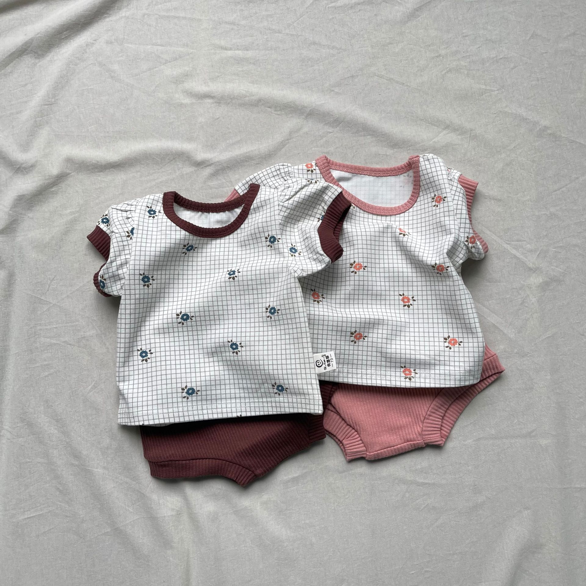 チェック柄とフラワープリントが施された半袖パフスリーブTシャツとブルマパンツのセットアップです。丸首デザインで、華やかなフラワーパターンが可愛らしさを引き立てます。パフスリーブがふんわりとしたシルエットを作り、動きやすく、快適に着られるアイテムです。ブルマパンツは軽やかで、夏のリラックスしたお出かけやおうち時間にぴったり。おしゃれでありながらも、ベビーやトドラーに優しい着心地を提供します。