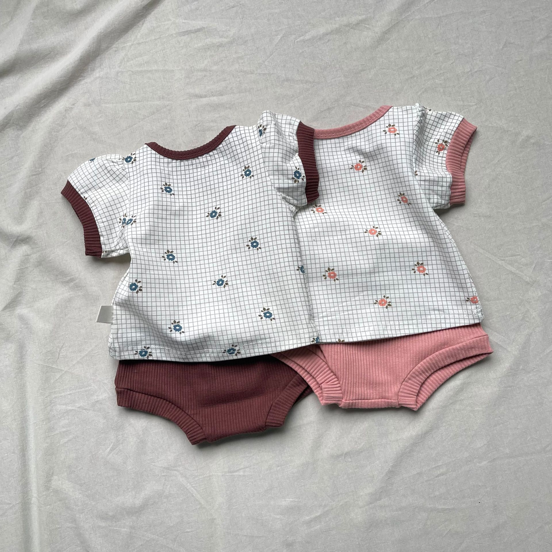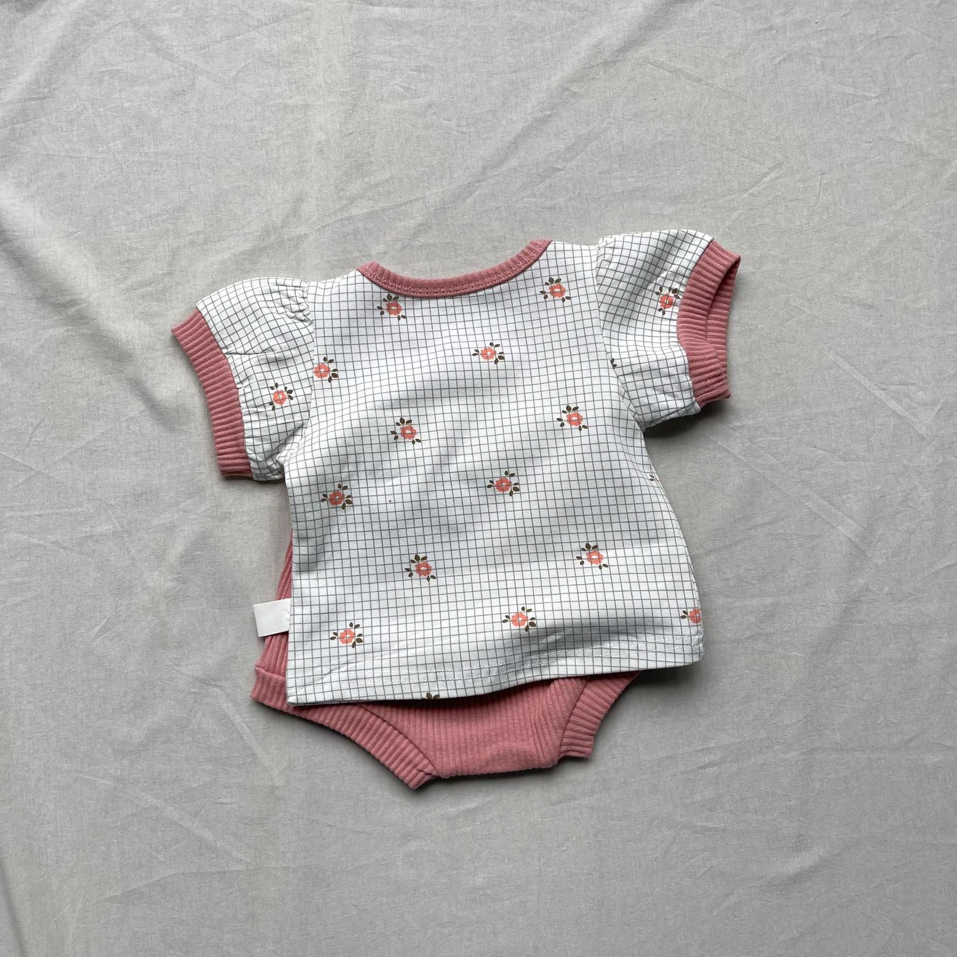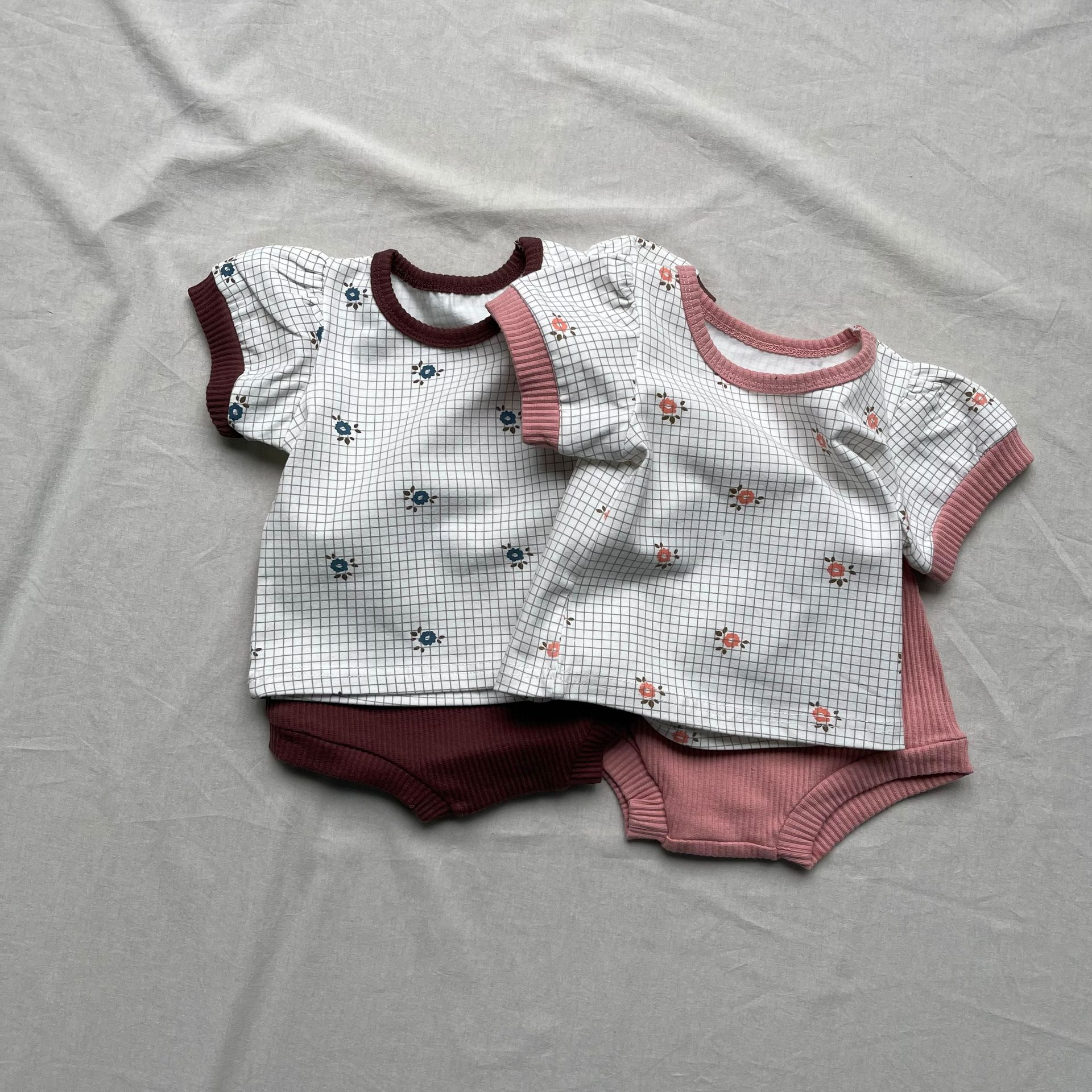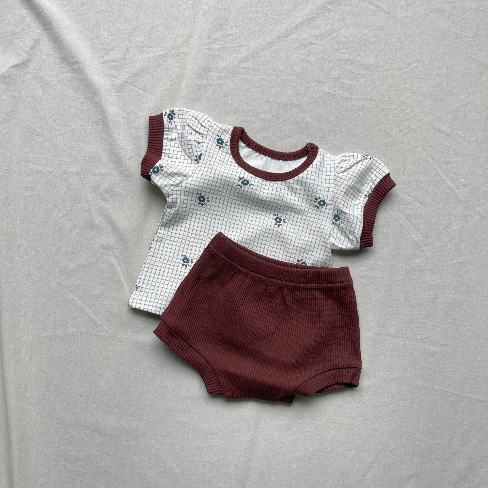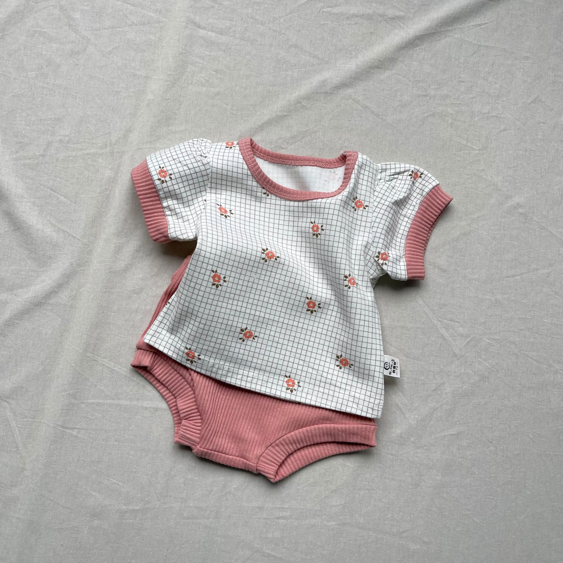 チェックフラワープリント半袖パフスリーブTシャツ+ブルマパンツセットアップ 2点セット【mh0009448】