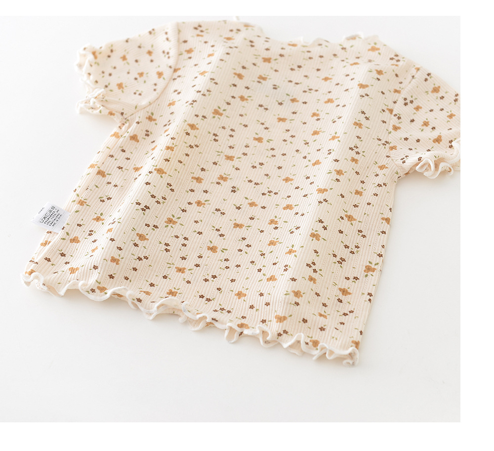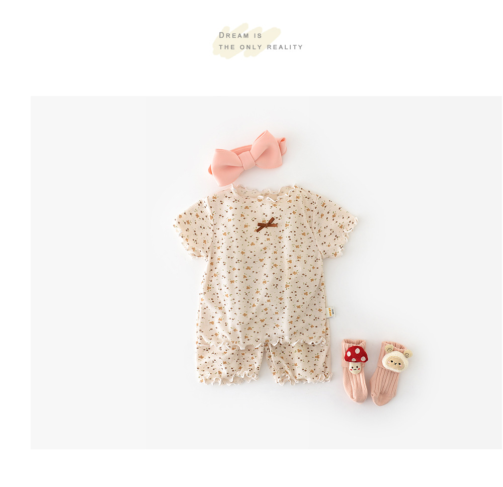 フラワープリントフリル半袖セットアップは、小花柄が全面にあしらわれた、女の子向けの涼しげな上下セットです。トップスはフリル袖と胸元のリボンがアクセントになっており、やさしい印象のプルオーバータイプ。ボトムスは同柄のショートパンツで、ゆったりとしたシルエットが特徴です。軽やかな素材で、夏のおうち時間や外遊びにも適しています。韓国風のナチュラルな雰囲気を取り入れたデザインです。