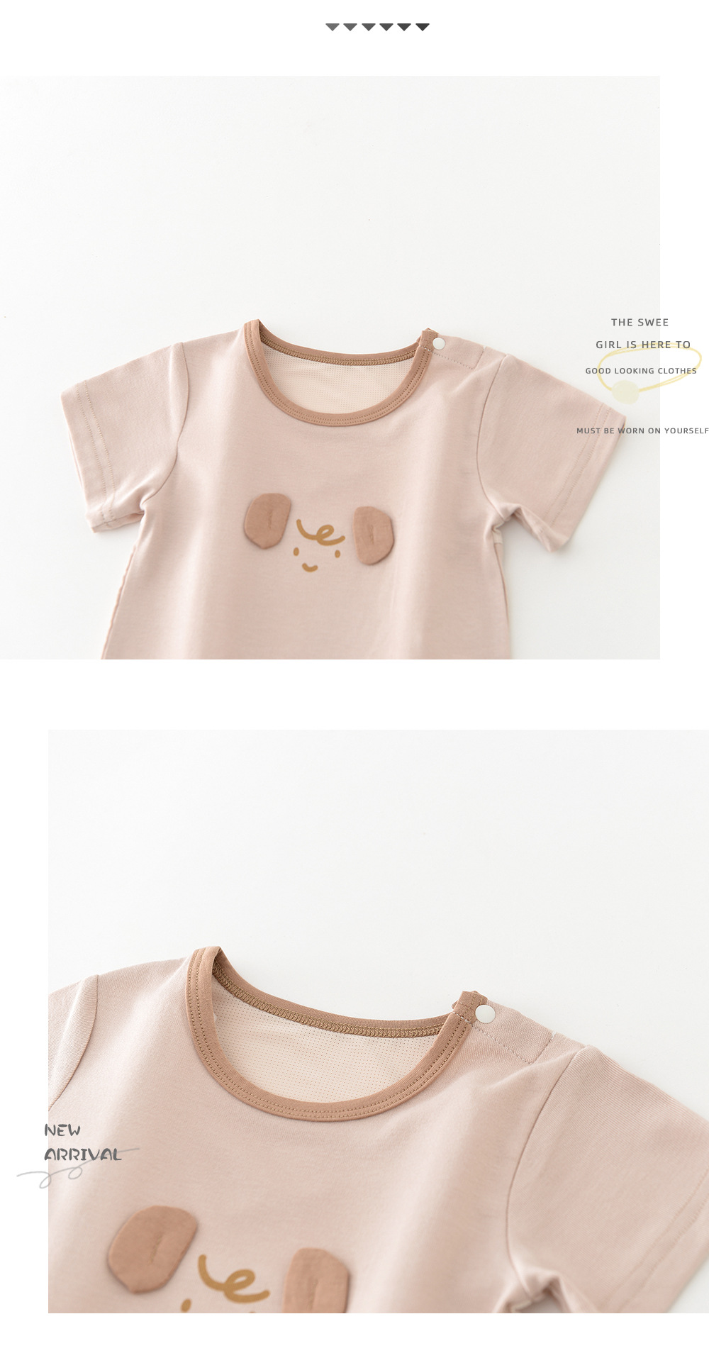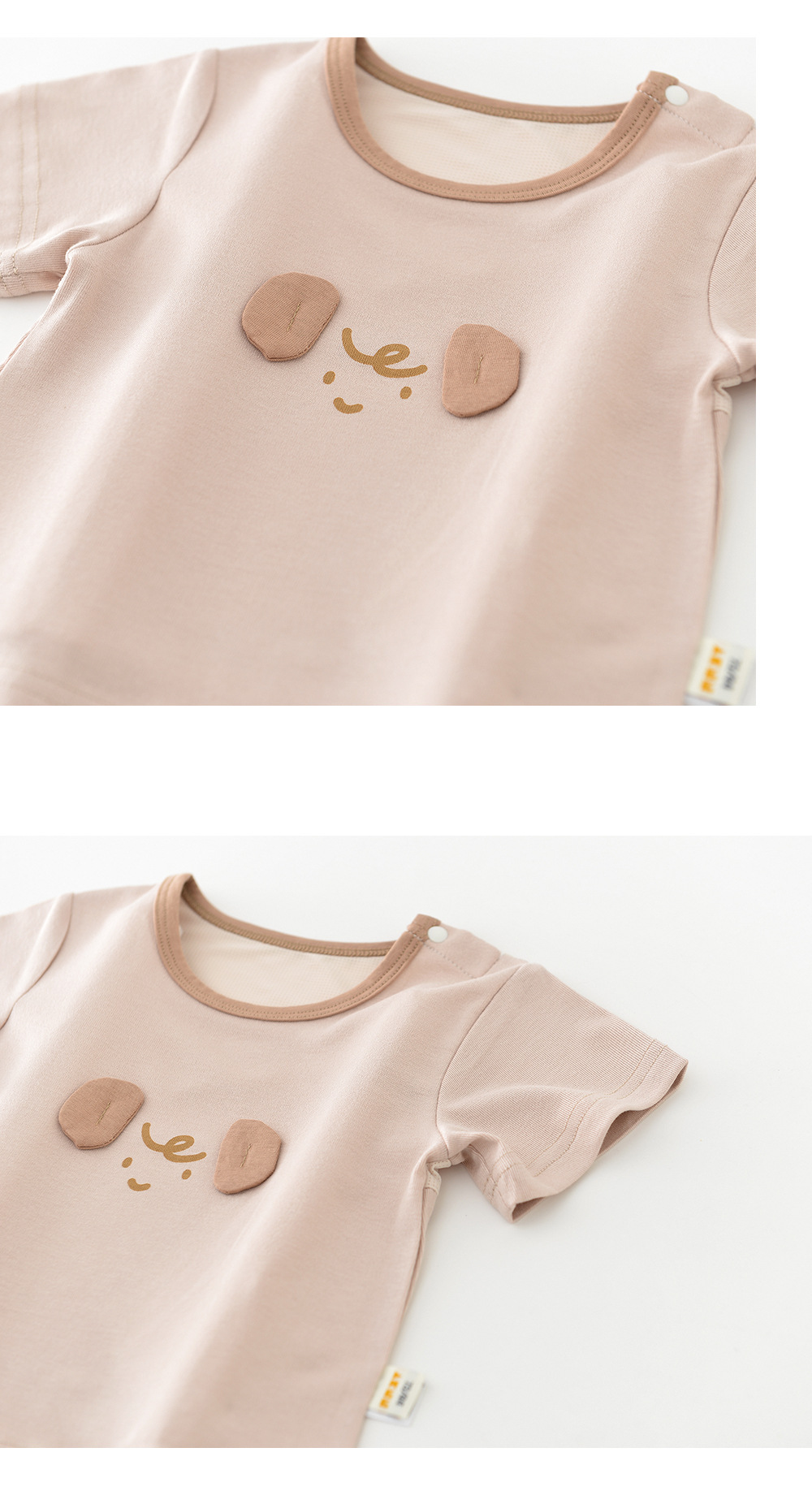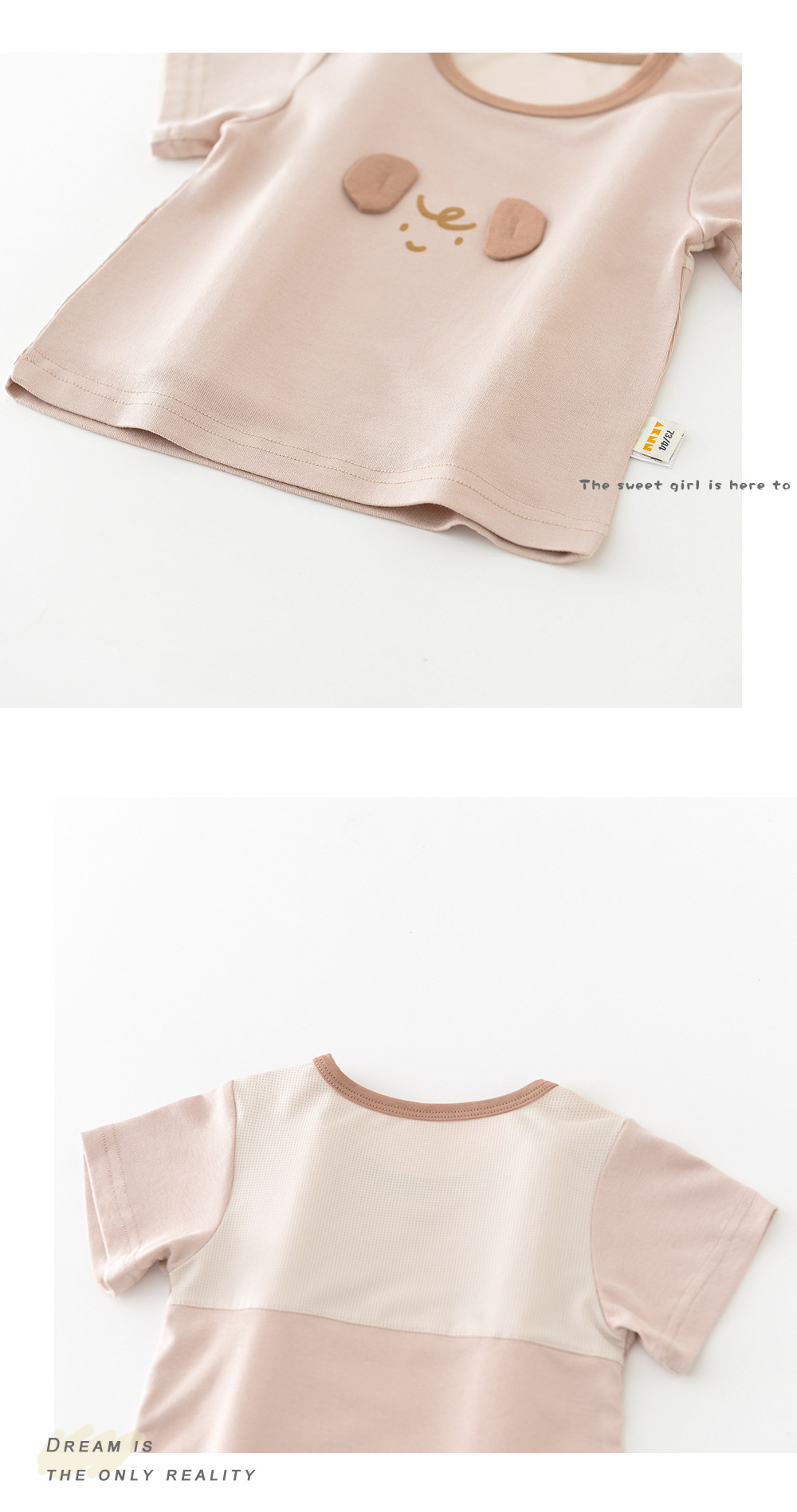 様々な動物たちのアップリケがにぎやかな、ベビー&トドラー向けの半袖Tシャツとショートパンツのセットアップです。韓国らしいポップなデザインで、お子様の好奇心を刺激します。通気性に優れた素材を使用しており、活発なお子様も涼しく快適に過ごせるでしょう。Tシャツには、わんちゃんや猫ちゃんなど、愛らしい動物たちのアップリケが丁寧に縫い付けられています。ショートパンツも動きやすいデザインで、元気いっぱい遊ぶお子様にぴったり。上下セットで簡単におしゃれが楽しめる、おすすめのアイテムです。
