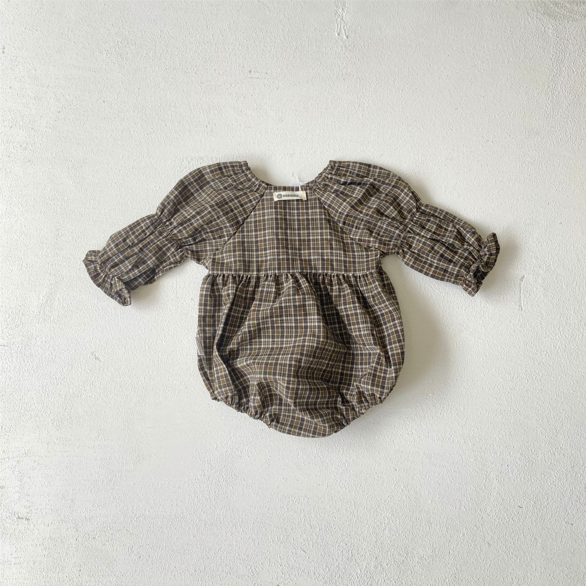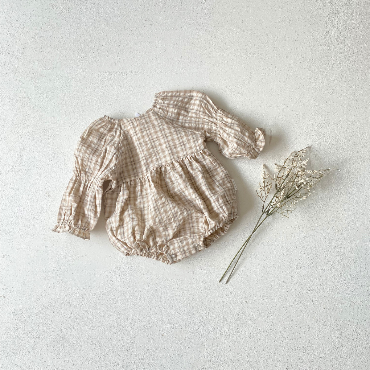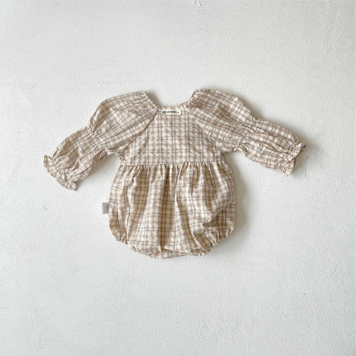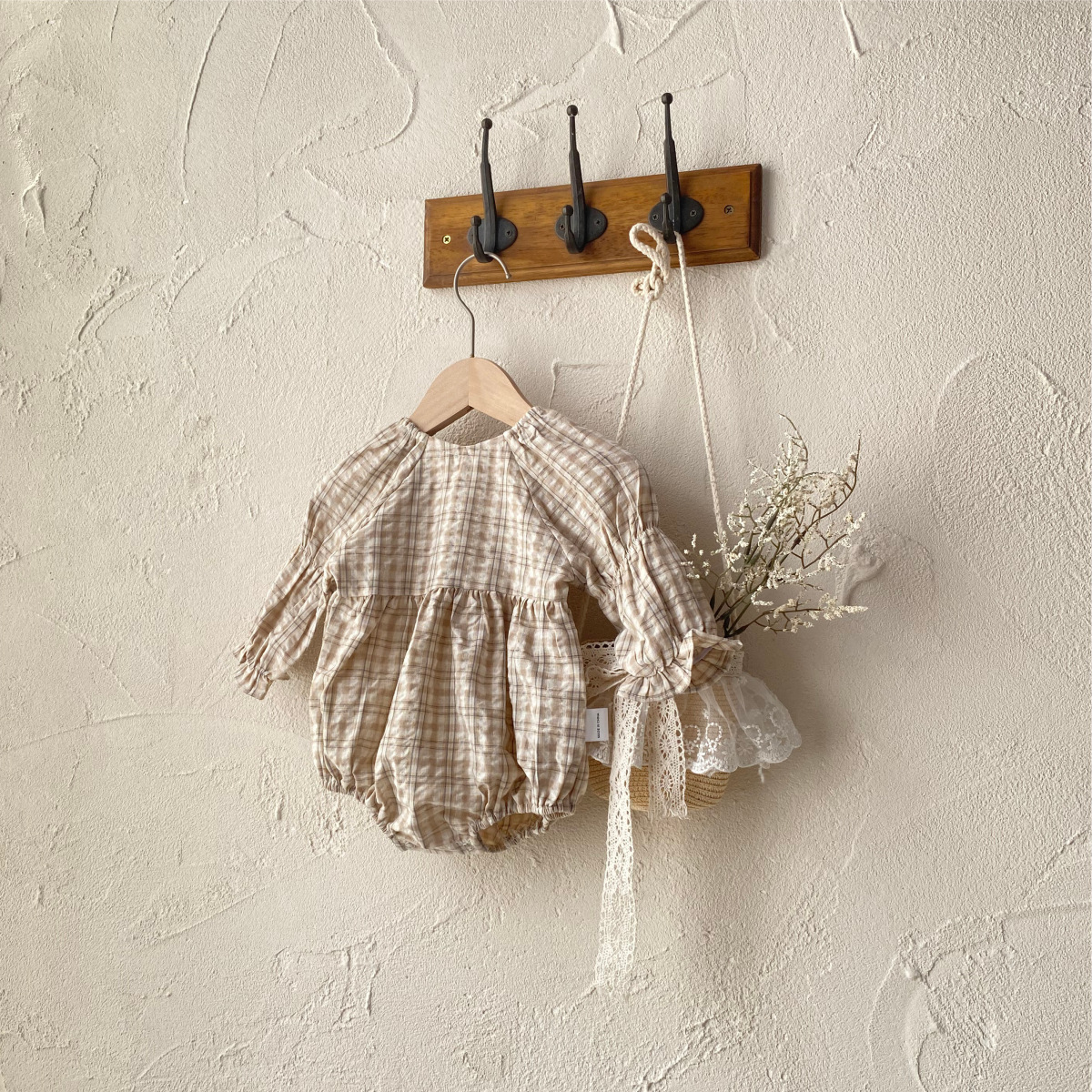 レトロチェックベルスリーブ長袖ロンパース【mh0009674】