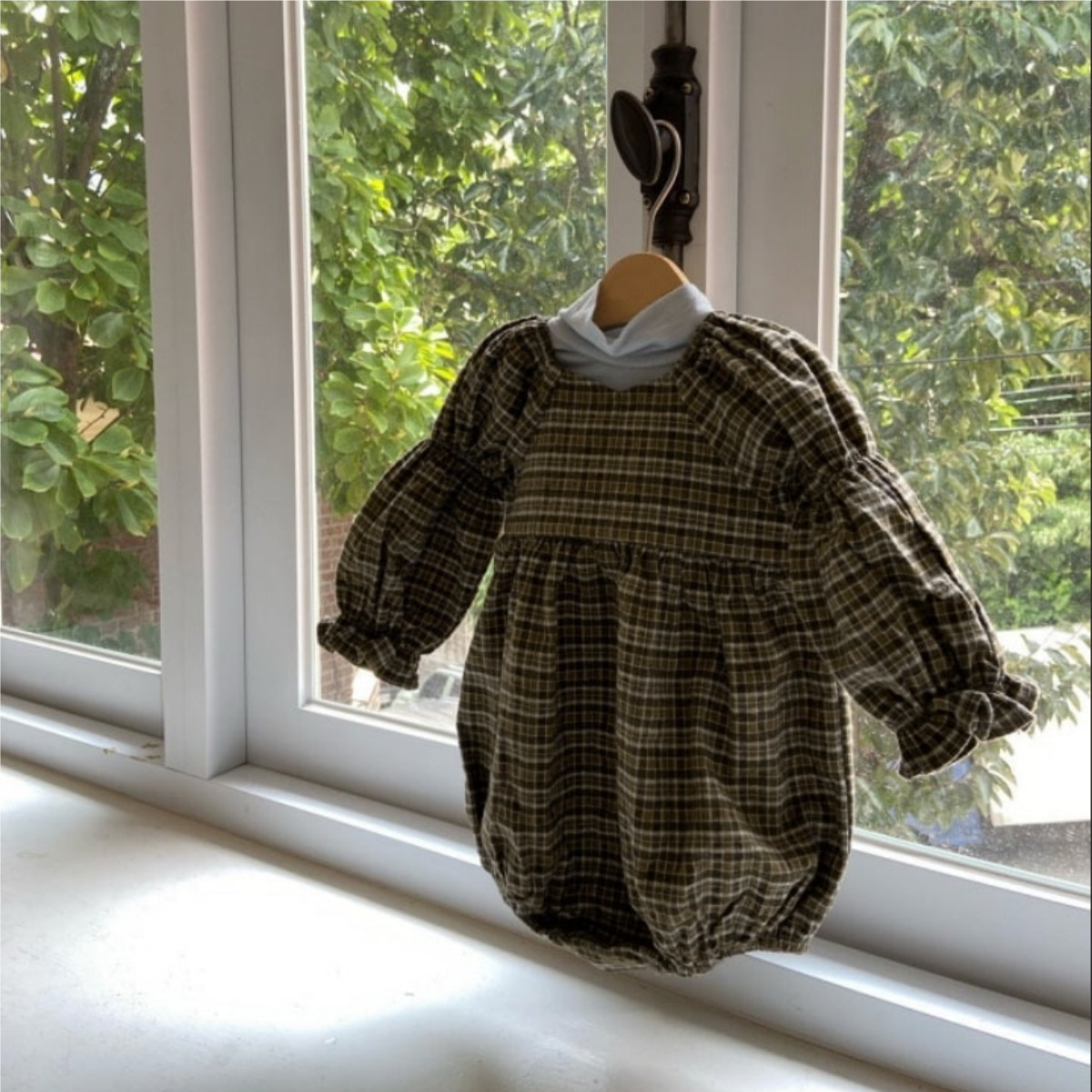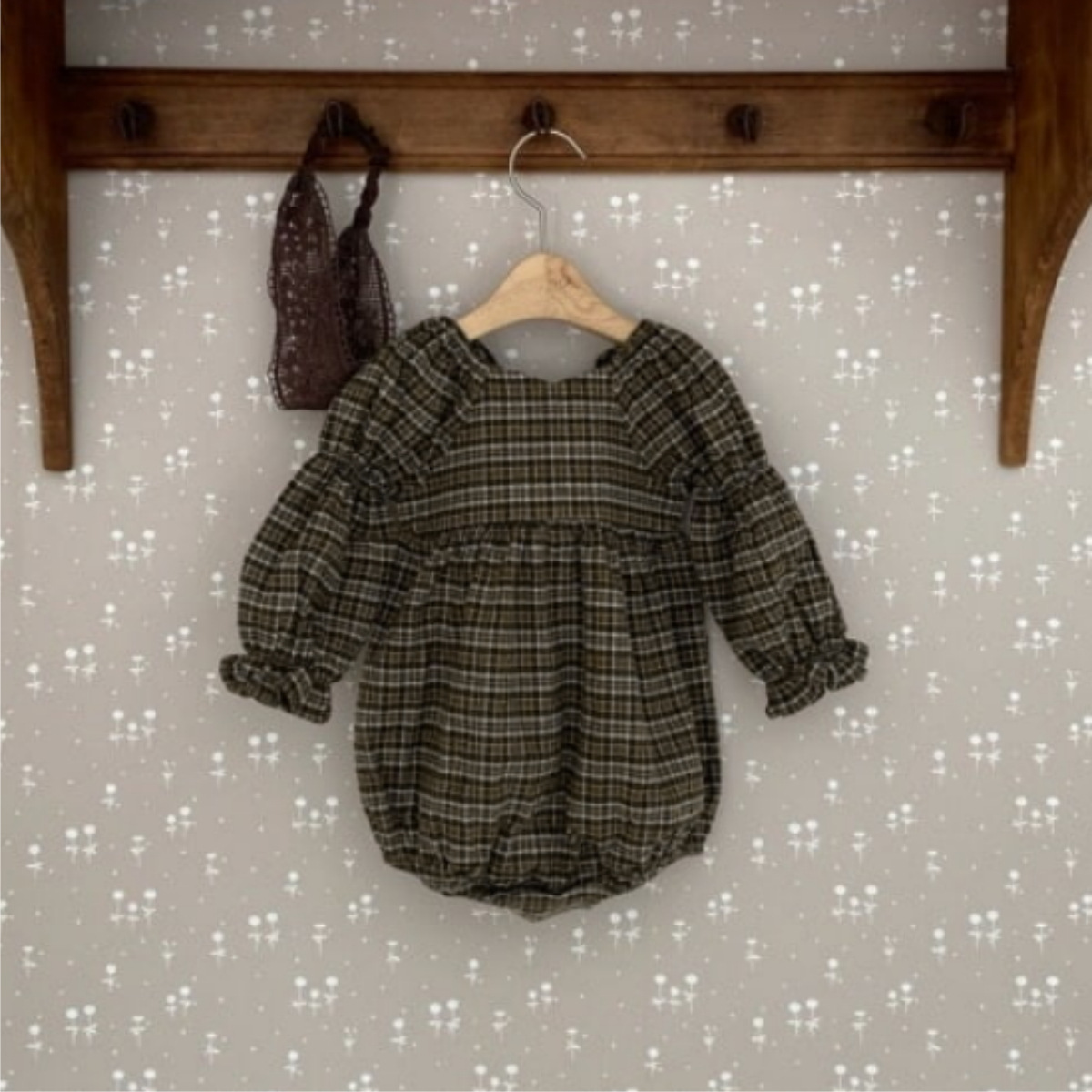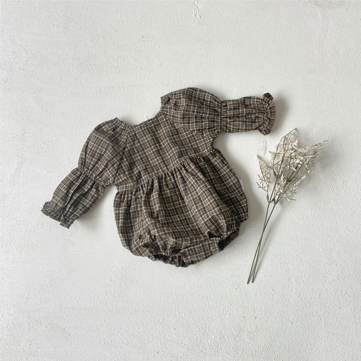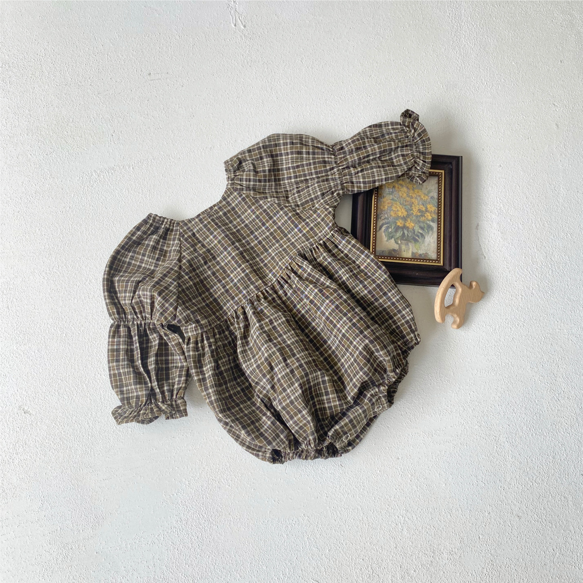 レトロチェックベルスリーブ長袖ロンパース【mh0009674】