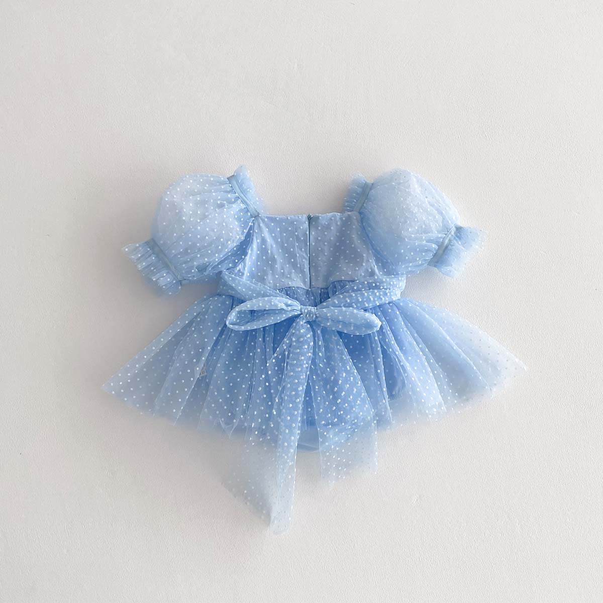 ふんわりとしたパフスリーブが愛らしく、肌触りの良い素材で暑い夏でもベビーが快適に過ごせます。胸元から広がるチュールスカートには、上品なピンドット(水玉模様)が散りばめられており、動くたびに軽やかに揺れて、まるで小さなケーキドレスのよう。ベビーの可愛らしさを一層引き立ててくれます。