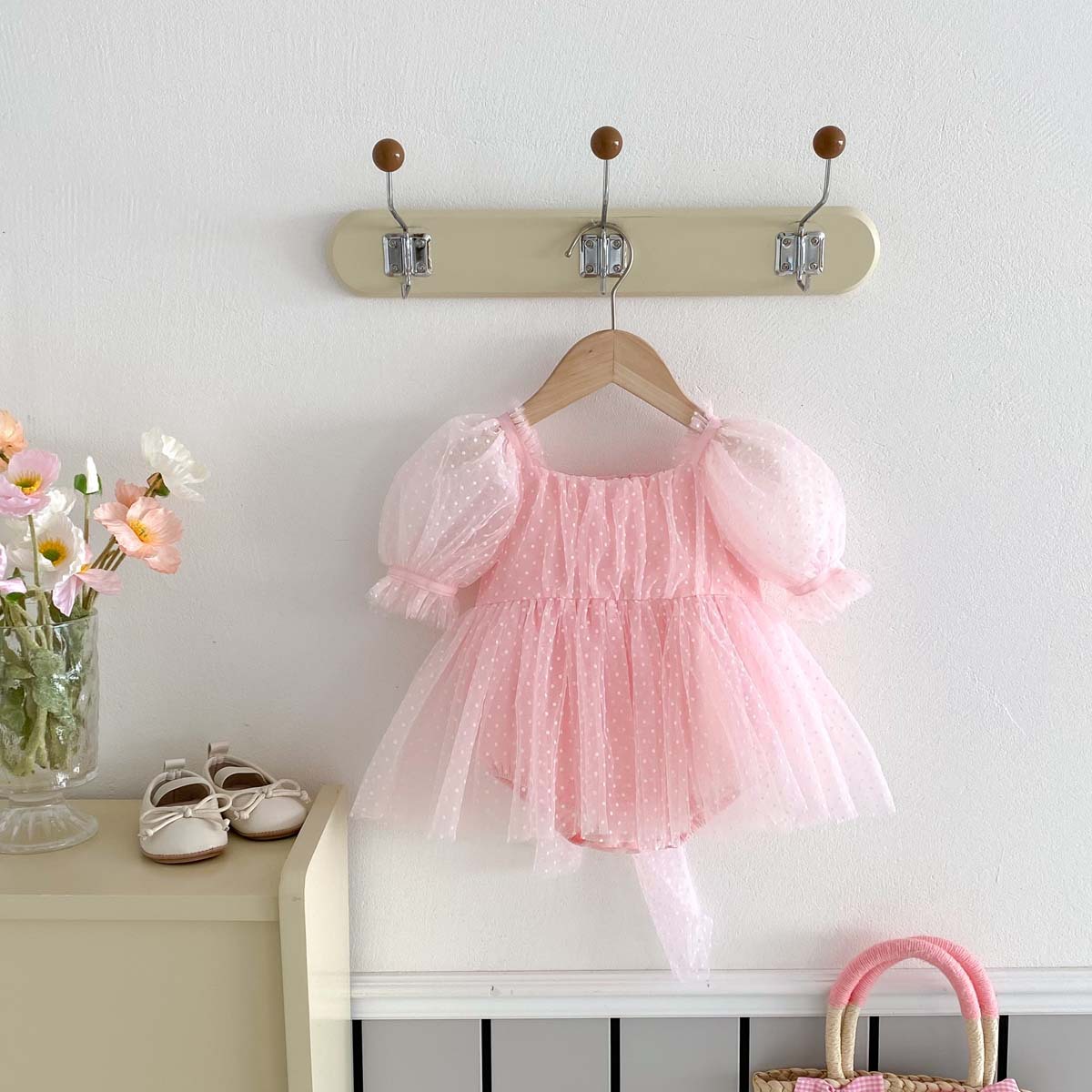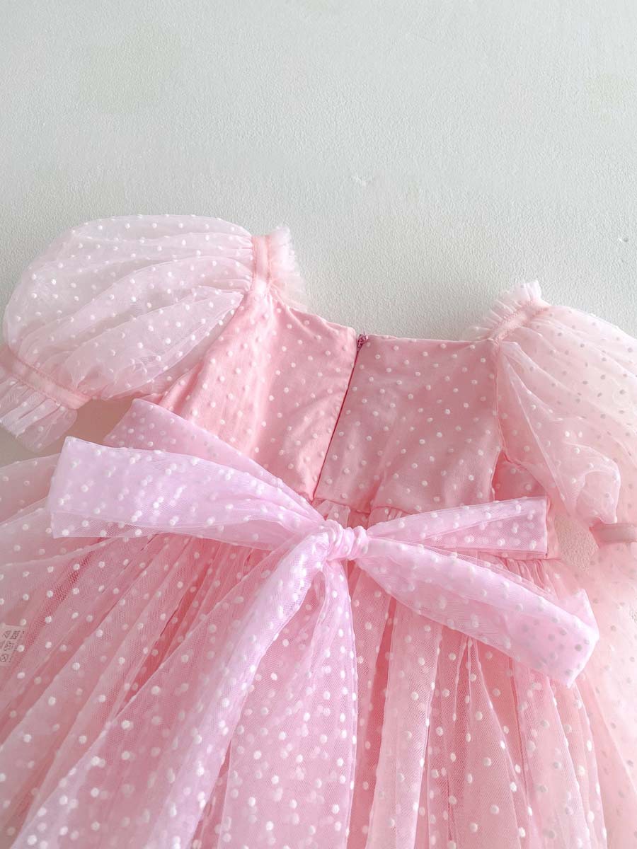 夏のベビーガールにぴったりの、ピンドットチュール半袖パフスリーブドレスロンパースです。まるで小さなプリンセスのような、甘く可愛らしい一着で、初めてのお誕生日や記念日にも最適です。