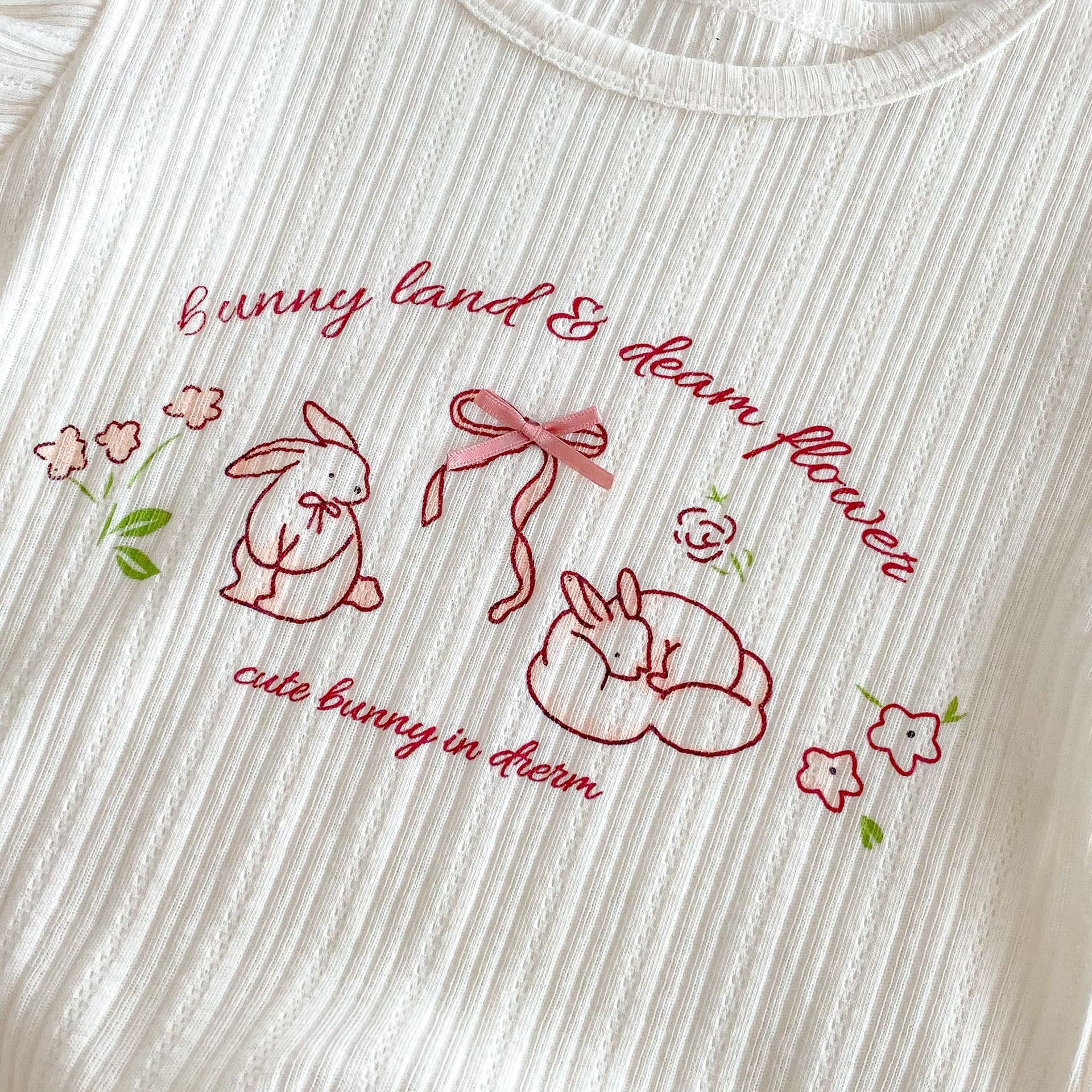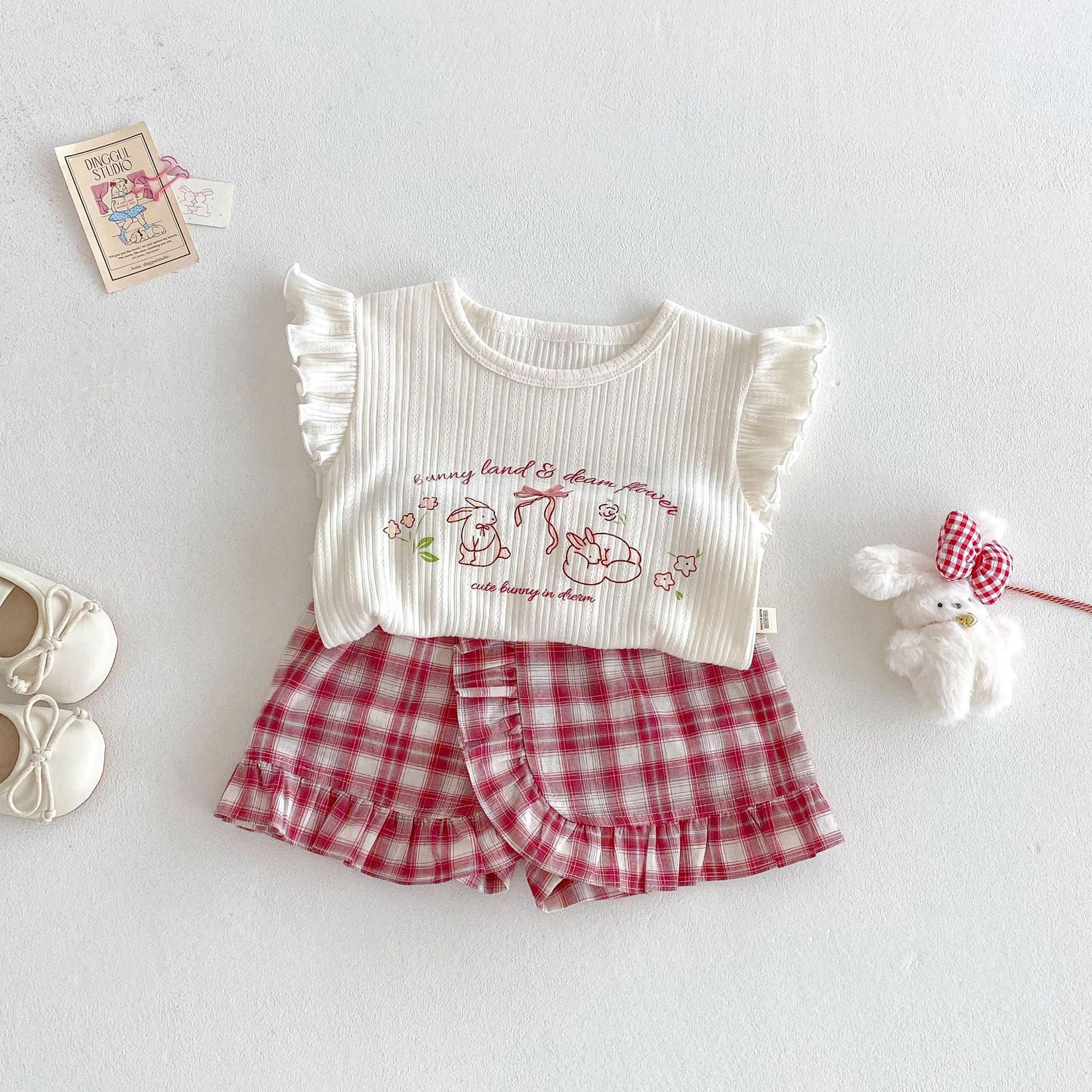 バニープリントフリルスリーブTシャツとチェック巻きスカートショートパンツのセットアップは、夏の女の子にぴったりの2点セットです。