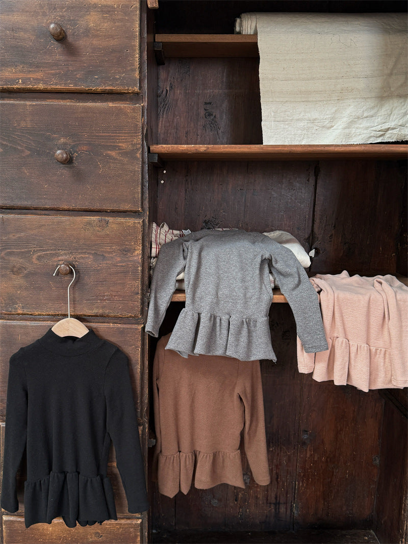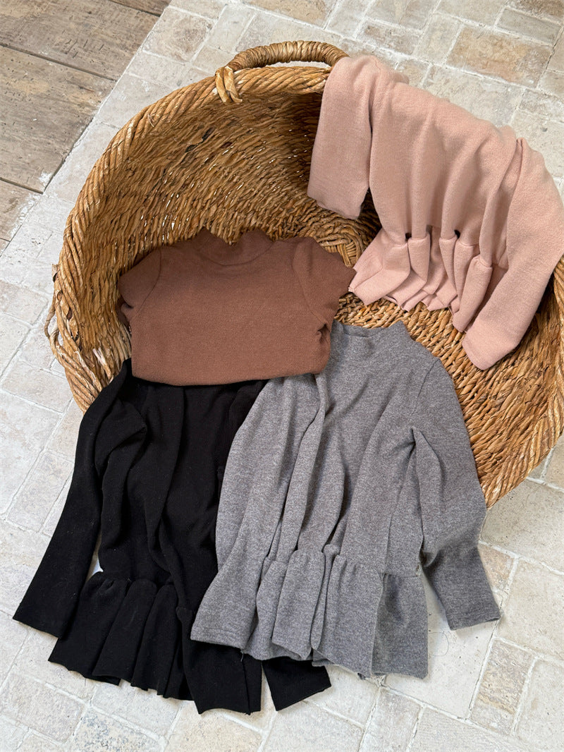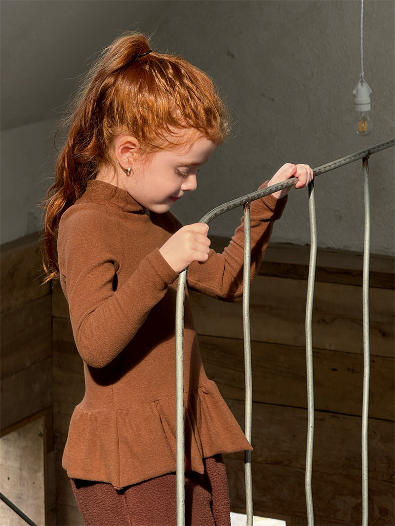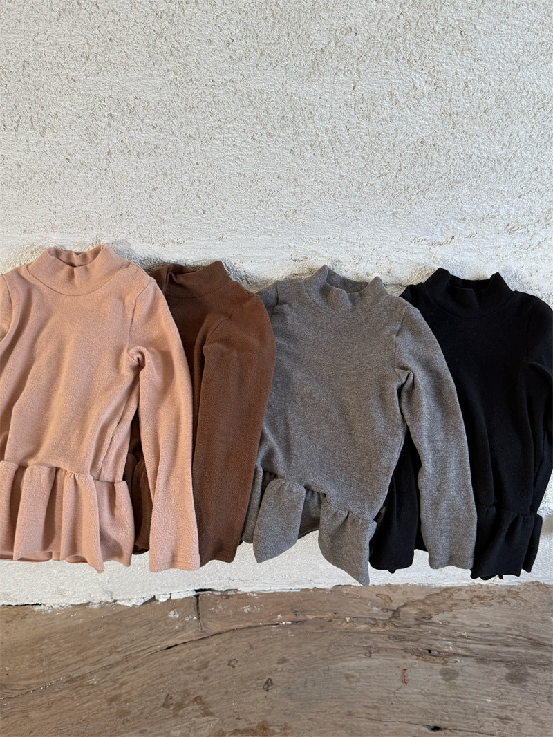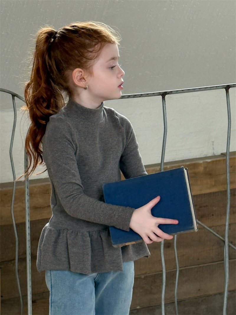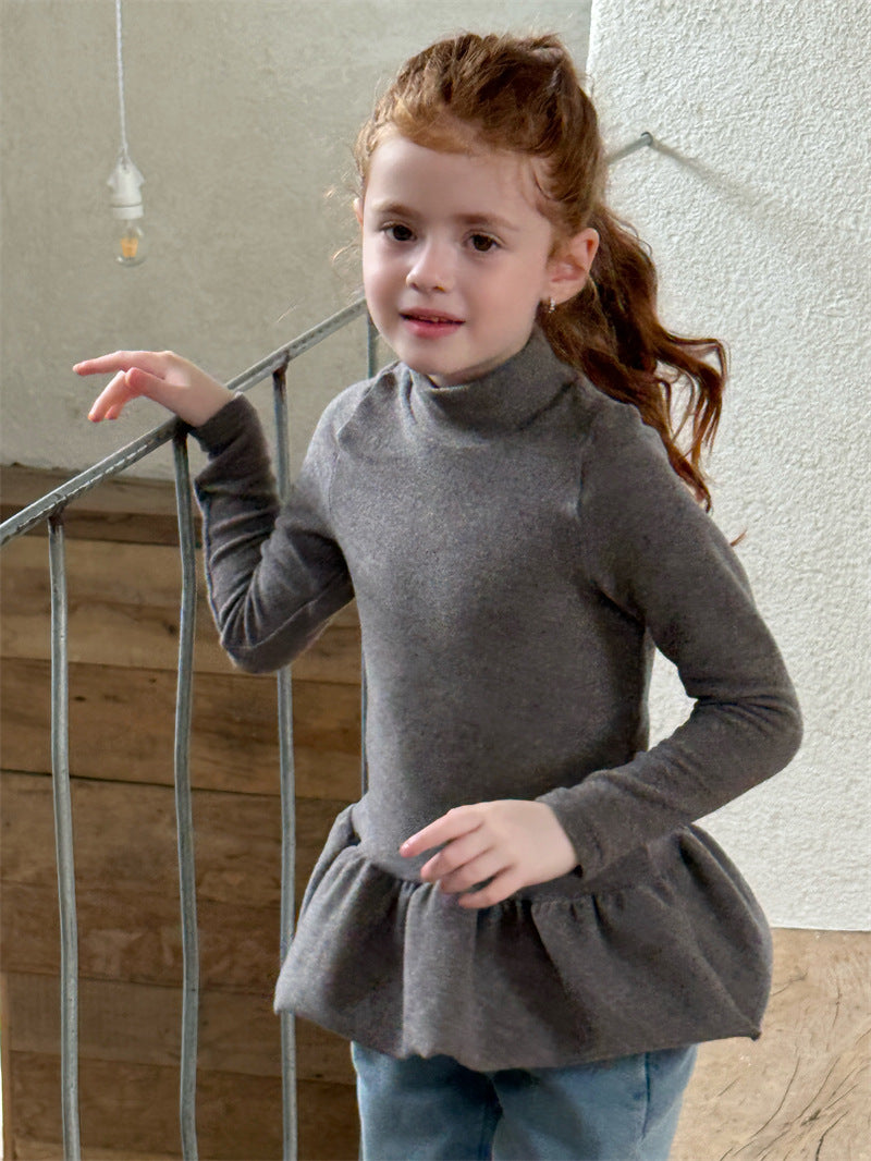 暖かな裏起毛素材を使用した、寒い季節にぴったりの快適な長袖トップス。シンプルなハイネックのデザインに、裾のペプラムフリルが愛らしいアクセントを添え、レイヤードスタイルを華やかに彩ります。ストレッチ性に優れた生地で動きやすく、一枚で着てもワンピースやジャンパースカートのインナーとしても活躍する、着回し力の高い子ども服のベースシャツです。