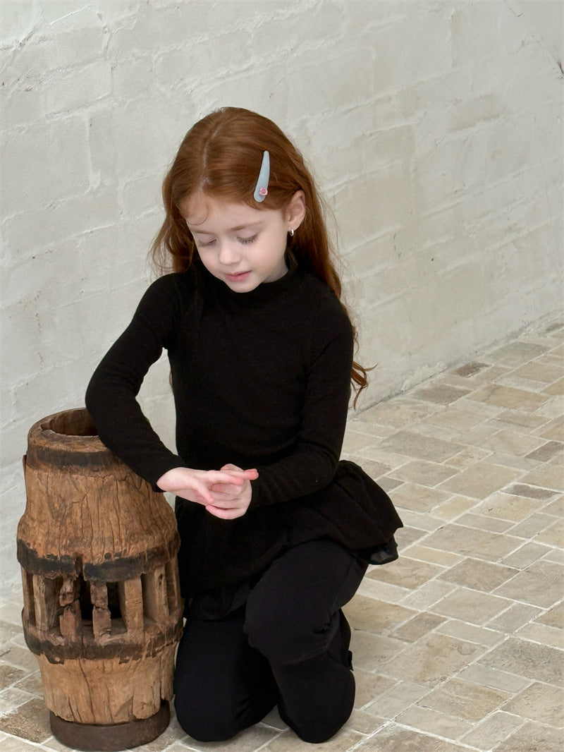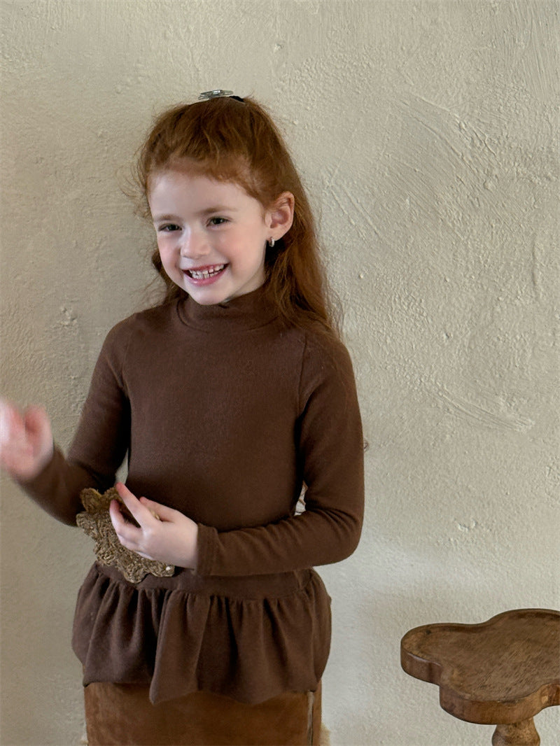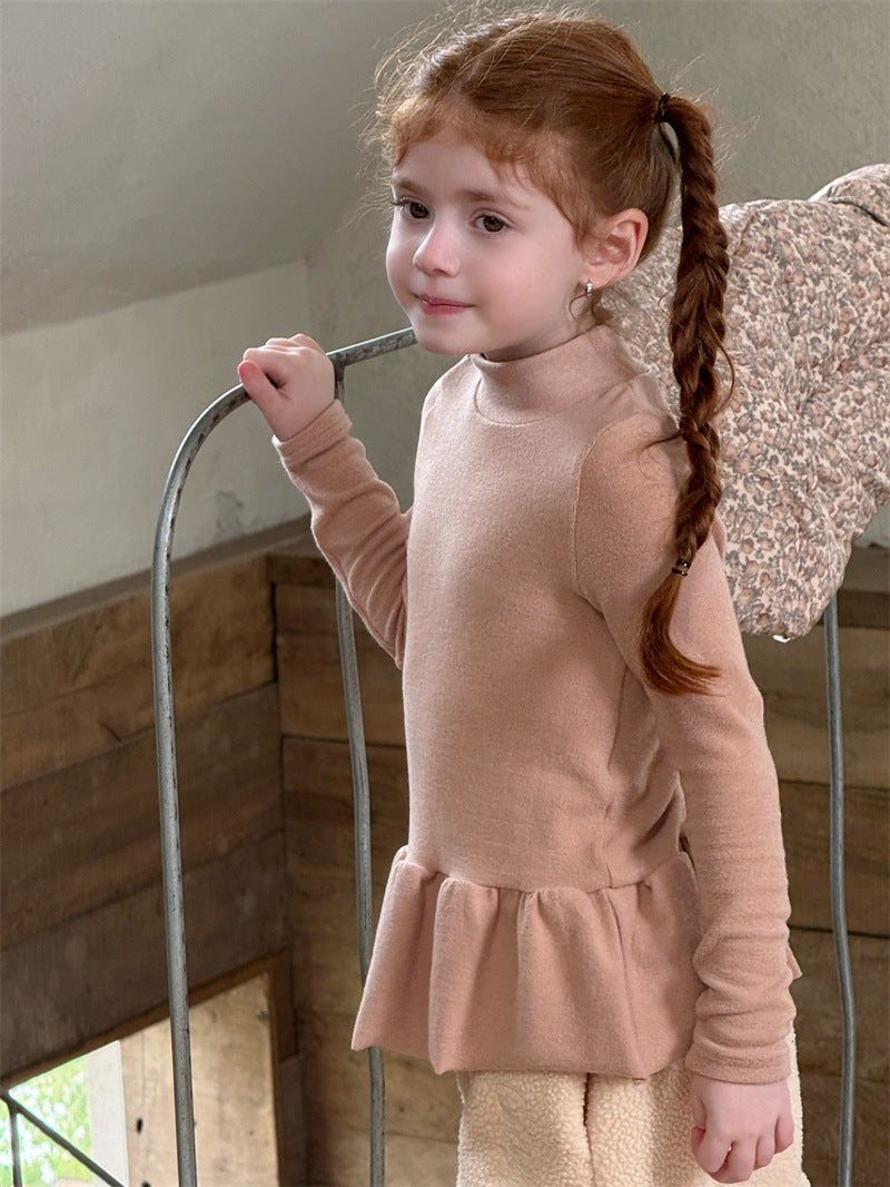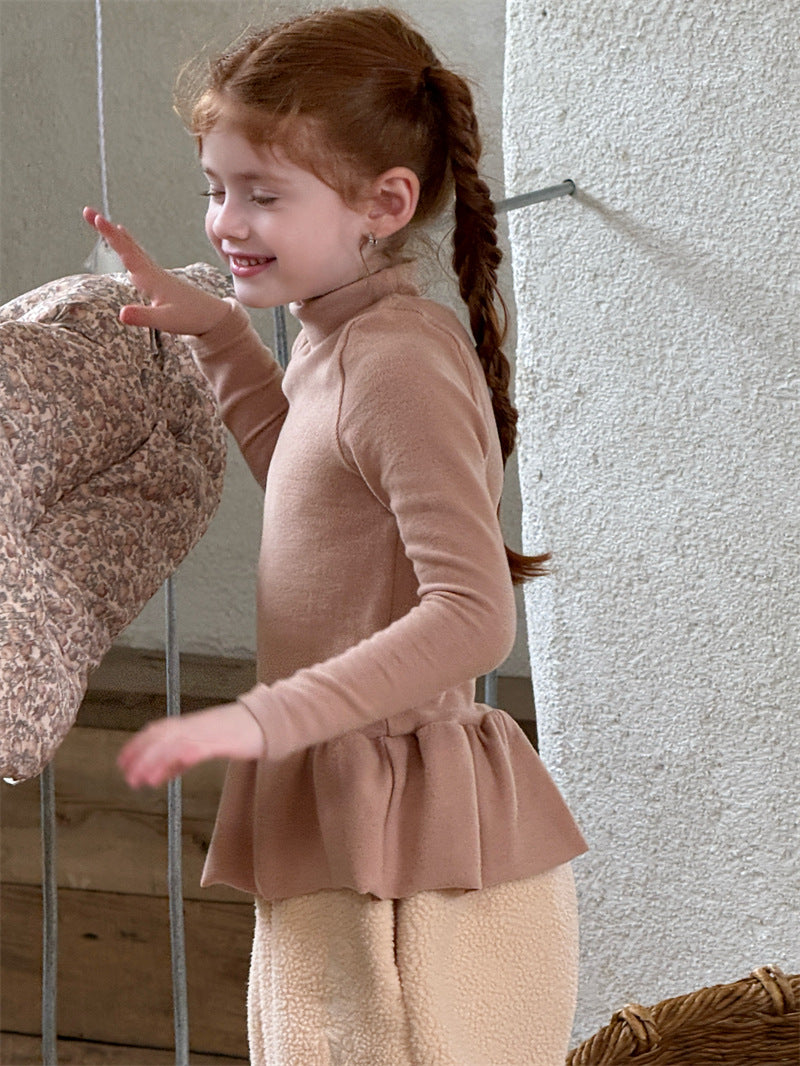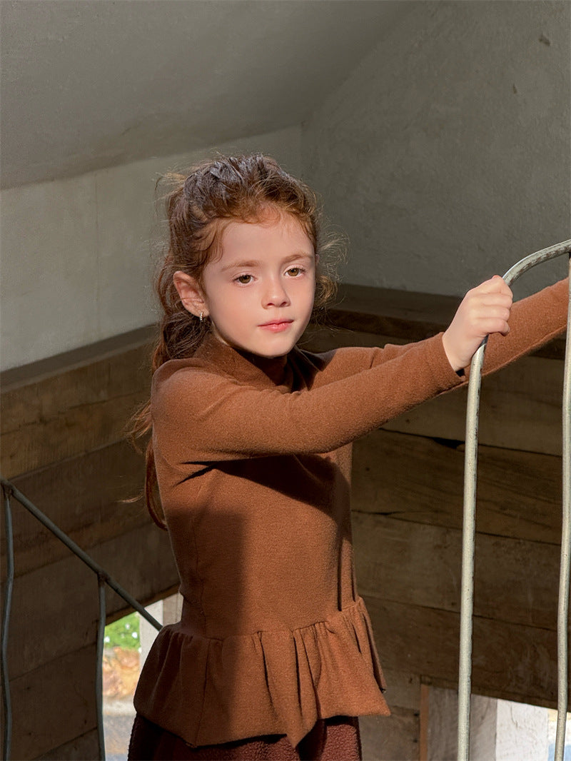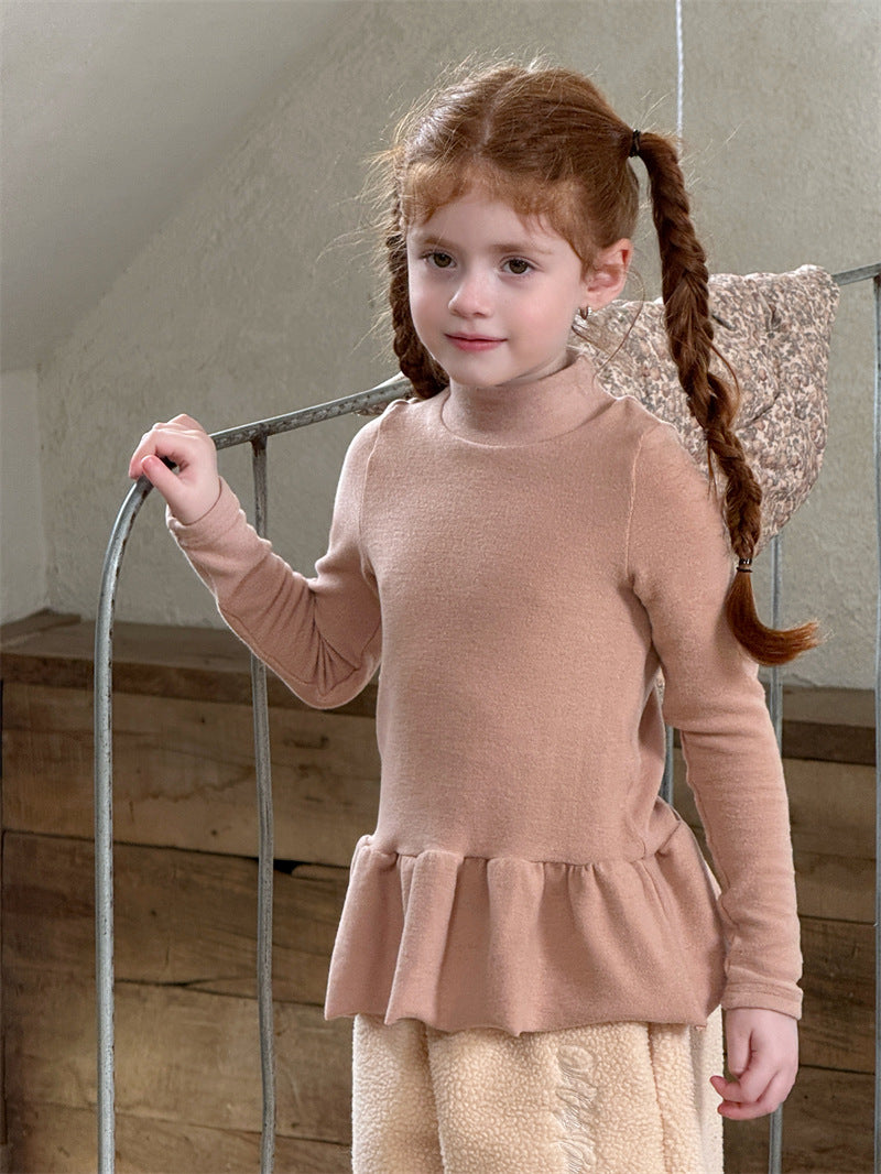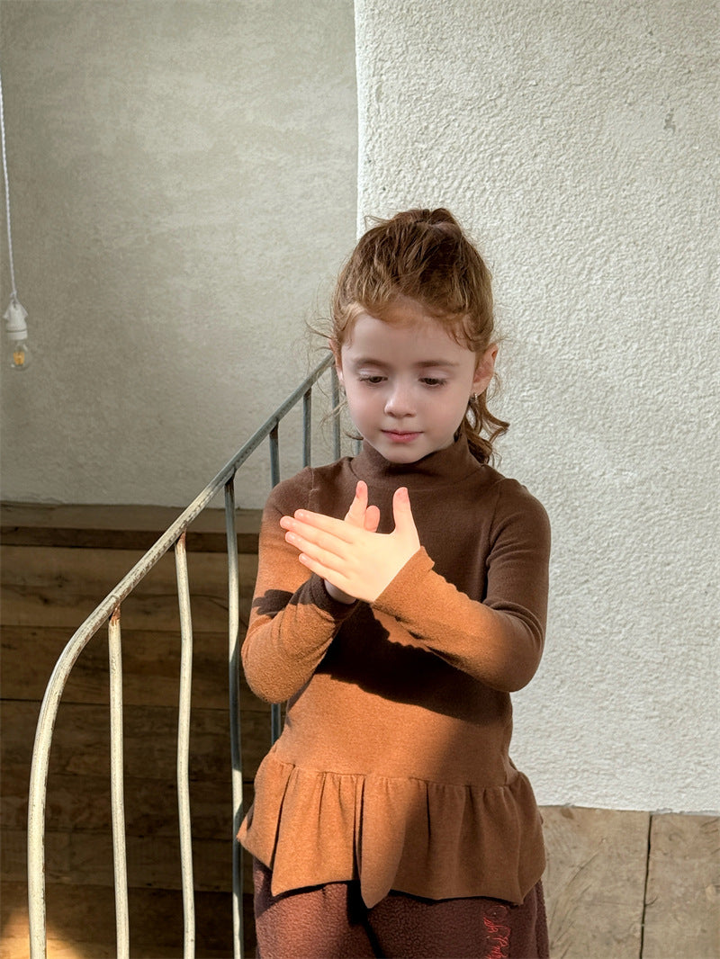 暖かな裏起毛素材を使用した、寒い季節にぴったりの快適な長袖トップス。シンプルなハイネックのデザインに、裾のペプラムフリルが愛らしいアクセントを添え、レイヤードスタイルを華やかに彩ります。ストレッチ性に優れた生地で動きやすく、一枚で着てもワンピースやジャンパースカートのインナーとしても活躍する、着回し力の高い子ども服のベースシャツです。