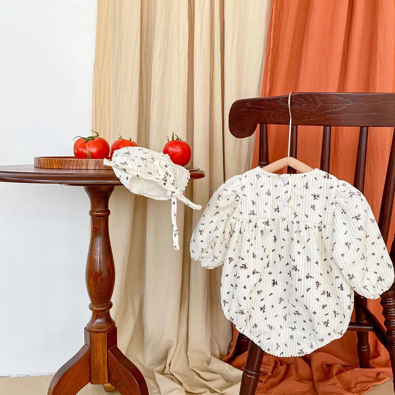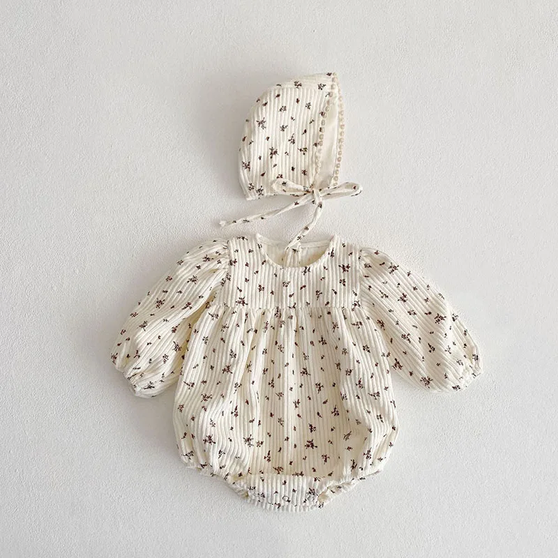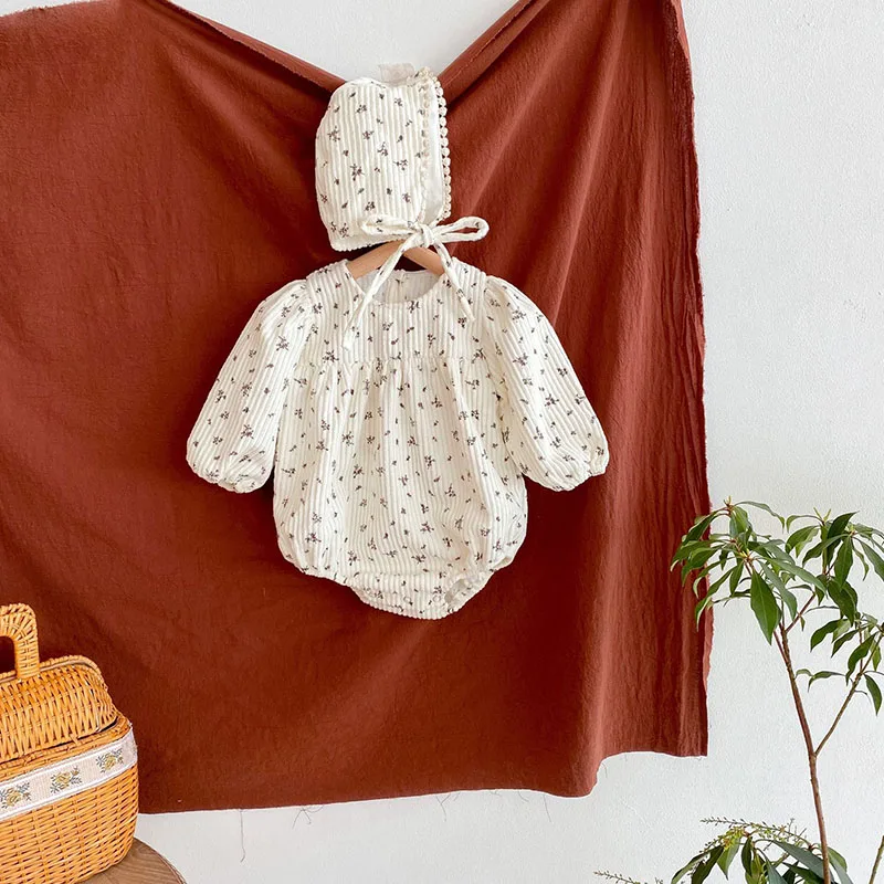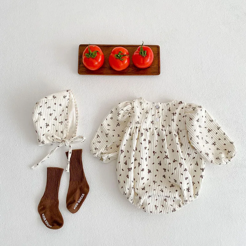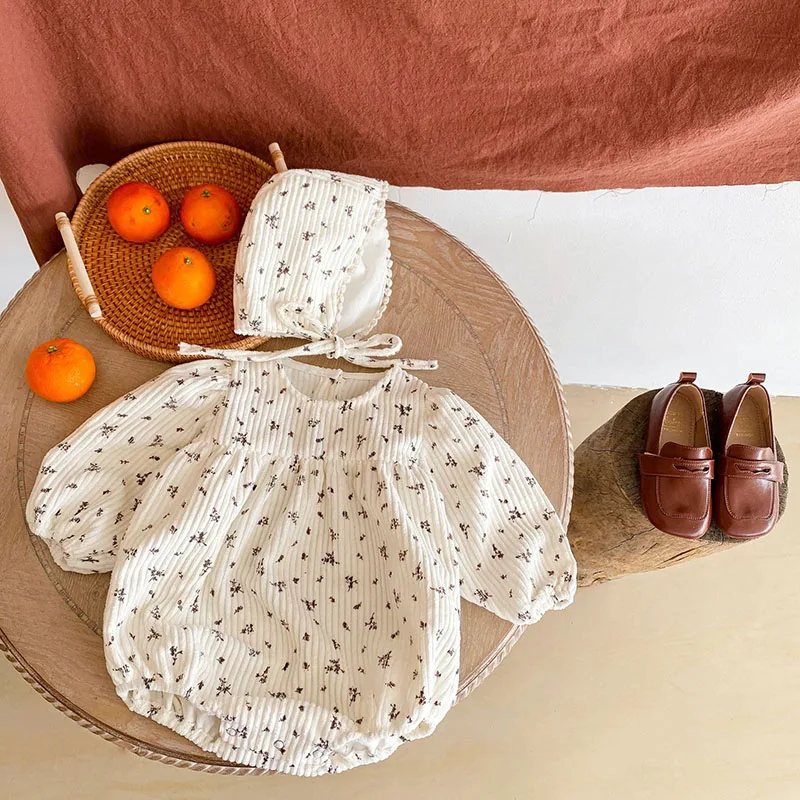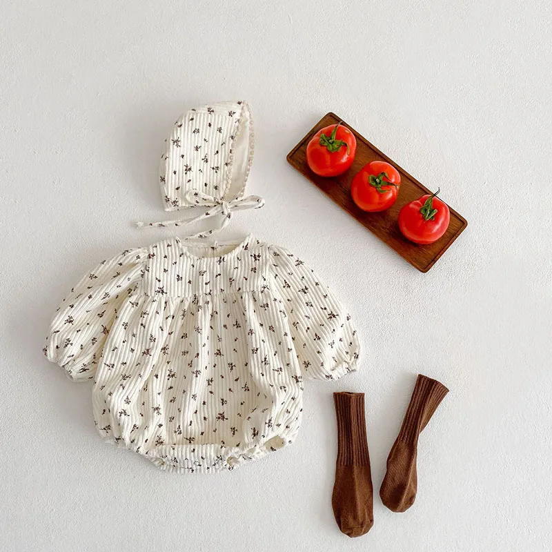 Baby Corduroy Flower Long Sleeve Romper Bonnet Set