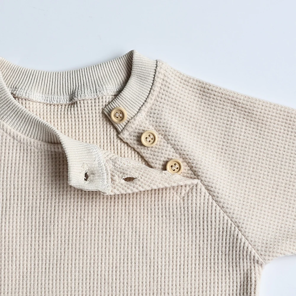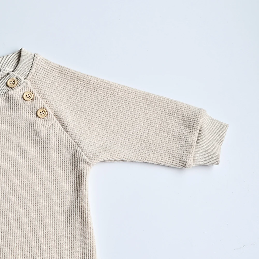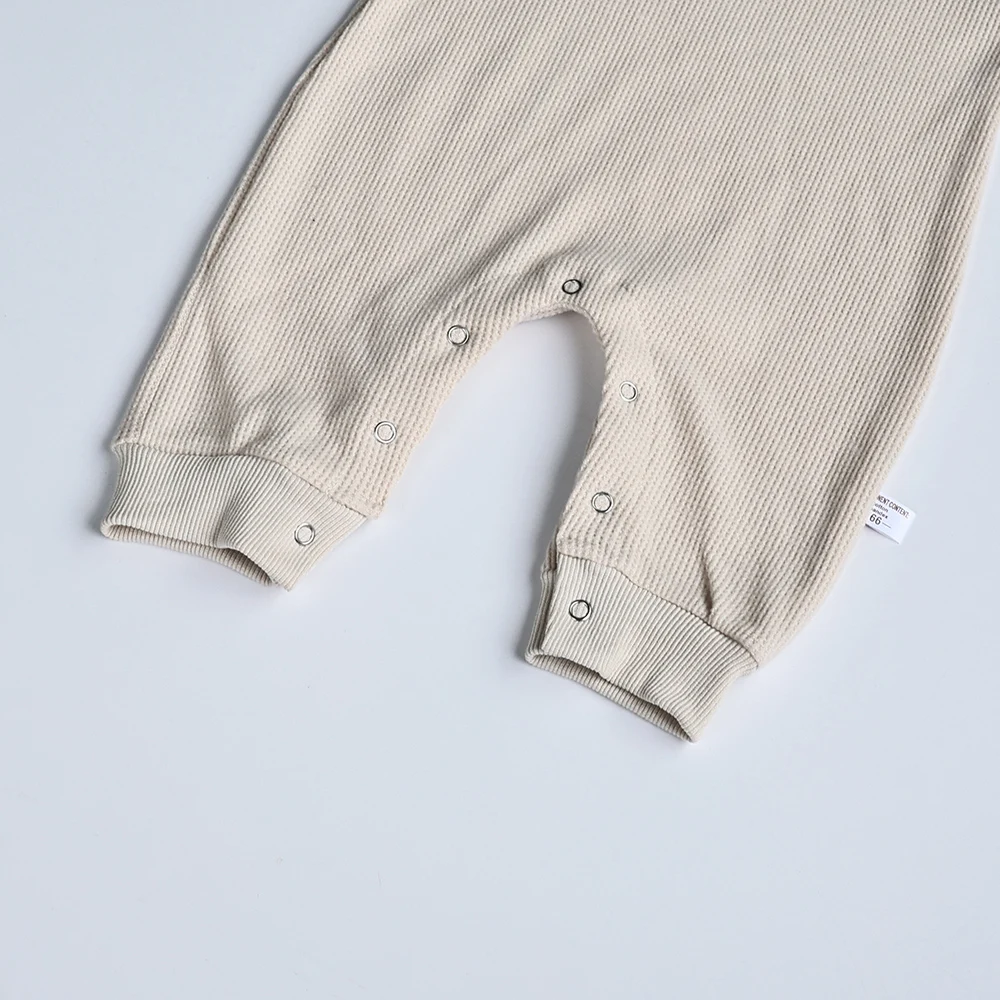 Casual baby clothes for kids. The long-sleeved jumpsuit is made of soft cotton material that can be enjoyed by both boys and girls, and features a simple basic design and a soft coffee beige color.