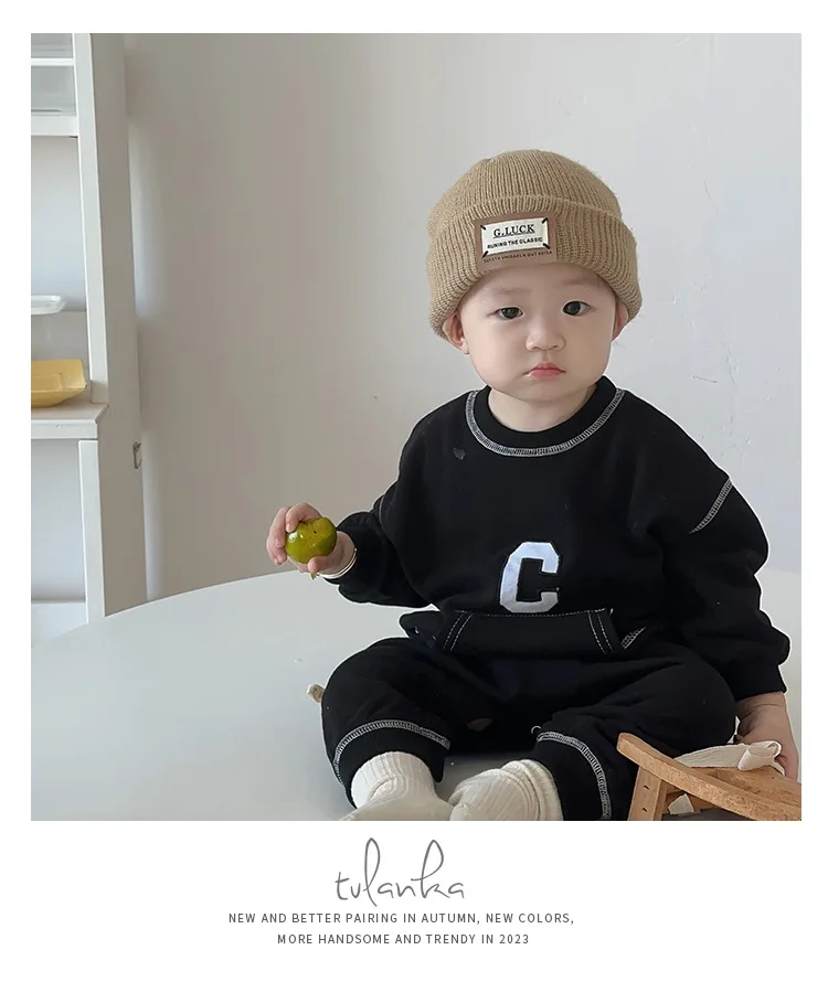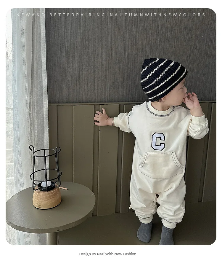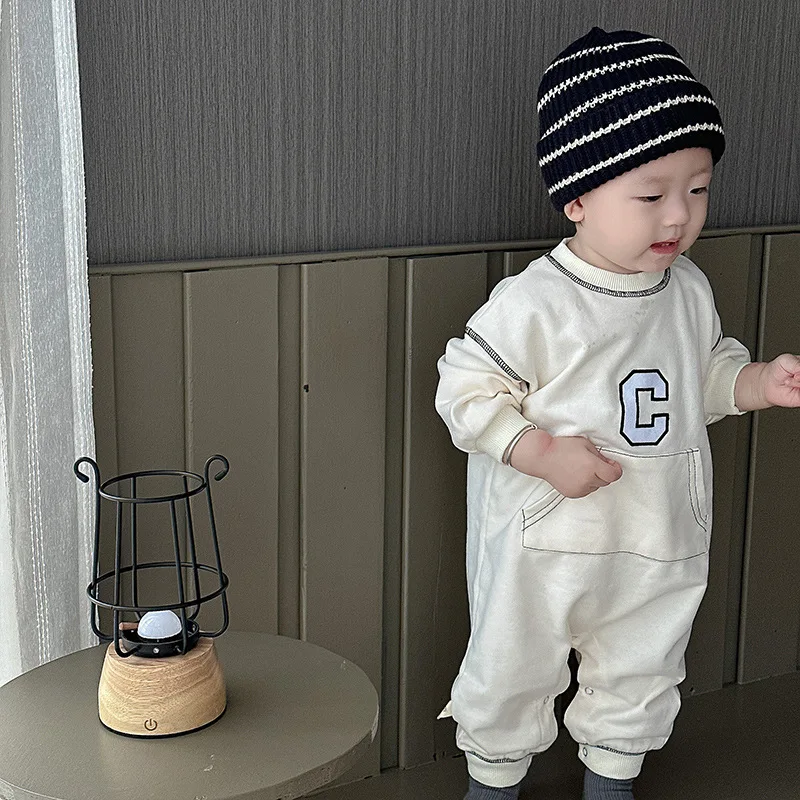Baby rompers, long sleeve jumpsuit, pockets, letter logo accent, beige/black/2 colors