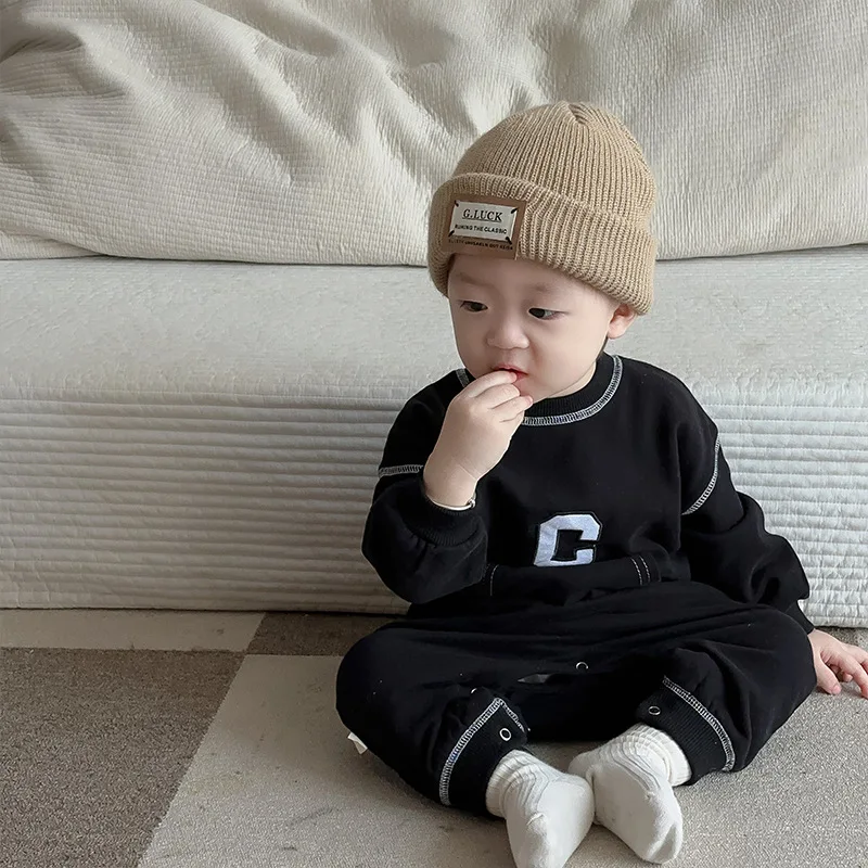 Introducing a new design of baby rompers that will bring warmth to chilly days. The long-sleeved jumpsuit is available in two colors, beige and black. The pocket and letter logo are stylish accents. Designed for your child's ease of movement, it is extremely comfortable to wear and functional. Perfect for everyday outings and relaxing at home.