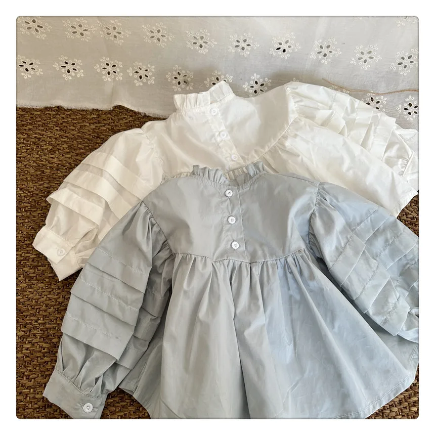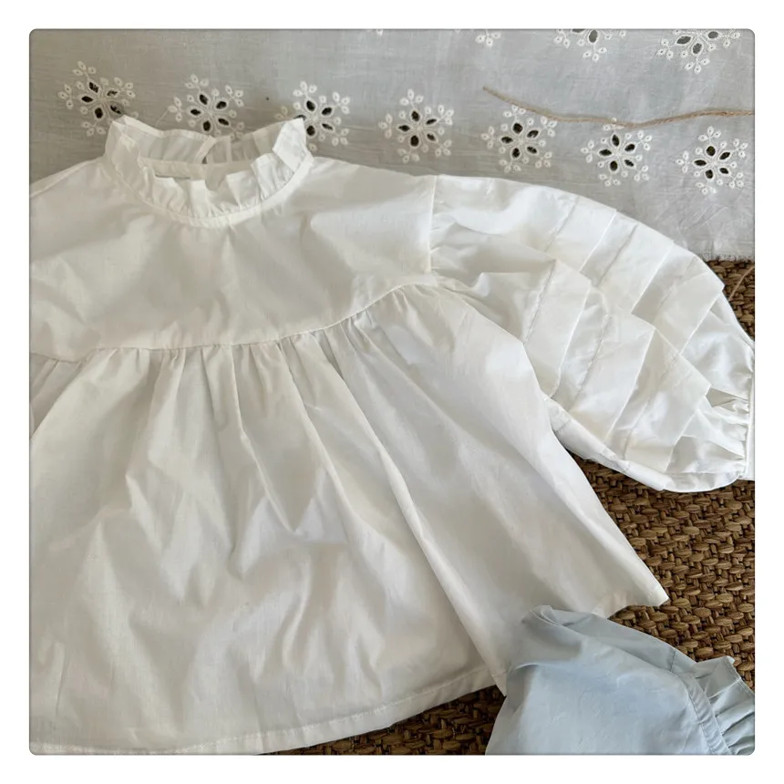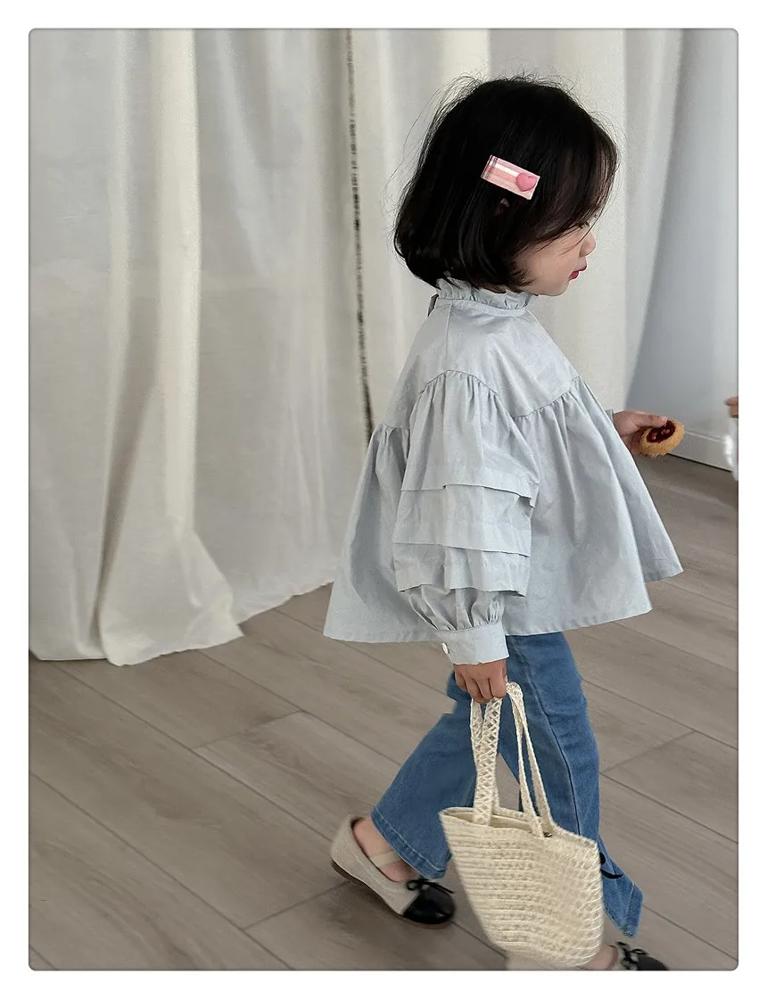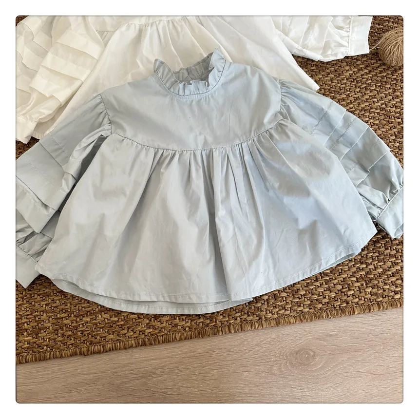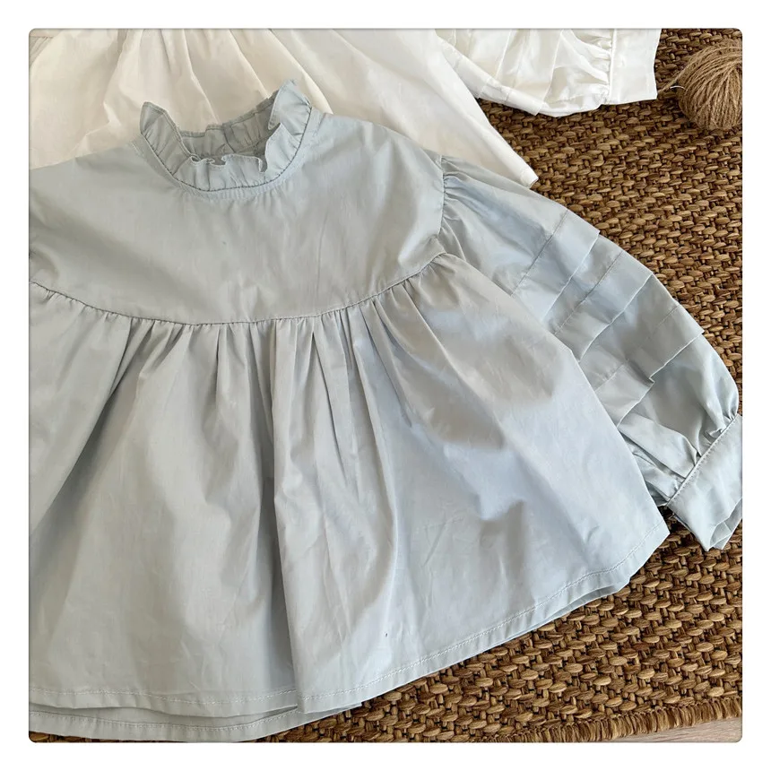 #kids fashion #long sleeve blouse #ruffled stand collar #stylish kids clothes #white #light blue