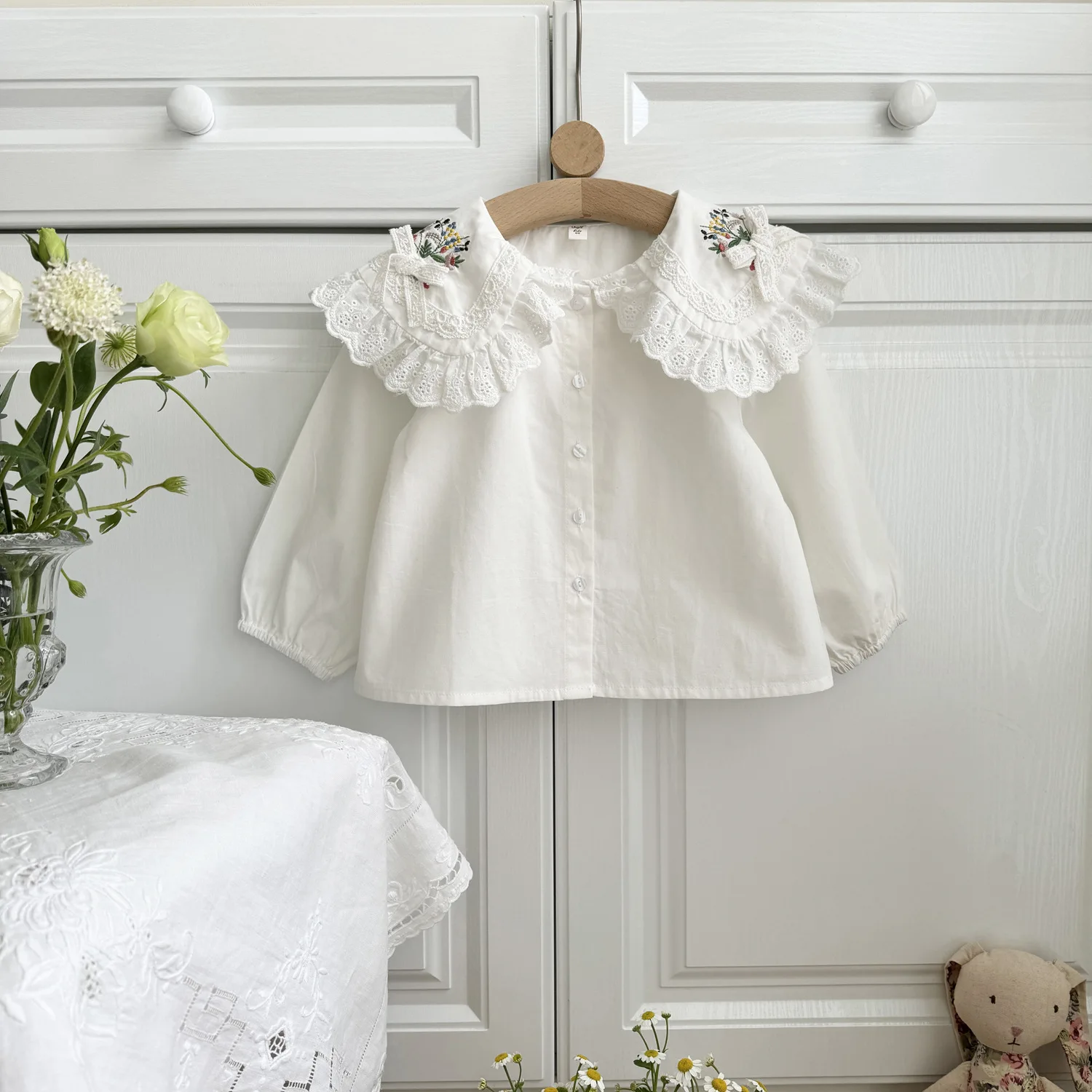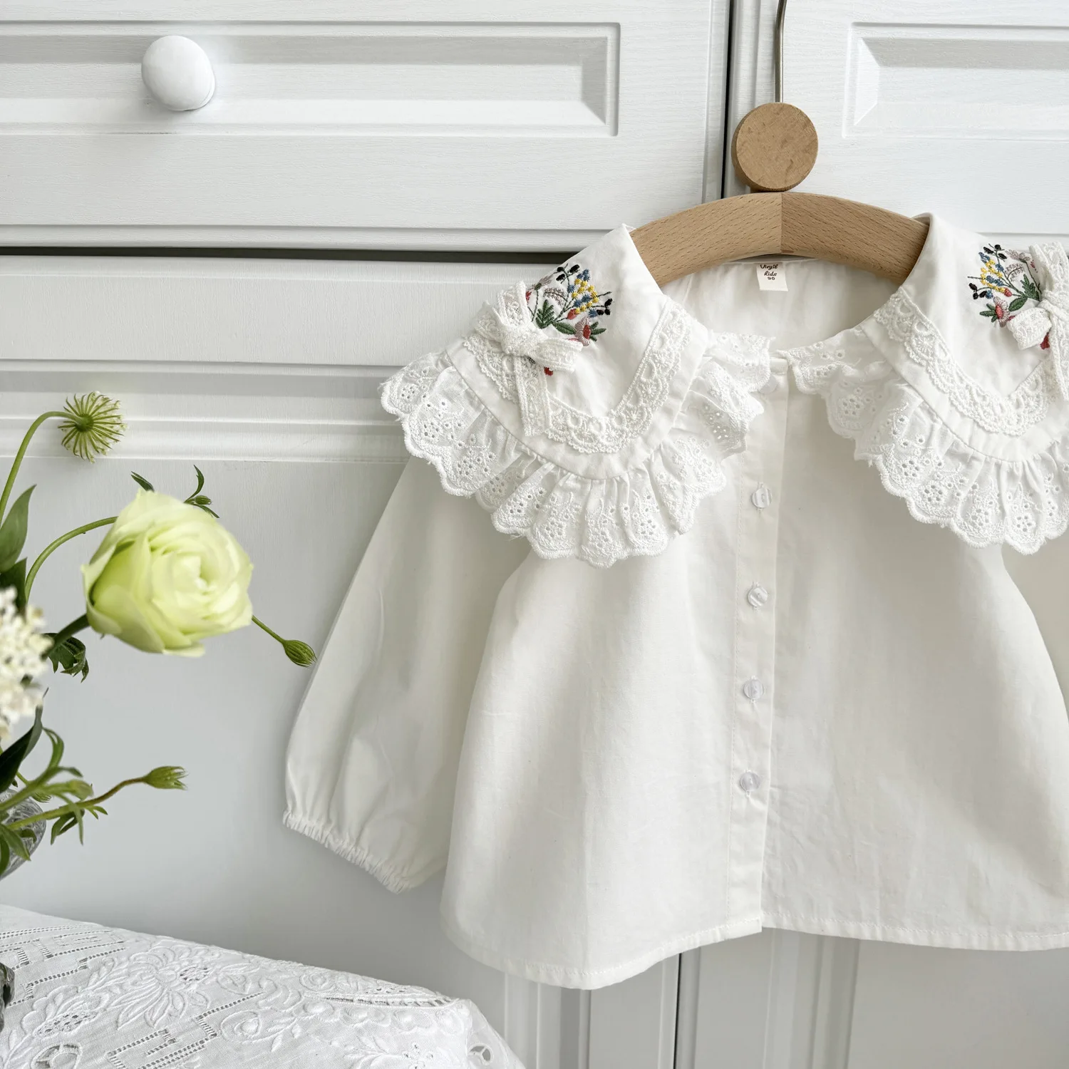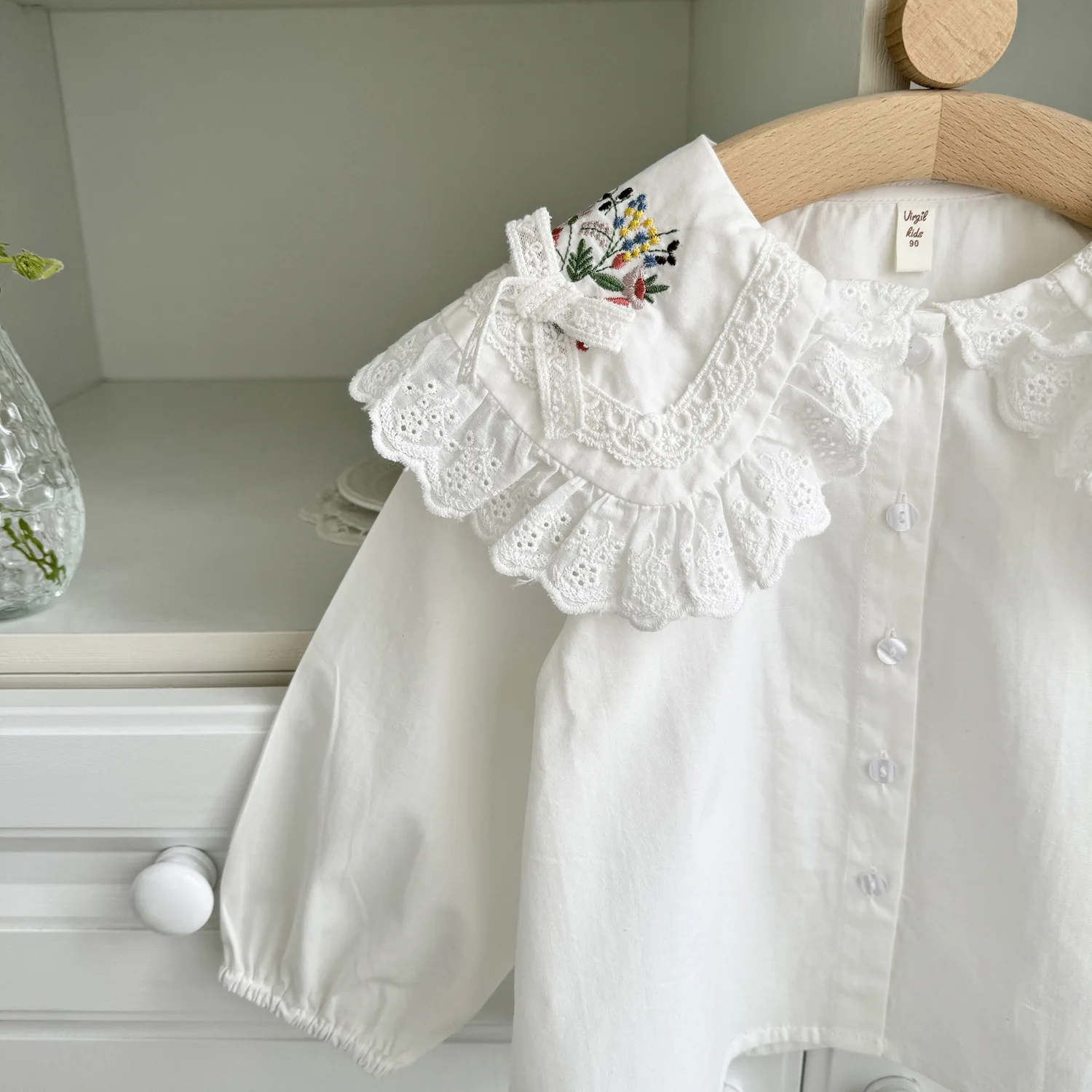 #kids fashion #tops #long sleeve blouse #lace collar #flower embroidery #ribbon accent