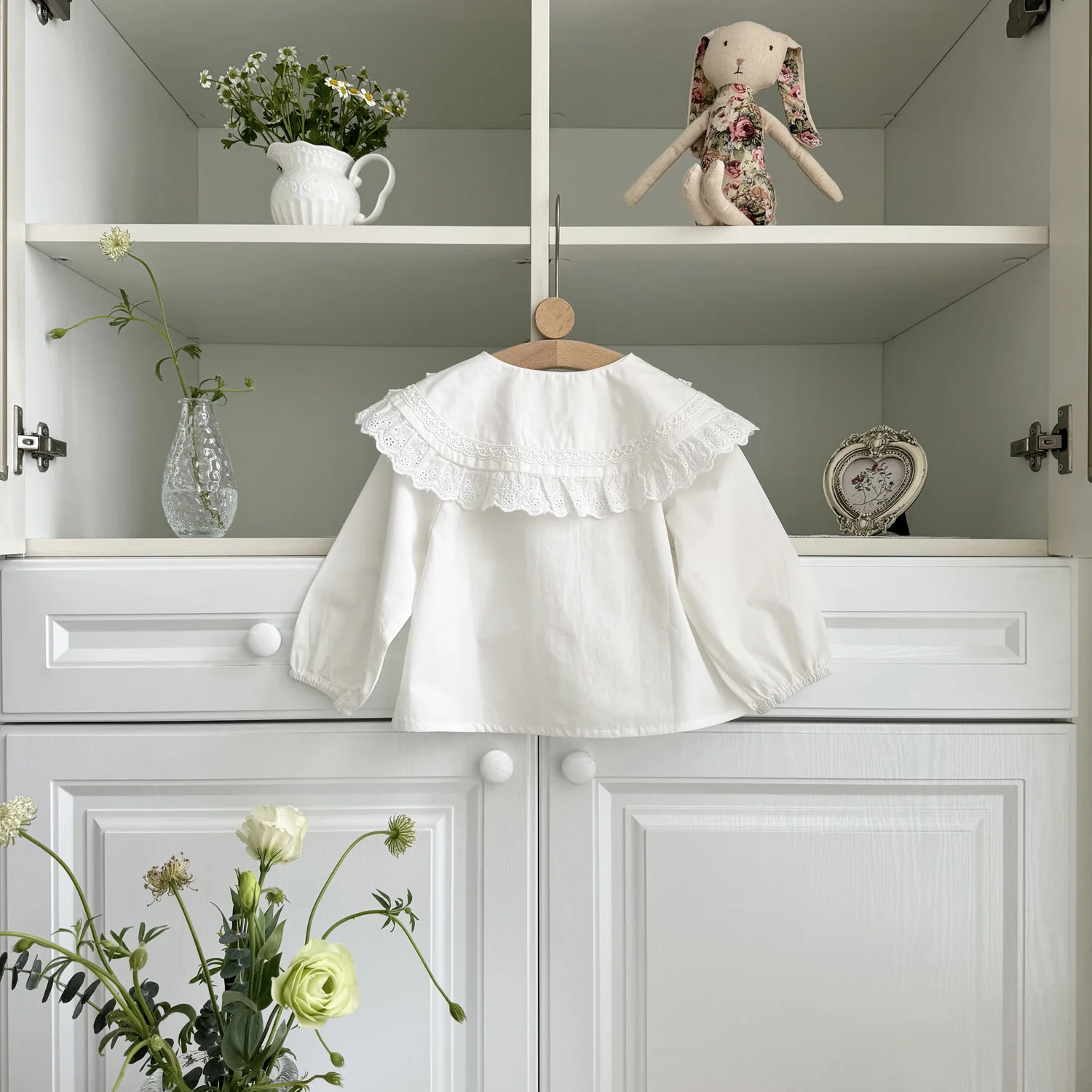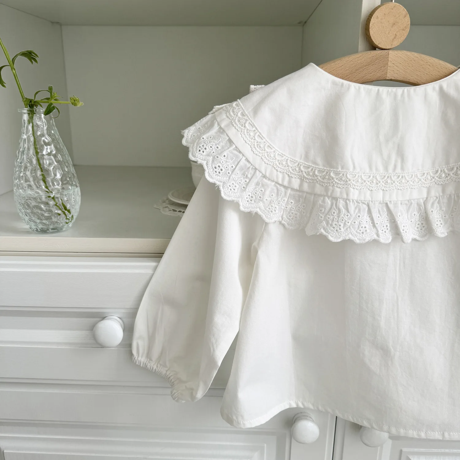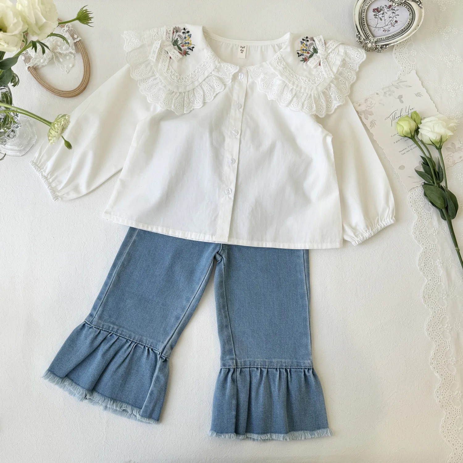 #kids fashion #tops #long sleeve blouse #lace collar #flower embroidery #ribbon accent