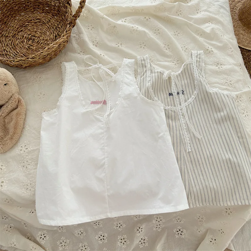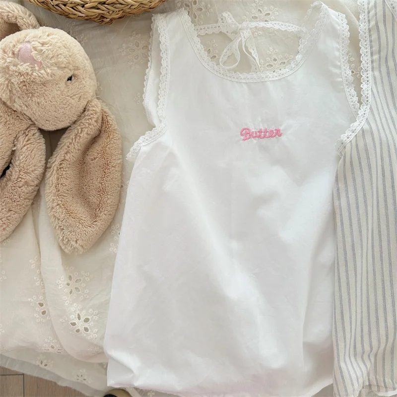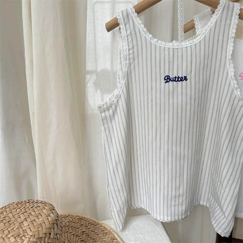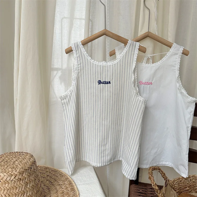 Introducing a kids' dress perfect for summer. This sleeveless overdress with lace embroidery will wrap your child in a cool and comfortable fit. Choose from two types: solid and striped. The casual yet elegant design is suitable for a variety of occasions.