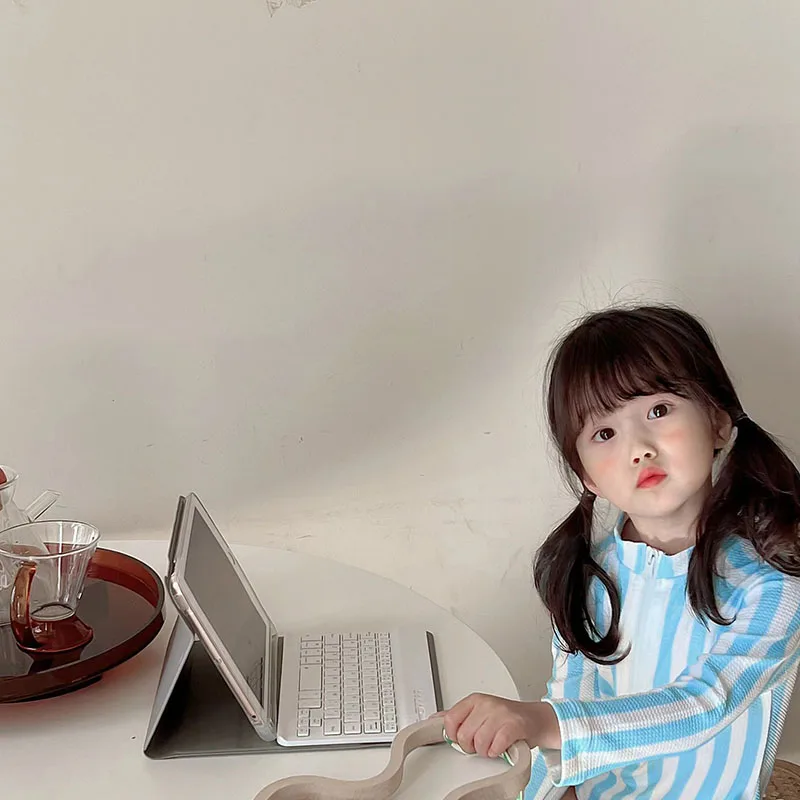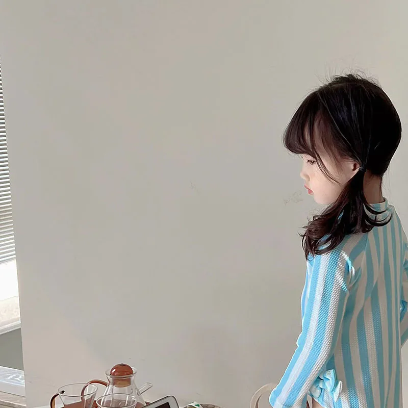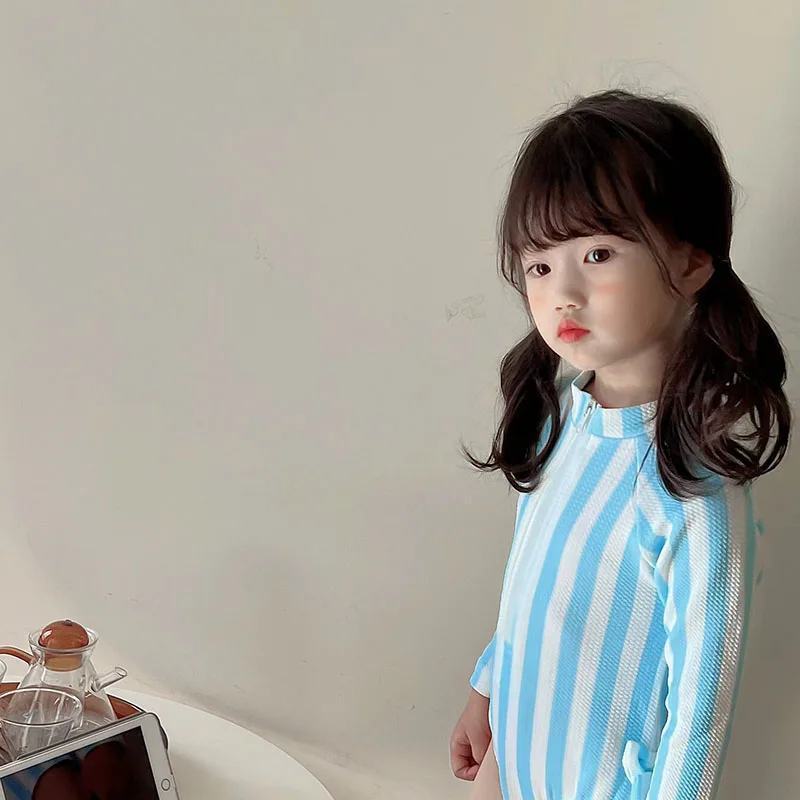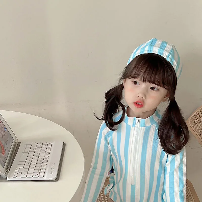 Kids long sleeve one piece swimsuit striped rashguard swimwear hat set [mh0001521]