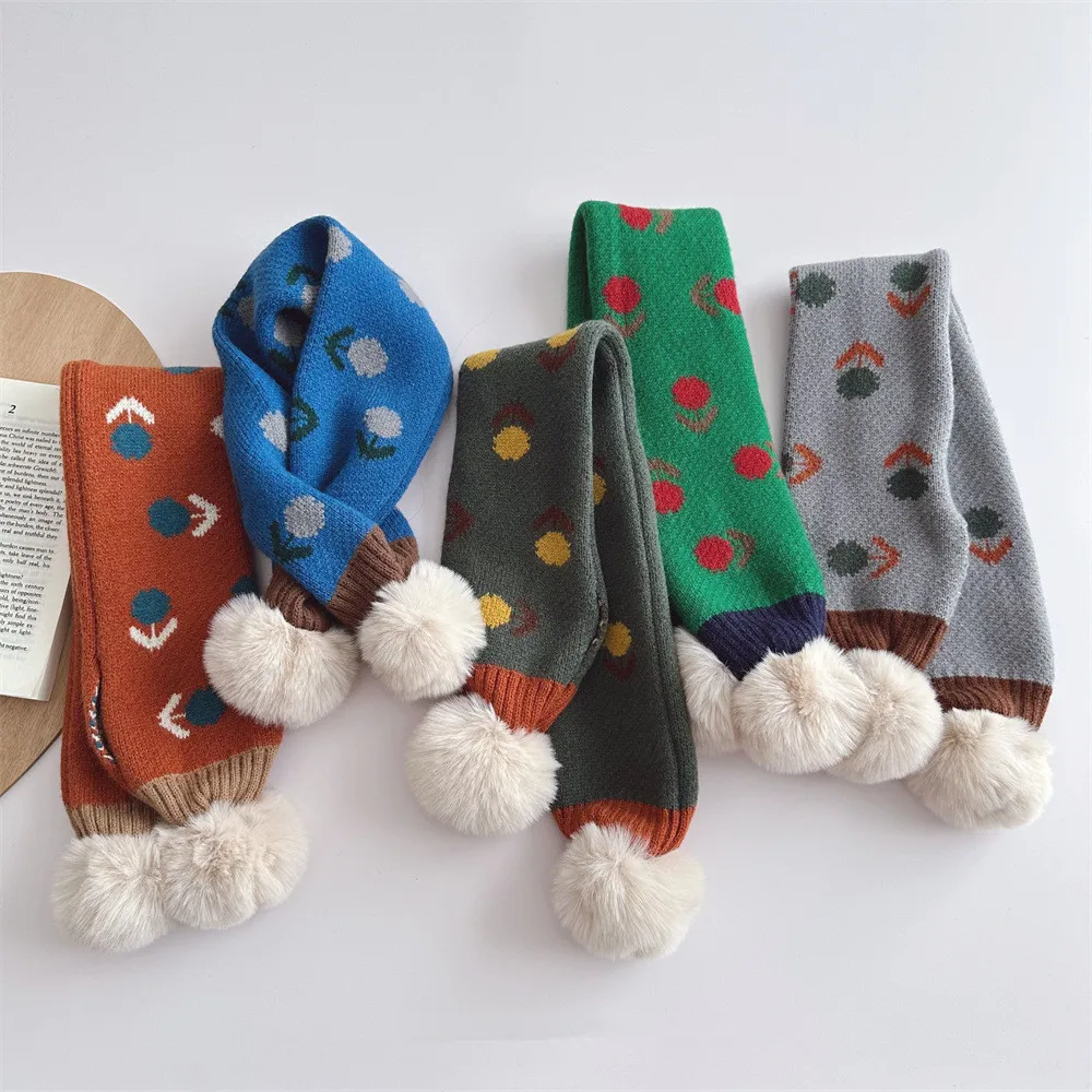 Kids' scarf, neck warmer with pompoms, flower pattern, girls, children's clothing [mh0003327]