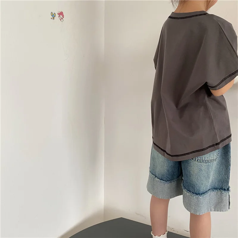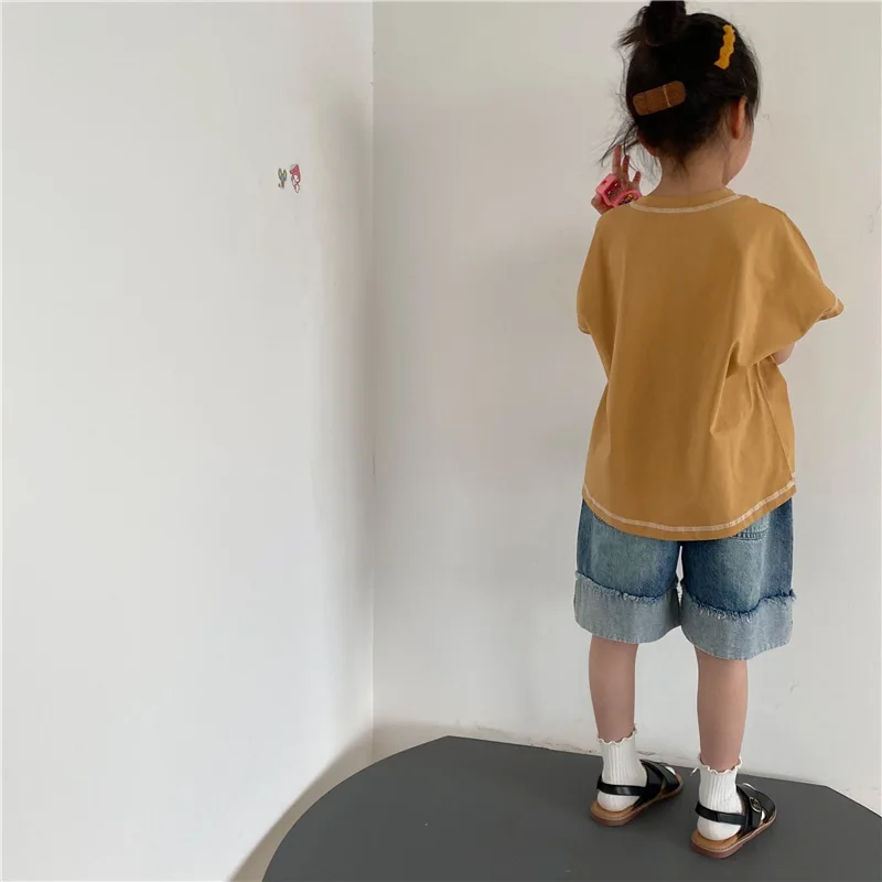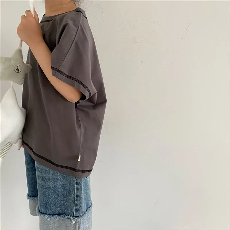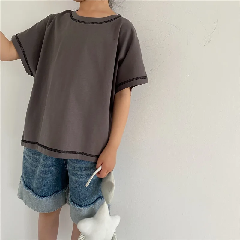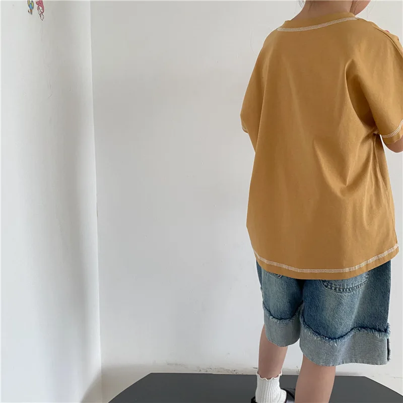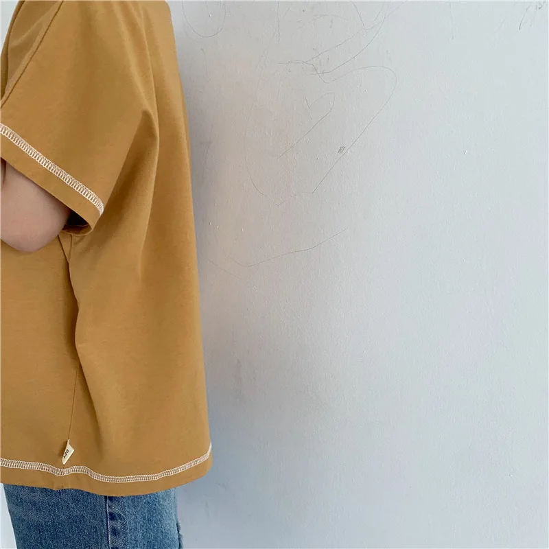 Introducing our new summer kids tops. This loose short-sleeved T-shirt features a comfortable fit and simple design. The accent stitching gives it a subtle personality and fits into your child's daily life. Available in three colors: beige, brown yellow, and gray. This item will naturally blend in with your child's outfit and can be easily coordinated.