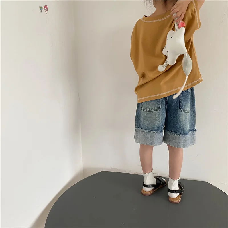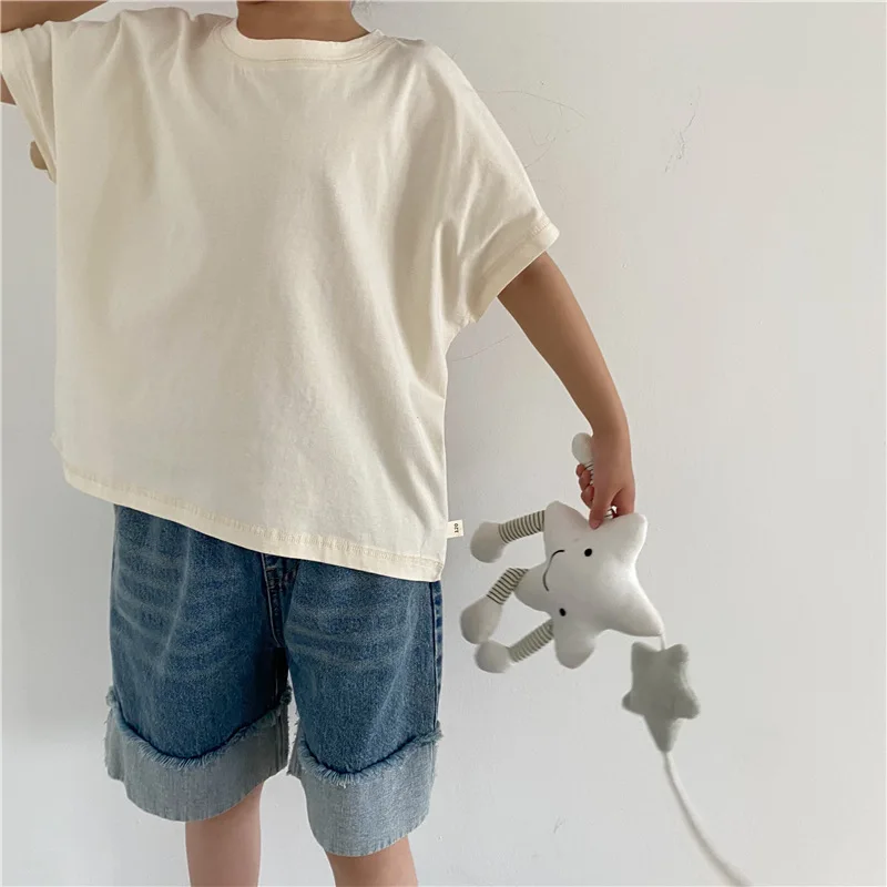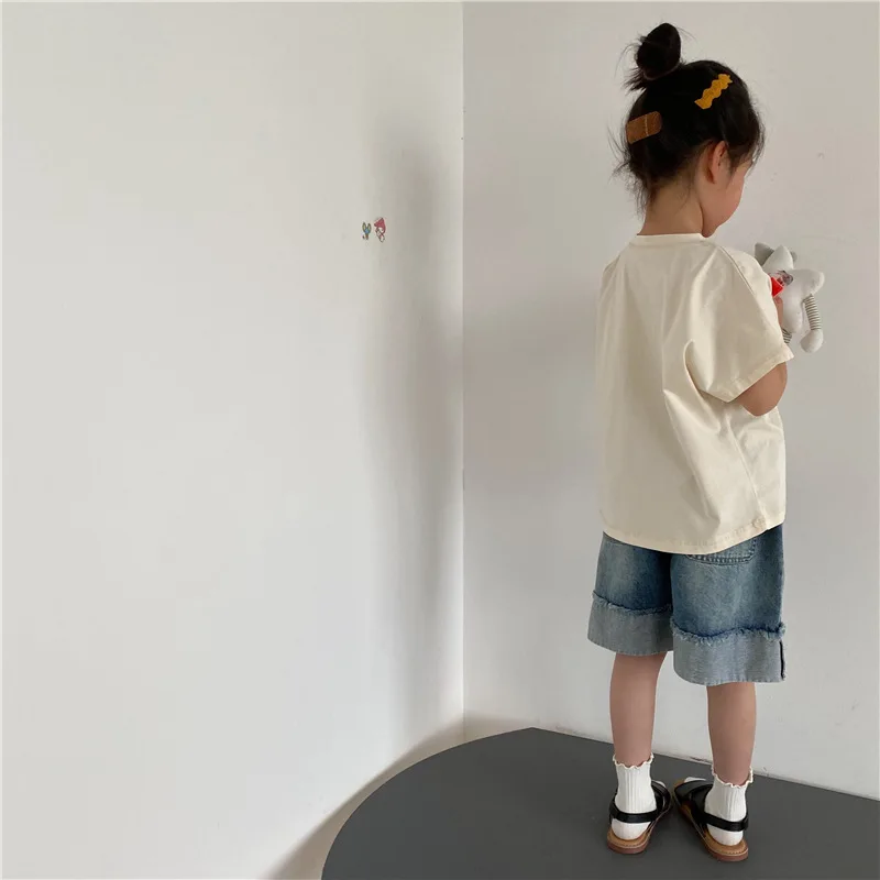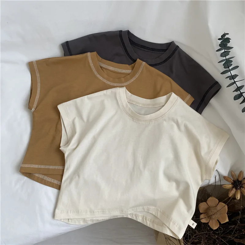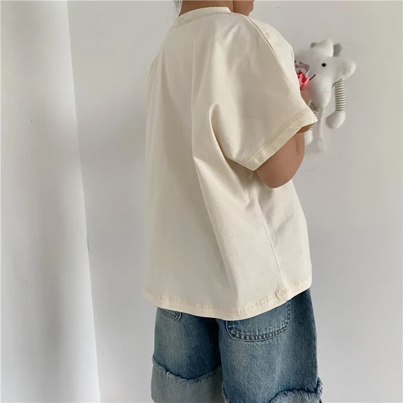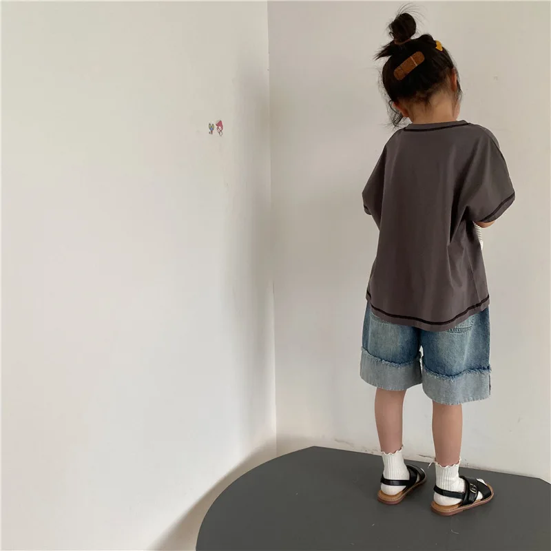Introducing our new summer kids tops. This loose short-sleeved T-shirt features a comfortable fit and simple design. The accent stitching gives it a subtle personality and fits into your child's daily life. Available in three colors: beige, brown yellow, and gray. This item will naturally blend in with your child's outfit and can be easily coordinated.
