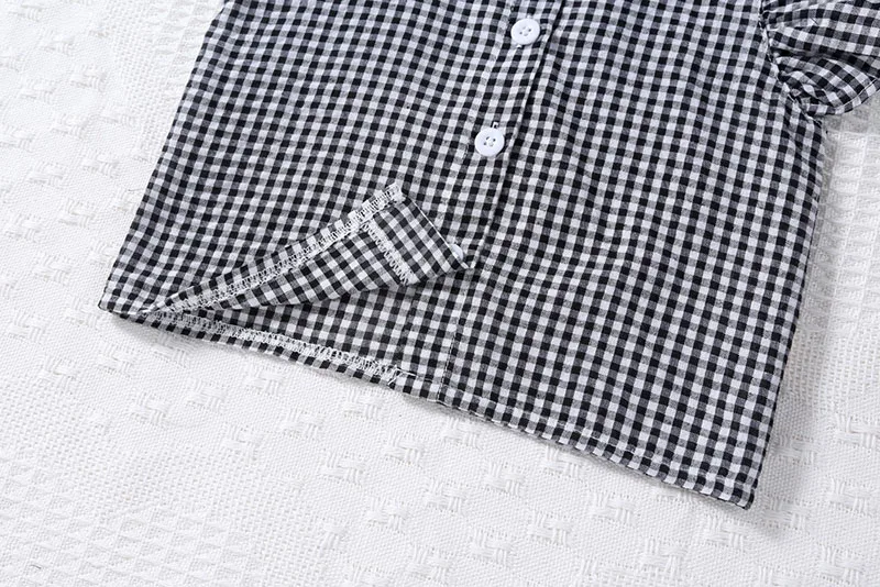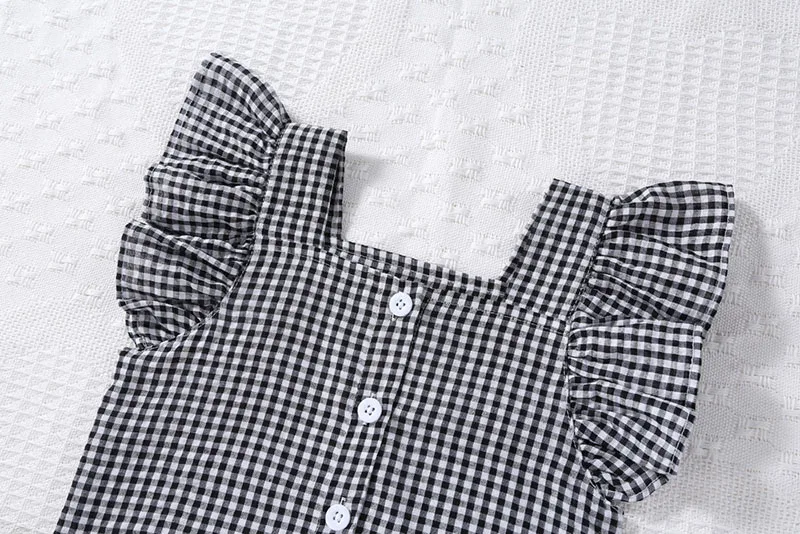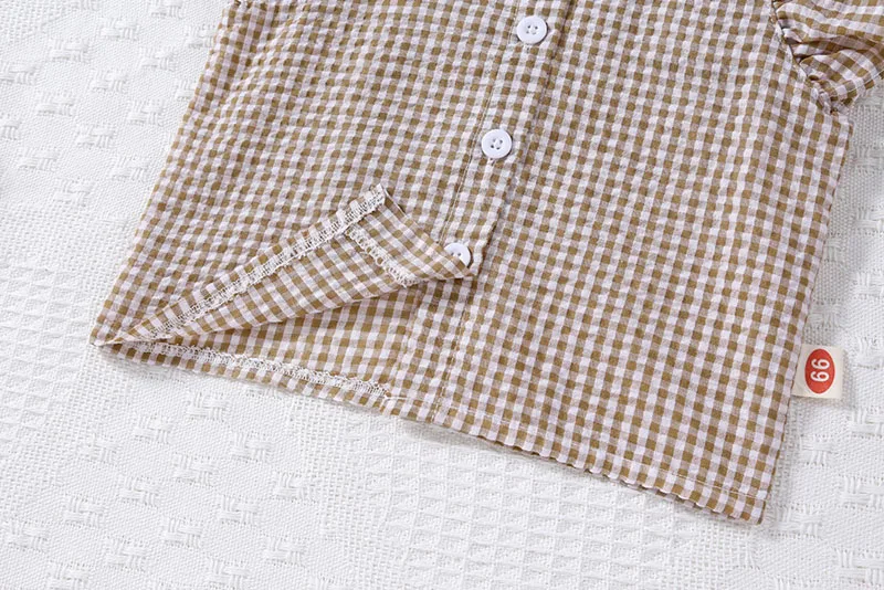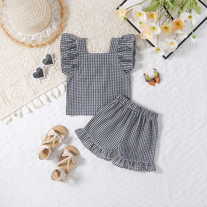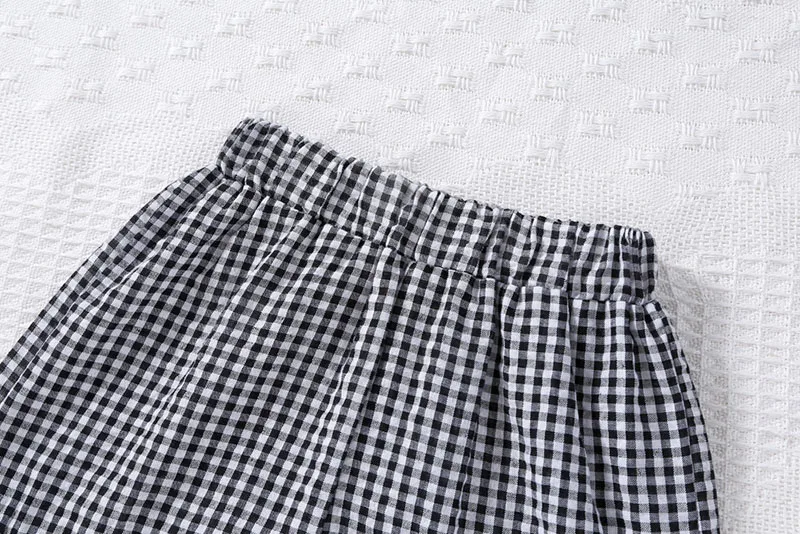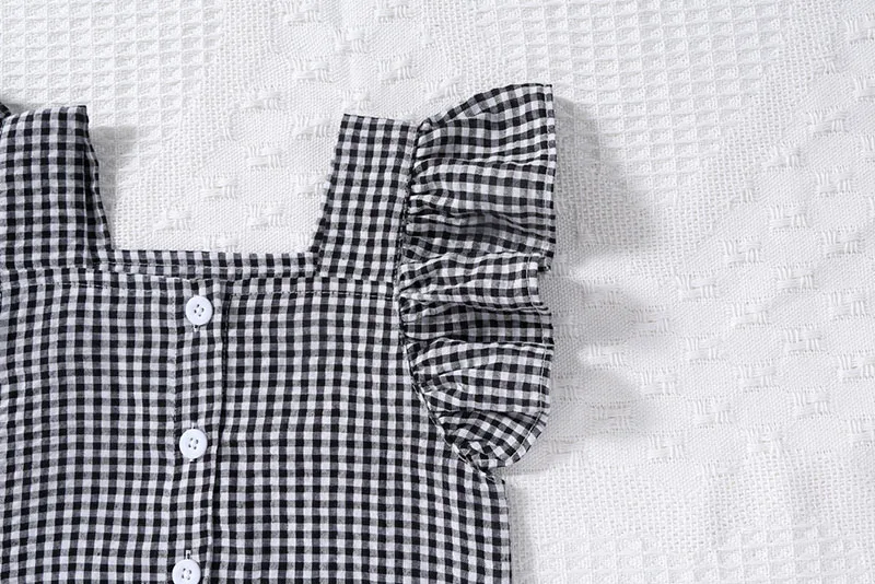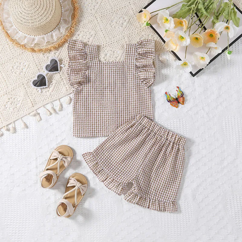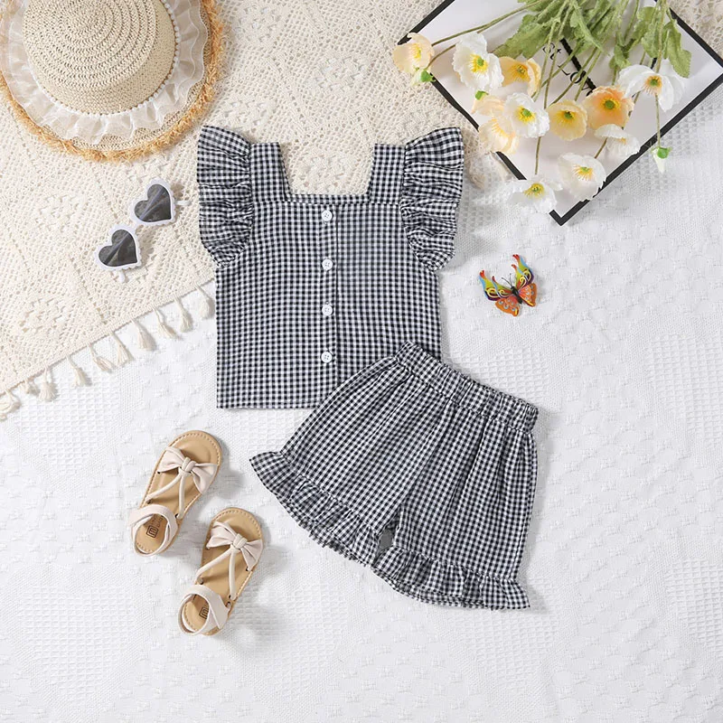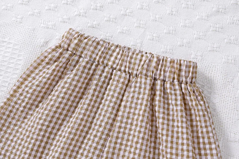 A two-piece set with a cute check pattern. The frill sleeve blouse and shorts create a girly style. The loose fit is perfect for summer, keeping your child comfortable. Recommended for those looking for a stylish set for children.