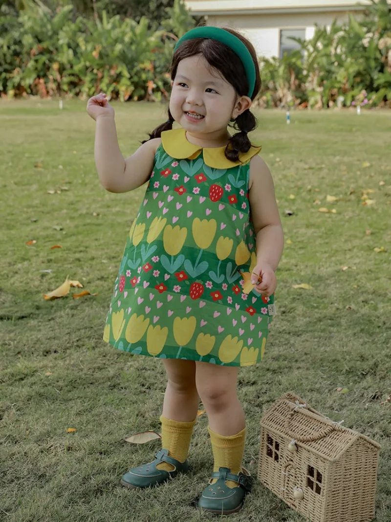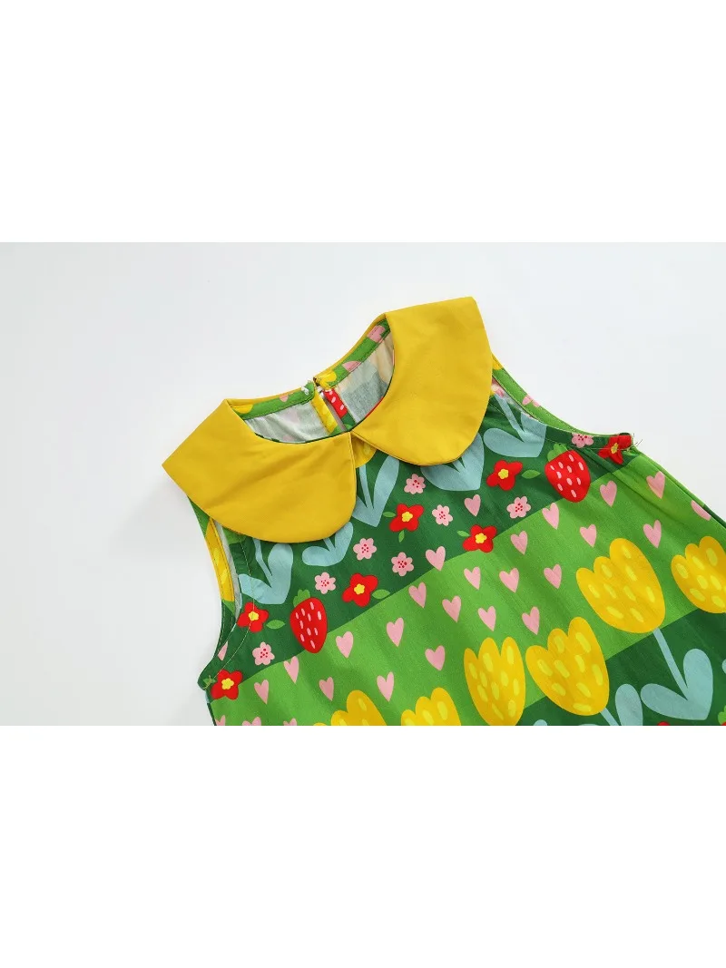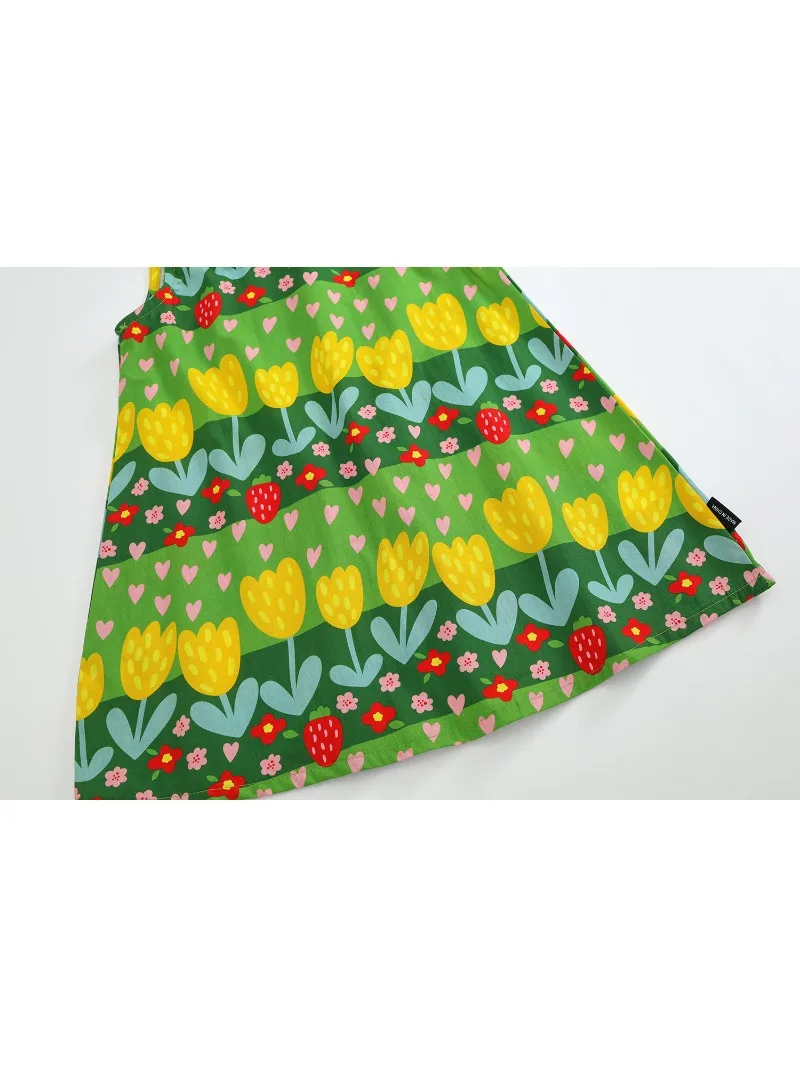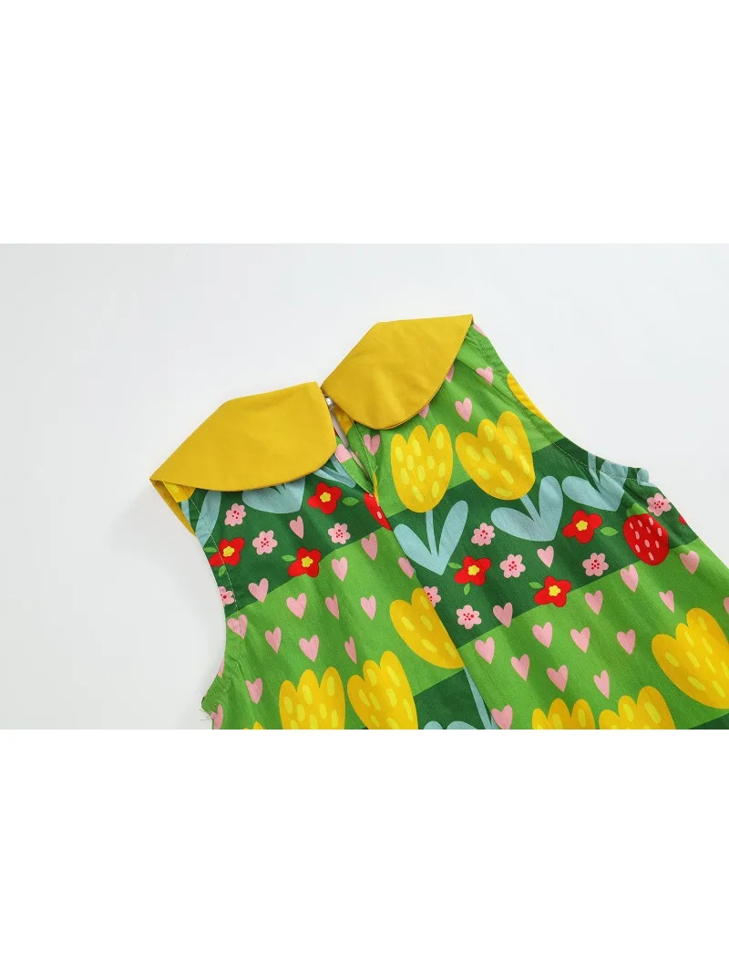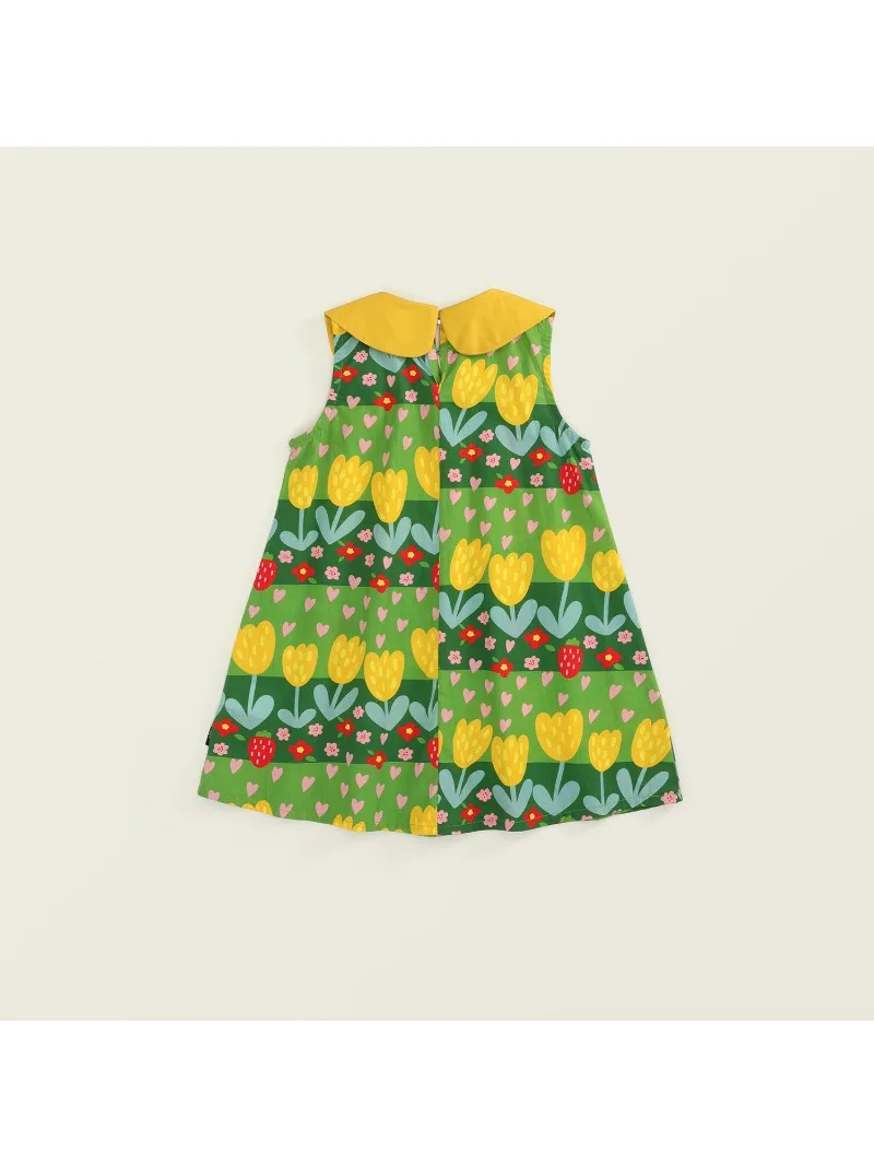 This kids' dress features a cute, eye-catching green retro floral print. Perfect for summer fashion, this sleeveless dress is recommended for everyday wear or vacations. The round collar and tulip print will make you feel like a princess.