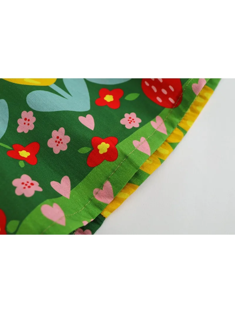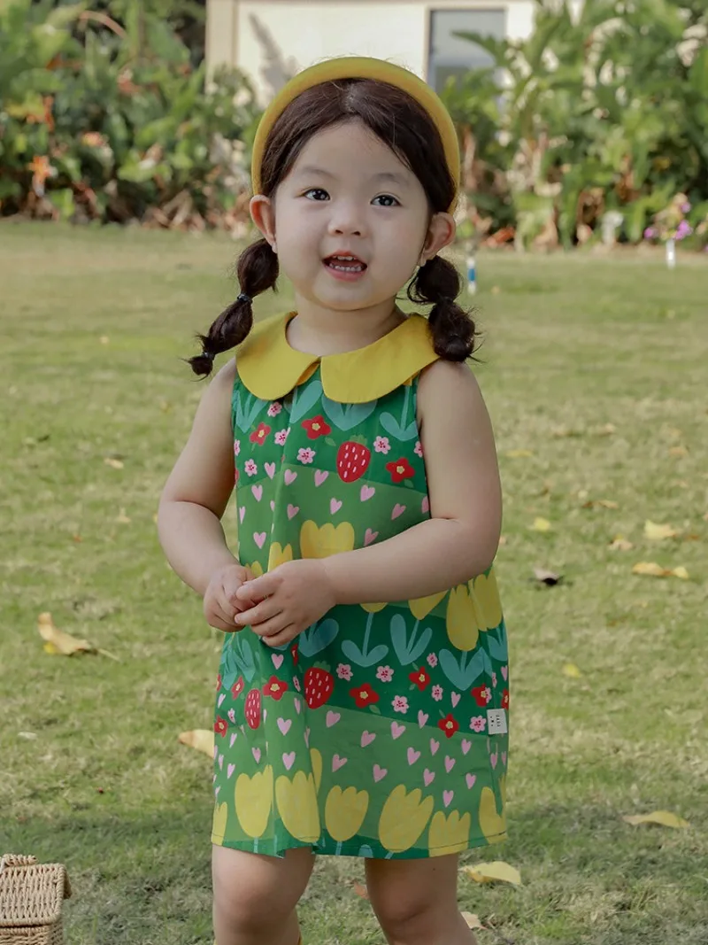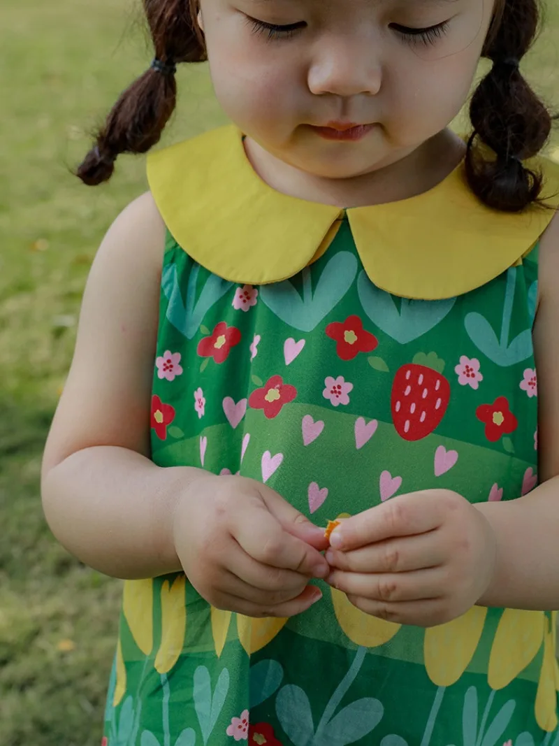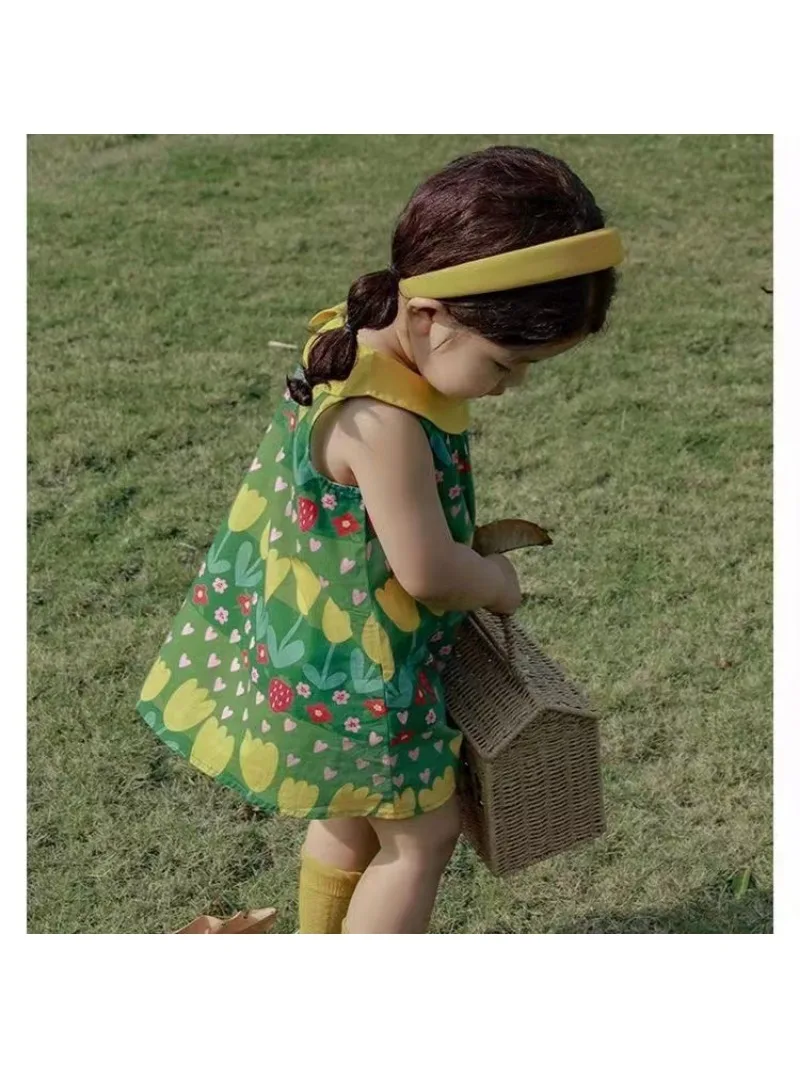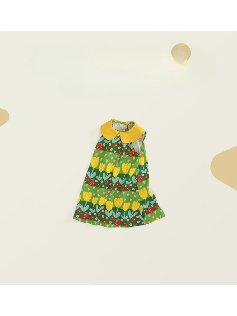 This kids' dress features a cute, eye-catching green retro floral print. Perfect for summer fashion, this sleeveless dress is recommended for everyday wear or vacations. The round collar and tulip print will make you feel like a princess.