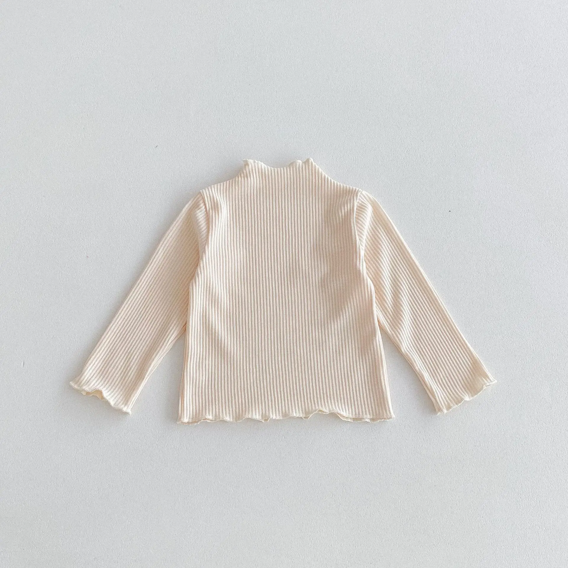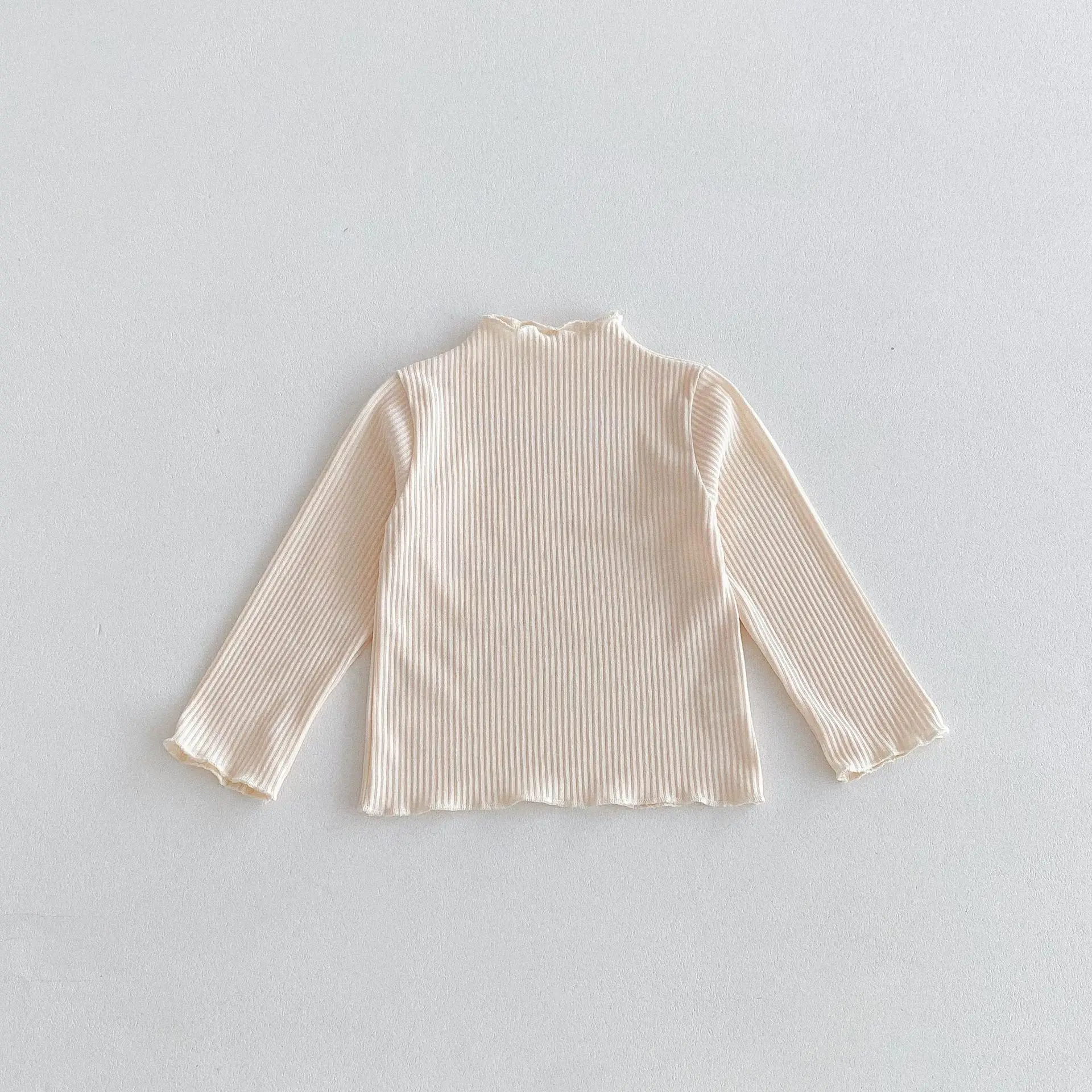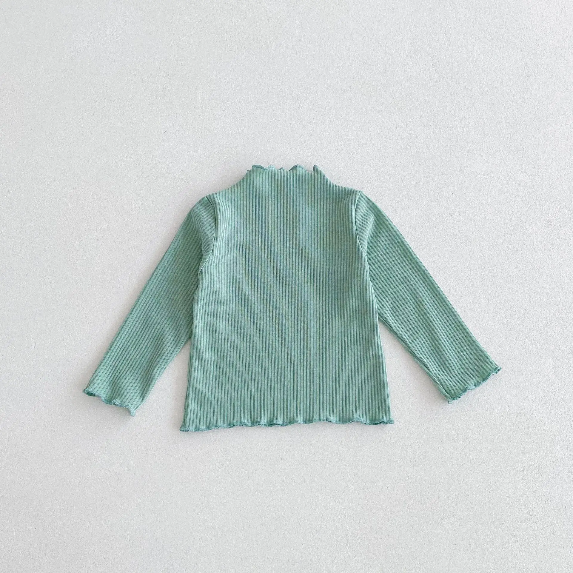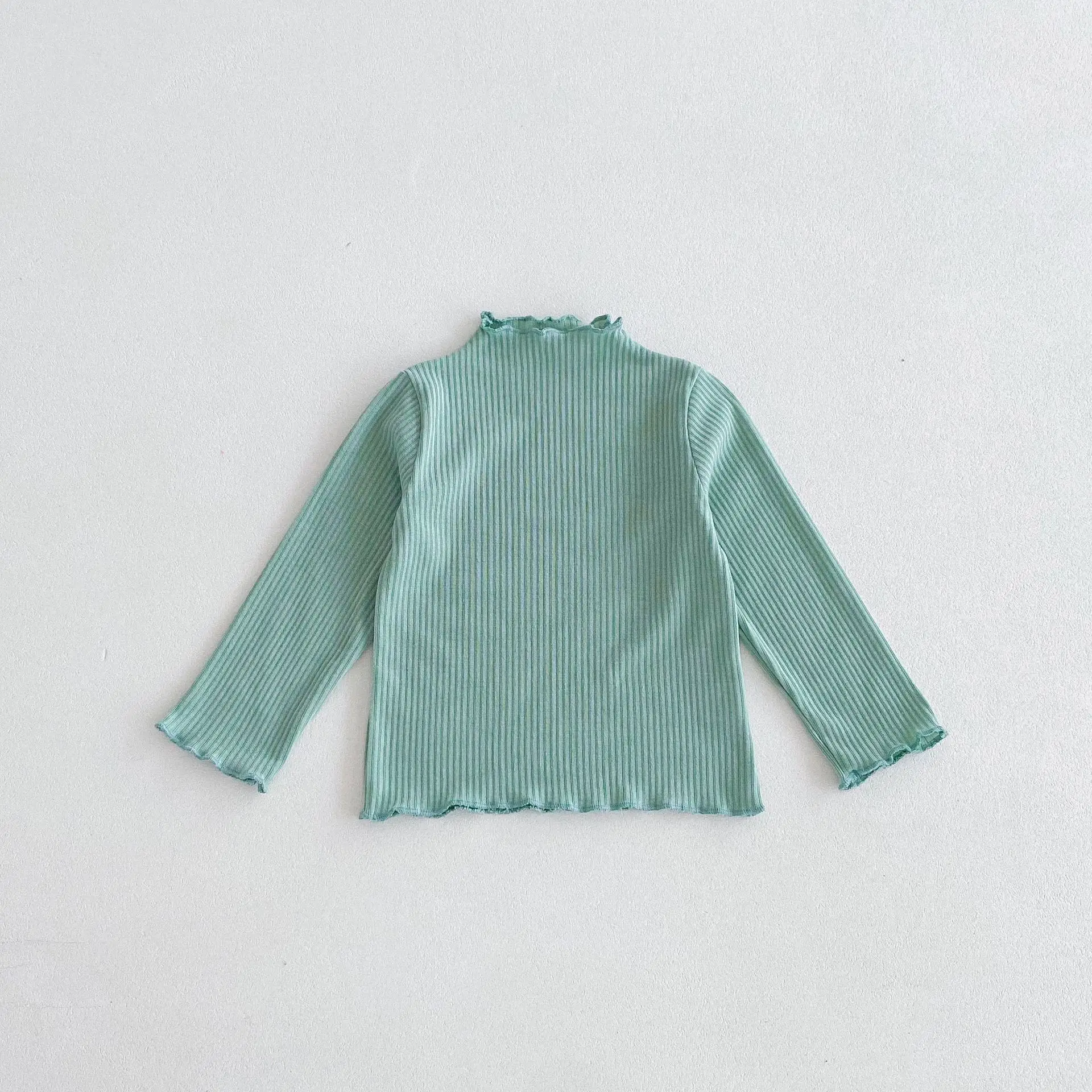 This kids top is a long-sleeved T-shirt with a frilled high neck or a bottle neck that is available in four colors. This baby shirt is perfect for autumn and is made of cotton material, so it is comfortable to wear. The casual and simple design makes it easy to match with various styles, helping you choose your child's clothes.